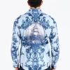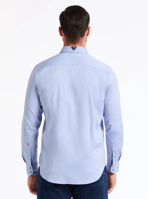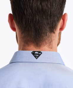 - Superman collage print at collar, inside yoke, and cuff plackets