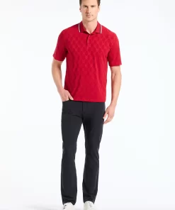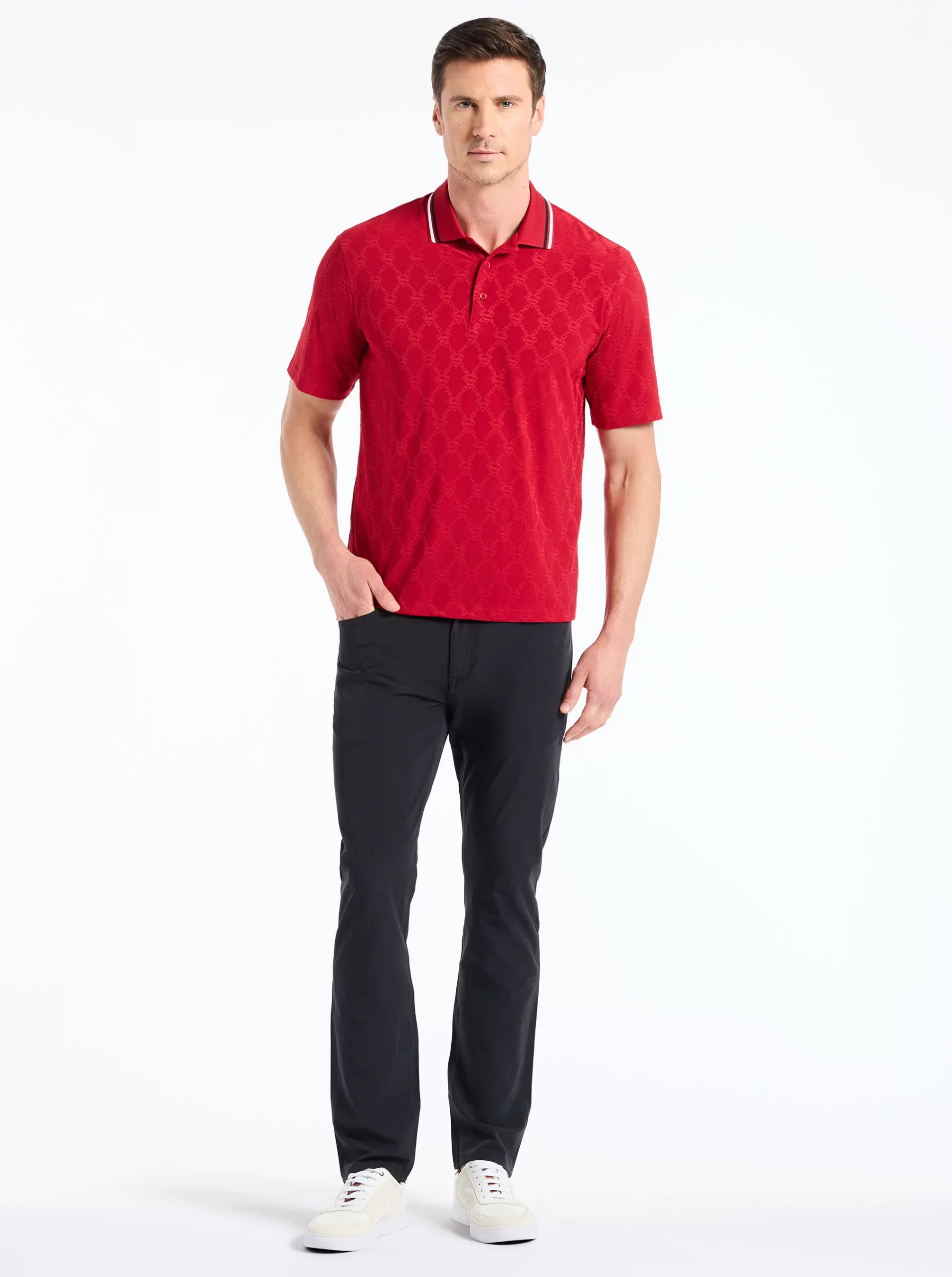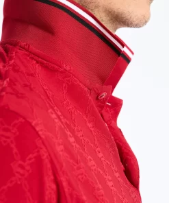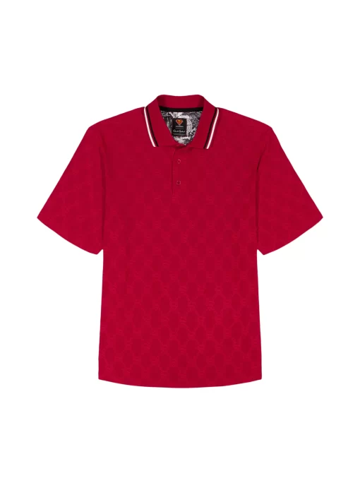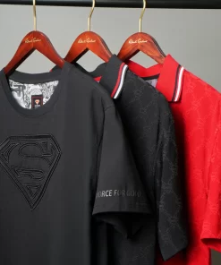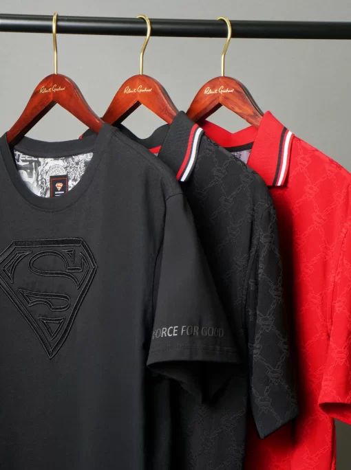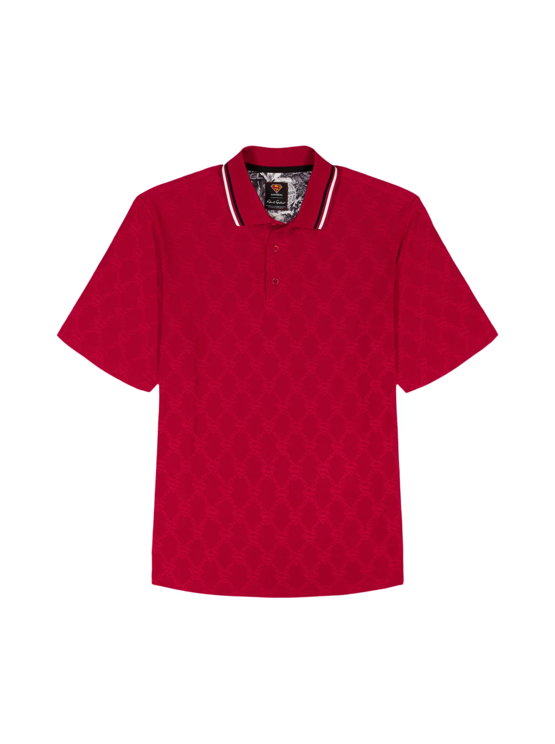 The Superman™ x Robert Graham collection brings together two icons—crafted for those who carry confidence like it’s a superpower. Exclusively limited. Individually hand numbered. This striking red knit polo captivates with its ingenious tonal pattern—what appears as a simple diamond grid reveals the Superman S-Shield cleverly integrated into the design. The coordinating red collar features sophisticated black and white tipping, while hidden treasures await inside with a black and white Superman collage print at the yoke and the exclusive Superman x Robert Graham logo patch. It’s heroic style, reimagined.