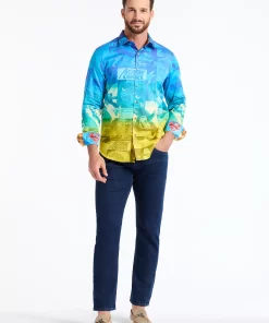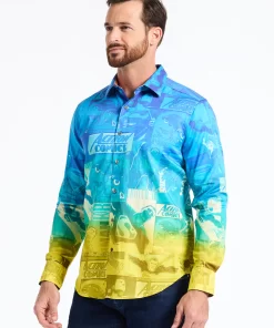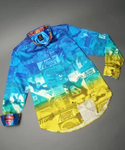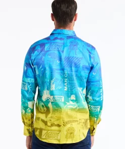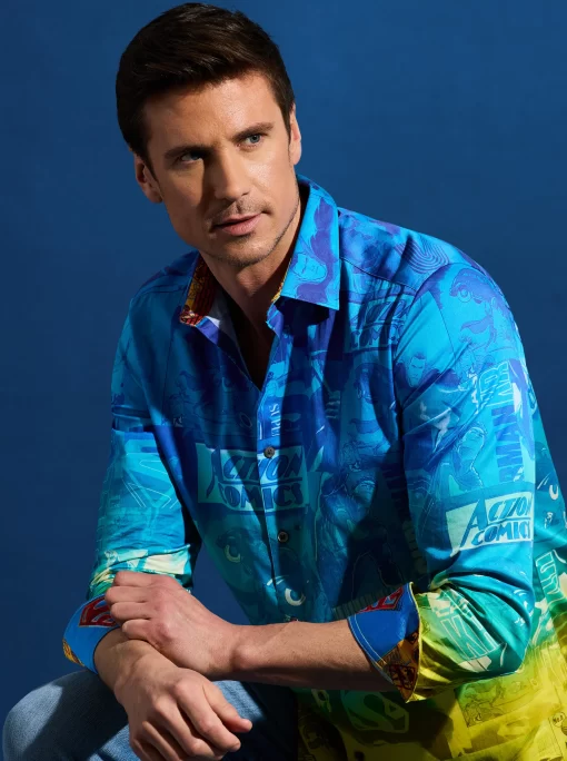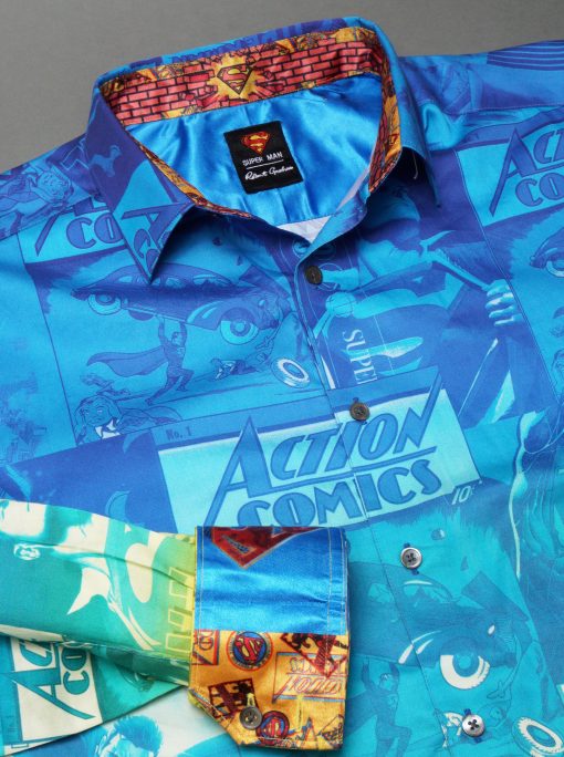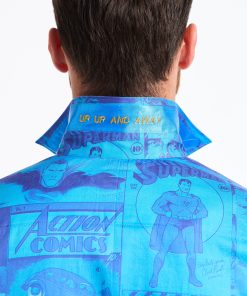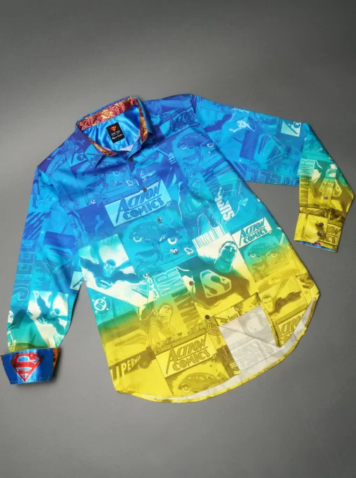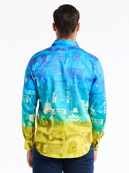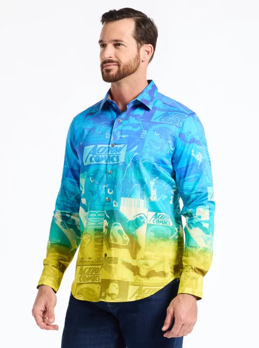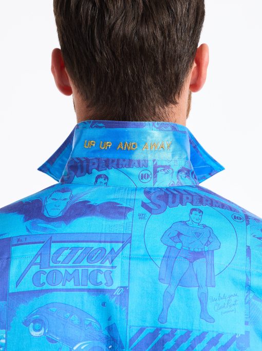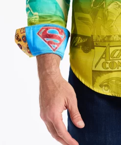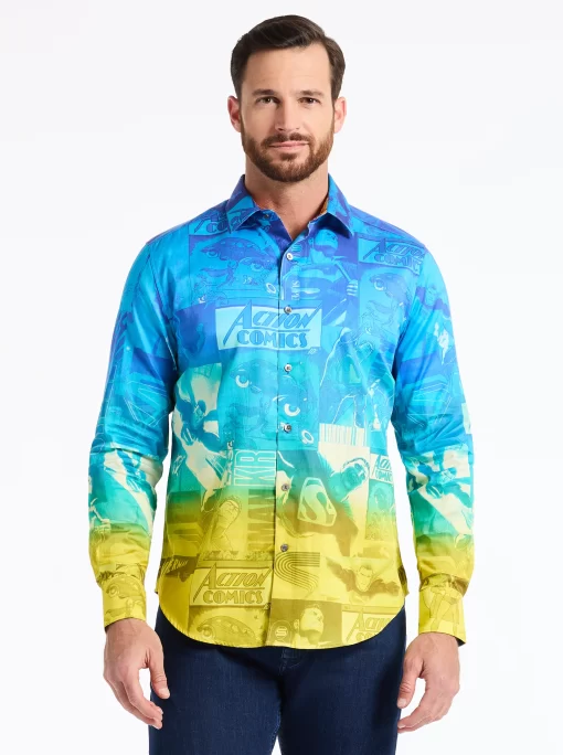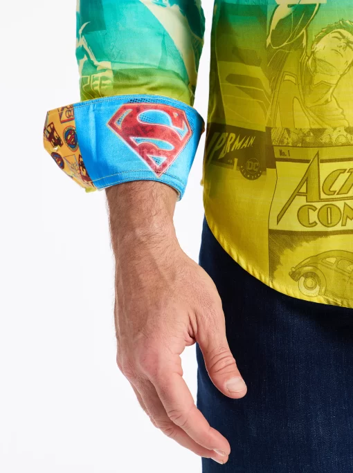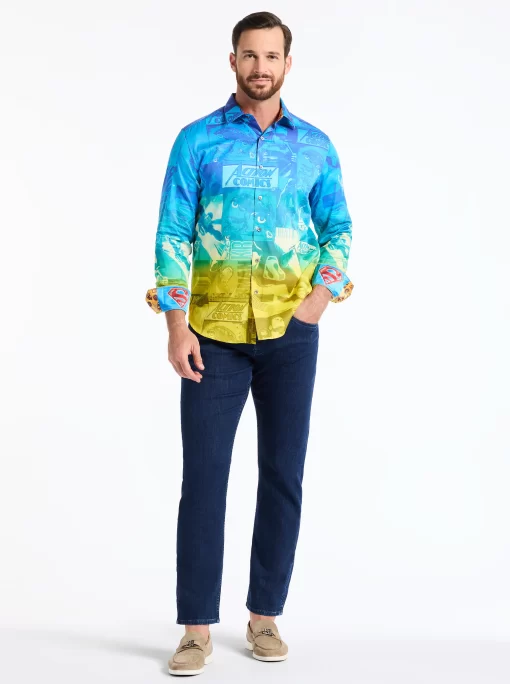 The Superman™ x Robert Graham collection brings together two icons—crafted for those who carry confidence like it’s a superpower. Exclusively limited. Individually hand numbered. This cotton sateen button down features a striking ombre background that showcases a dynamic collage of Superman comic imagery. Find hidden treasures like “UP UP AND AWAY” embroidered under the collar and the iconic logo embroidered at the inside cuff complemented by an engineered Superman-inspired print—blending bold superhero energy with sophisticated style.