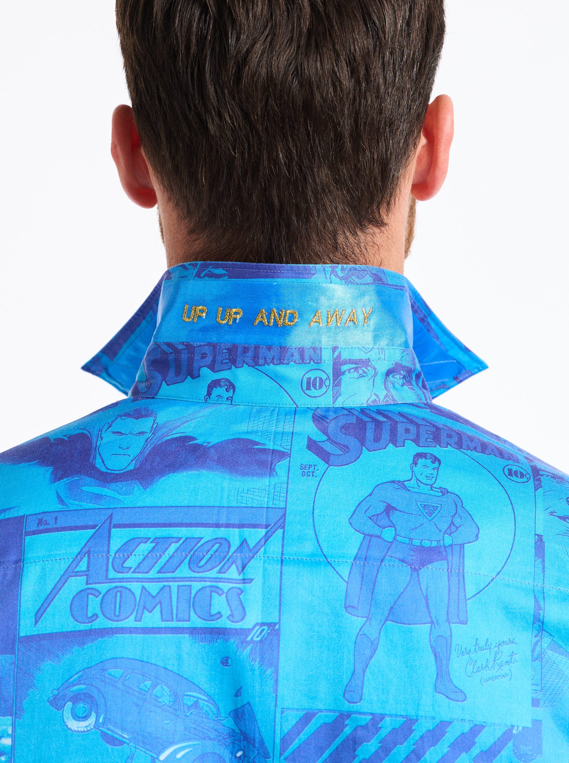 - “UP UP AND AWAY” embroidered under back collar