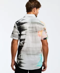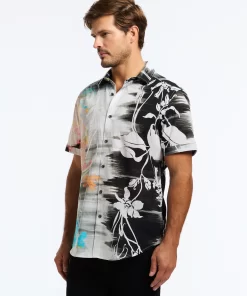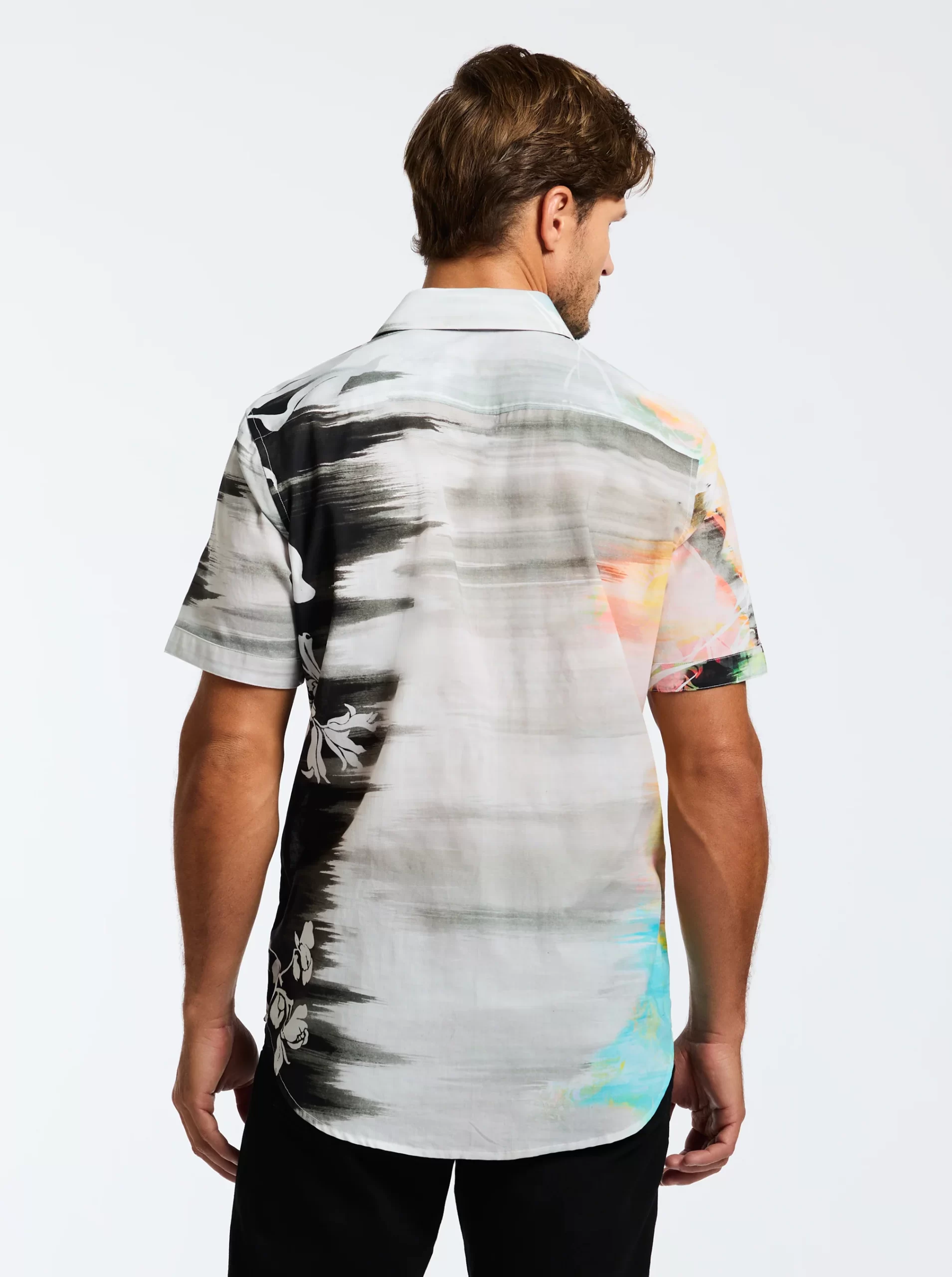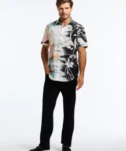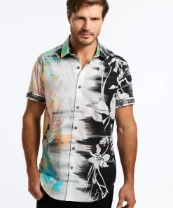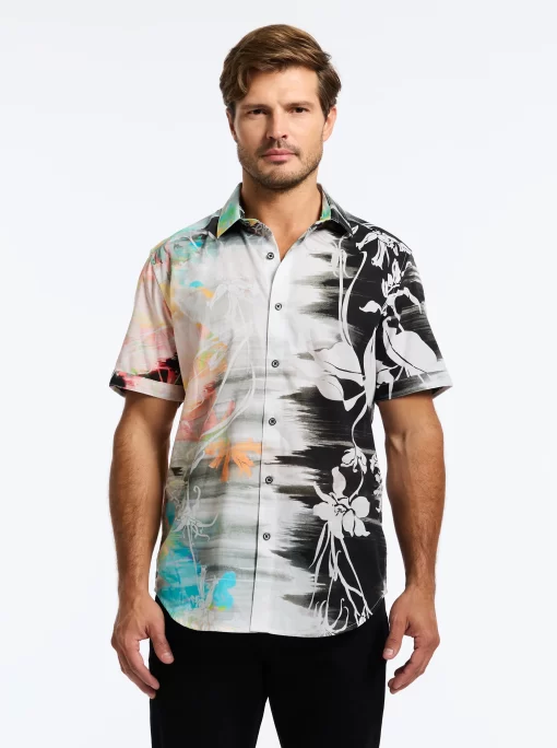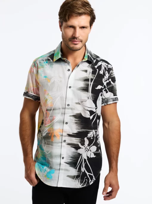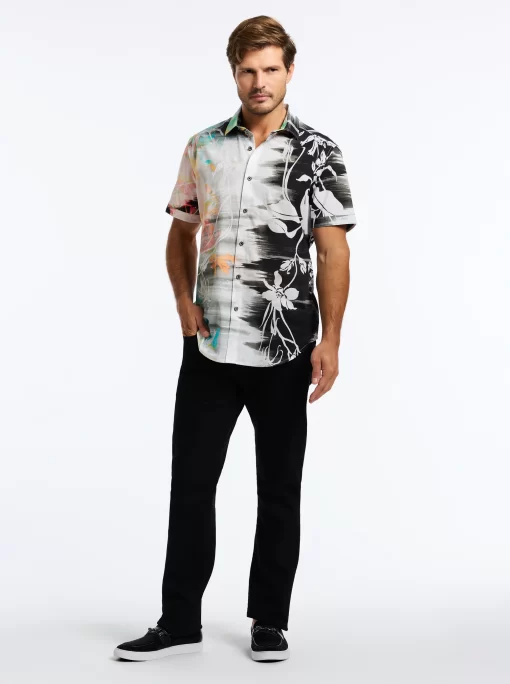 An artistic take on an ombre print highlights the contrast between neon and neutral black and white. Look closely and notice how the floral print fades into the multi-colored hues. You’ll love the feel of this lightweight style.