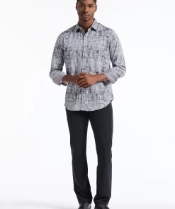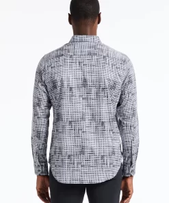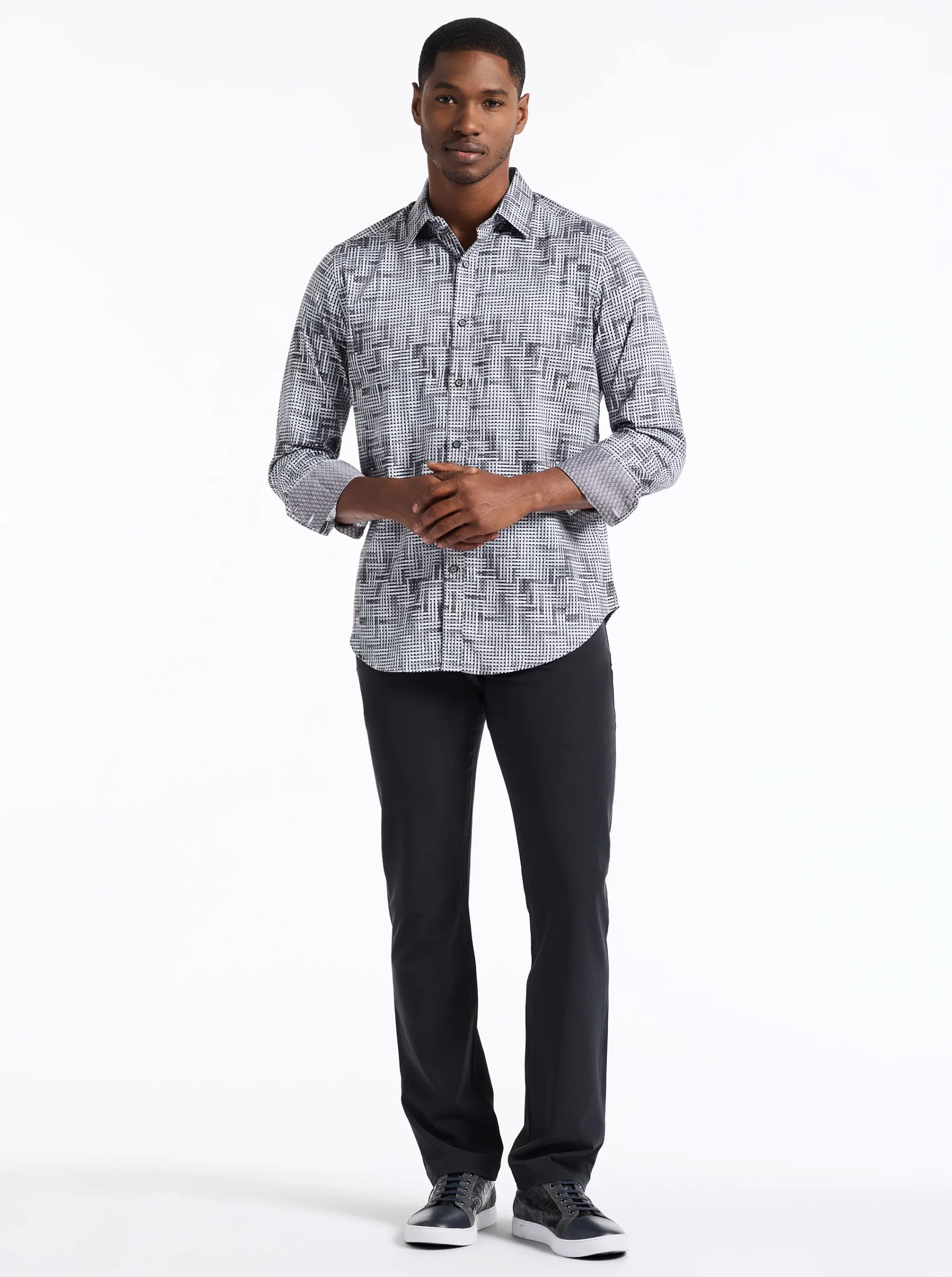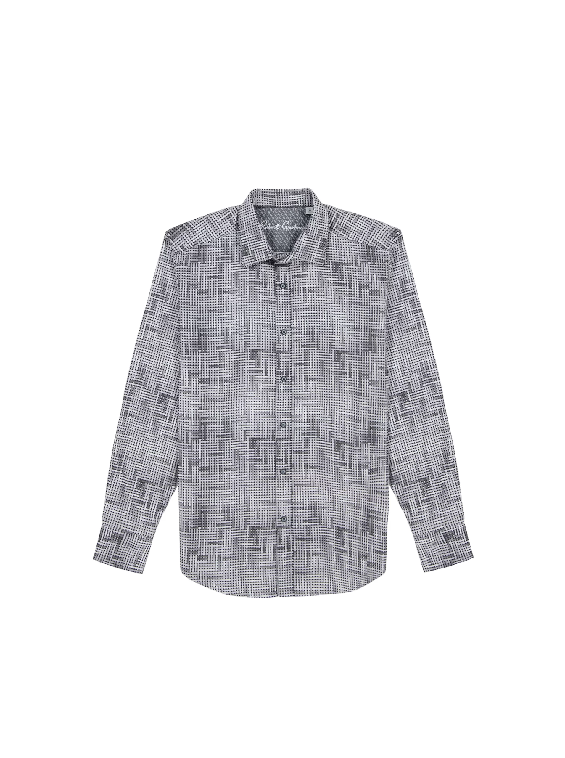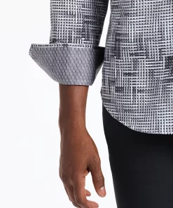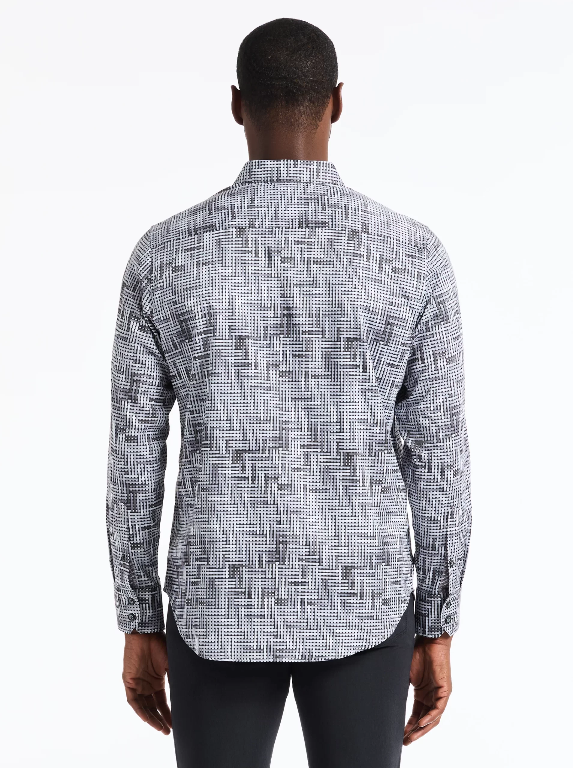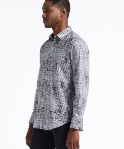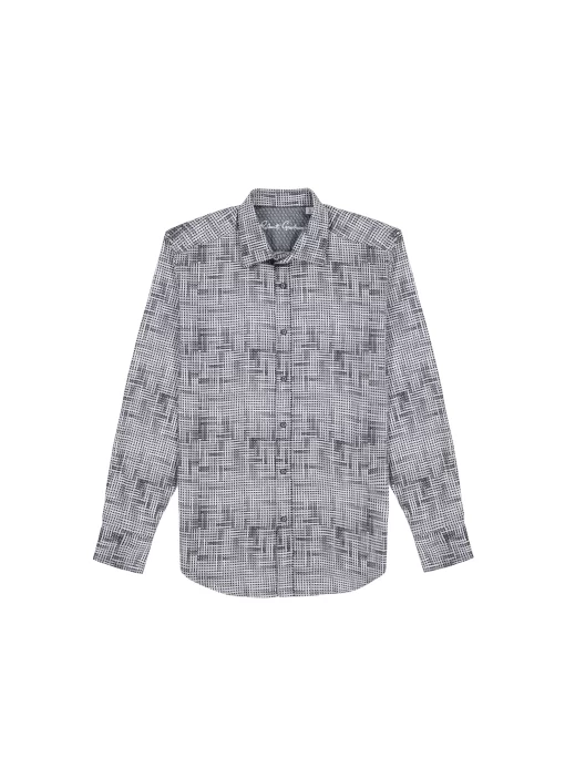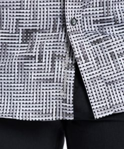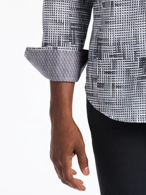This bold piece commands attention with its eye-catching design. The interwoven tiles create an abstract basket weave for a dynamic textured effect. A complementary contrast print at the collar and cuffs enhances the overall look, making this shirt a standout choice for any occasion.