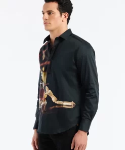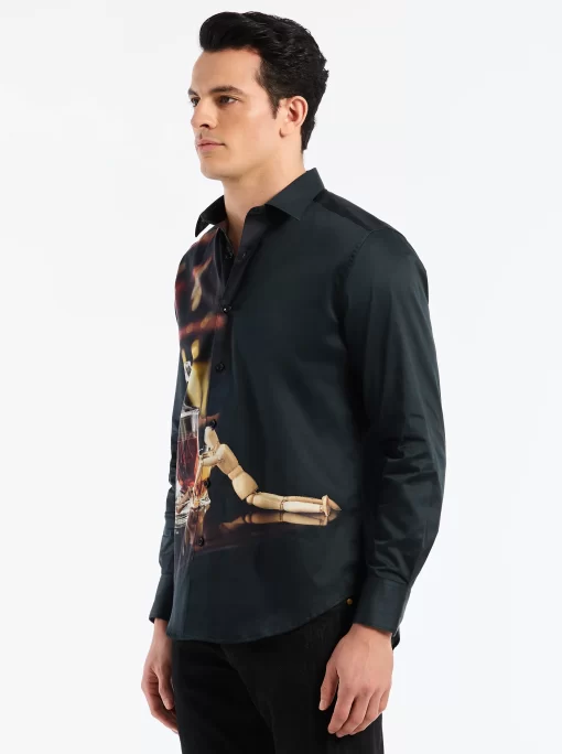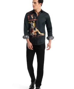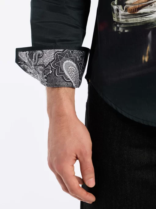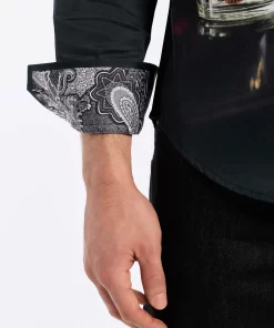 Gather your crew and let the night unfold in this RG drink shirt. The digital print of distilled spirits creates a moody visual of a fun night coming to an end, or one that’s just begun—you decide. Pop the collar or roll the cuffs for an elegant black and white paisley print for the perfect balance of bold style and sophisticated details.