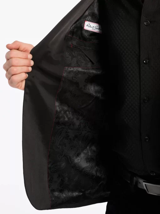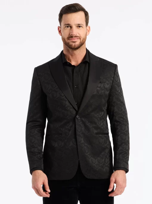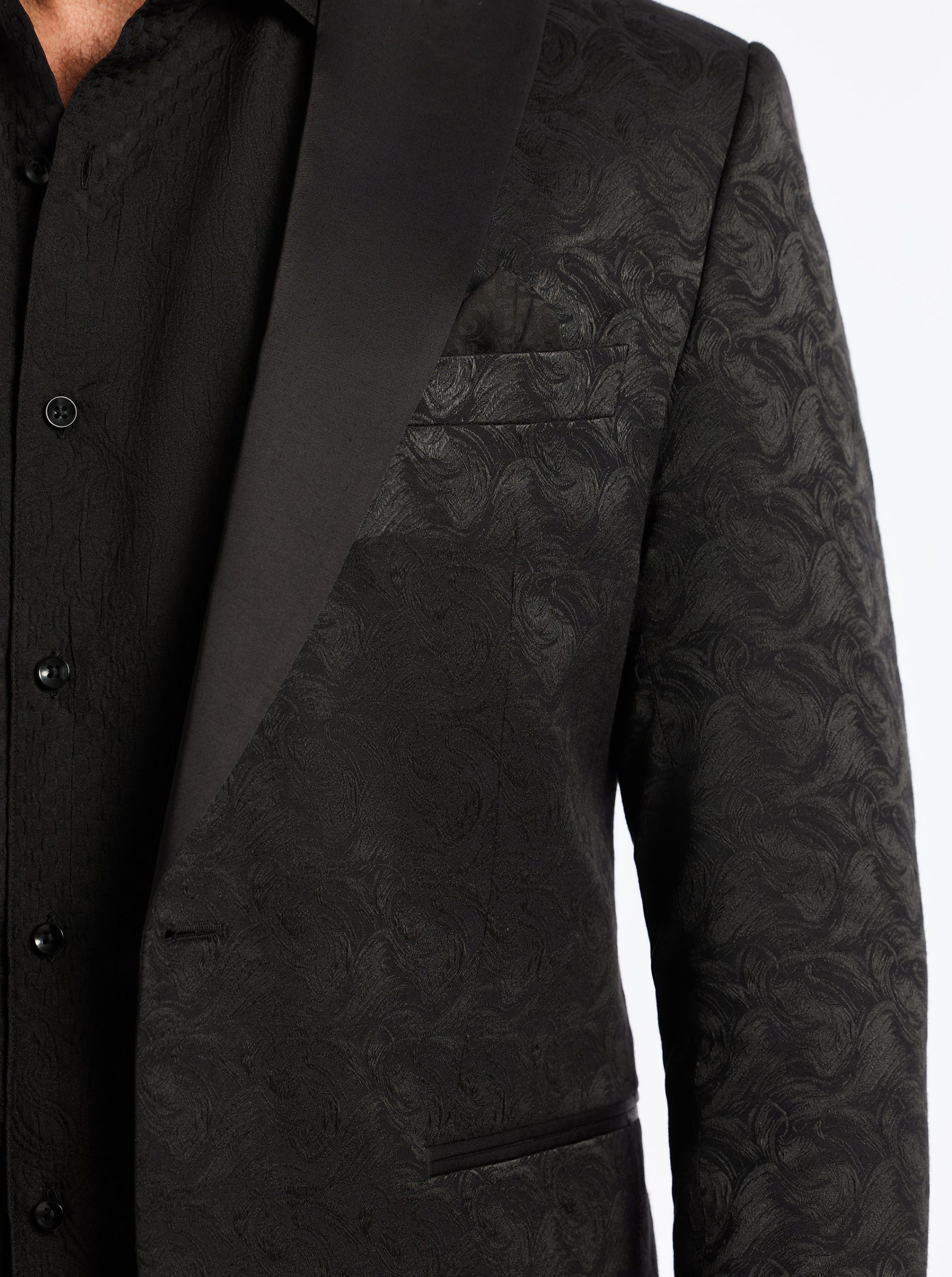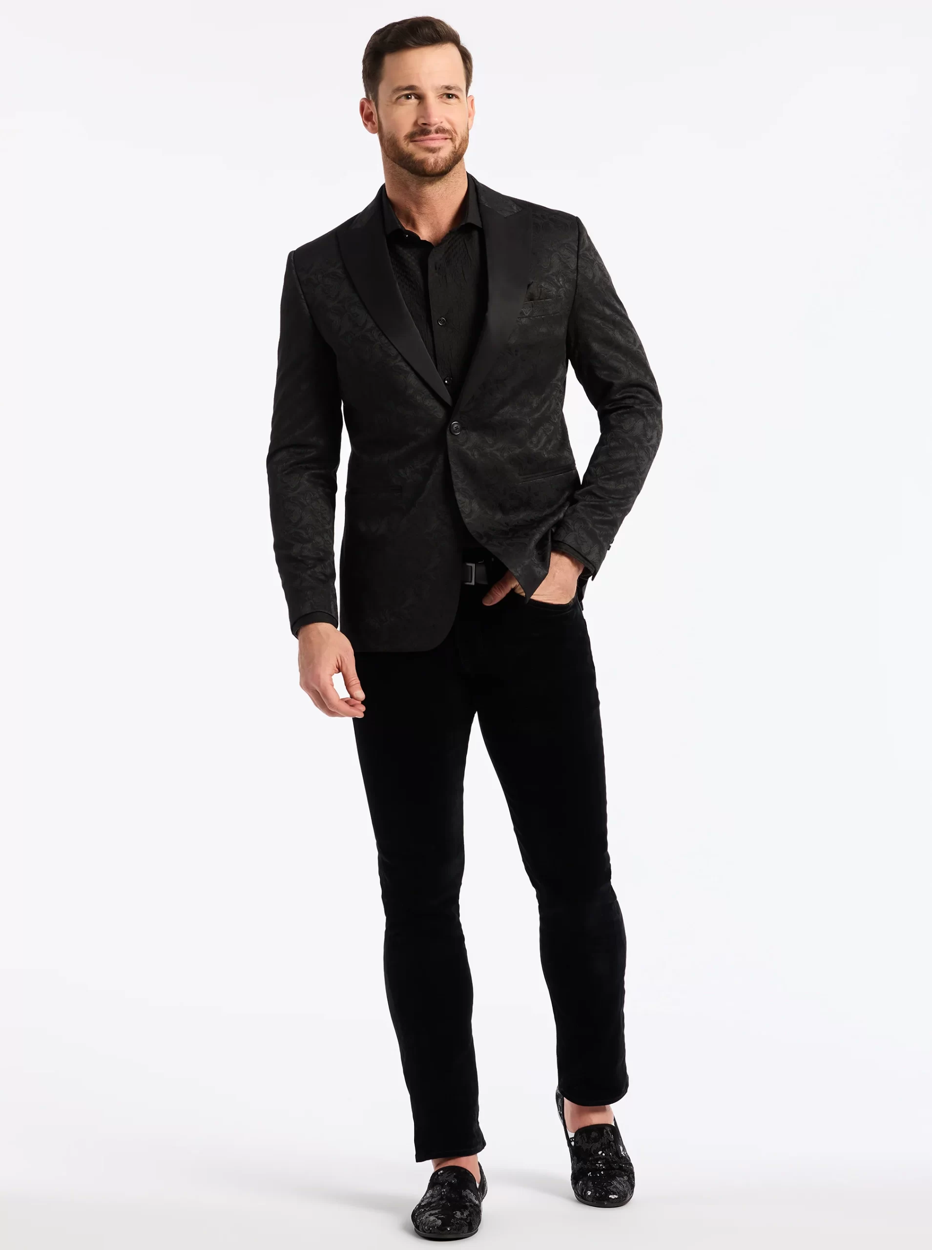 This elegant blazer is ready for a night out on the town. Part of Robert Graham’s “Red Carpet” collection, this red-carpet-worthy piece is the perfect choice for any special occasion. Its tonal pattern, evoking the grace of floating feathers, catches the light with a subtle sheen, while the solid-colored lapel adds an additional layer of elegance. A tonal paisley pull-out pocket square, perfectly matching the full interior lining, provides a stylish touch to this already standout blazer. This style is slightly fitted. It is tailored for a closer-to-the-body fit, with all the RG personality you expect.