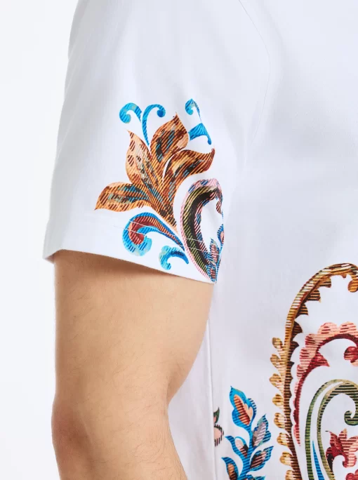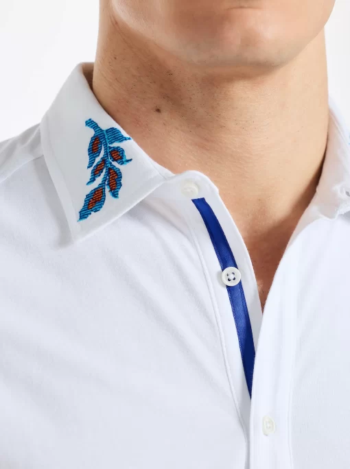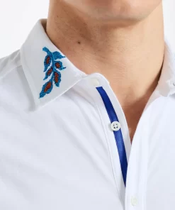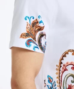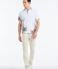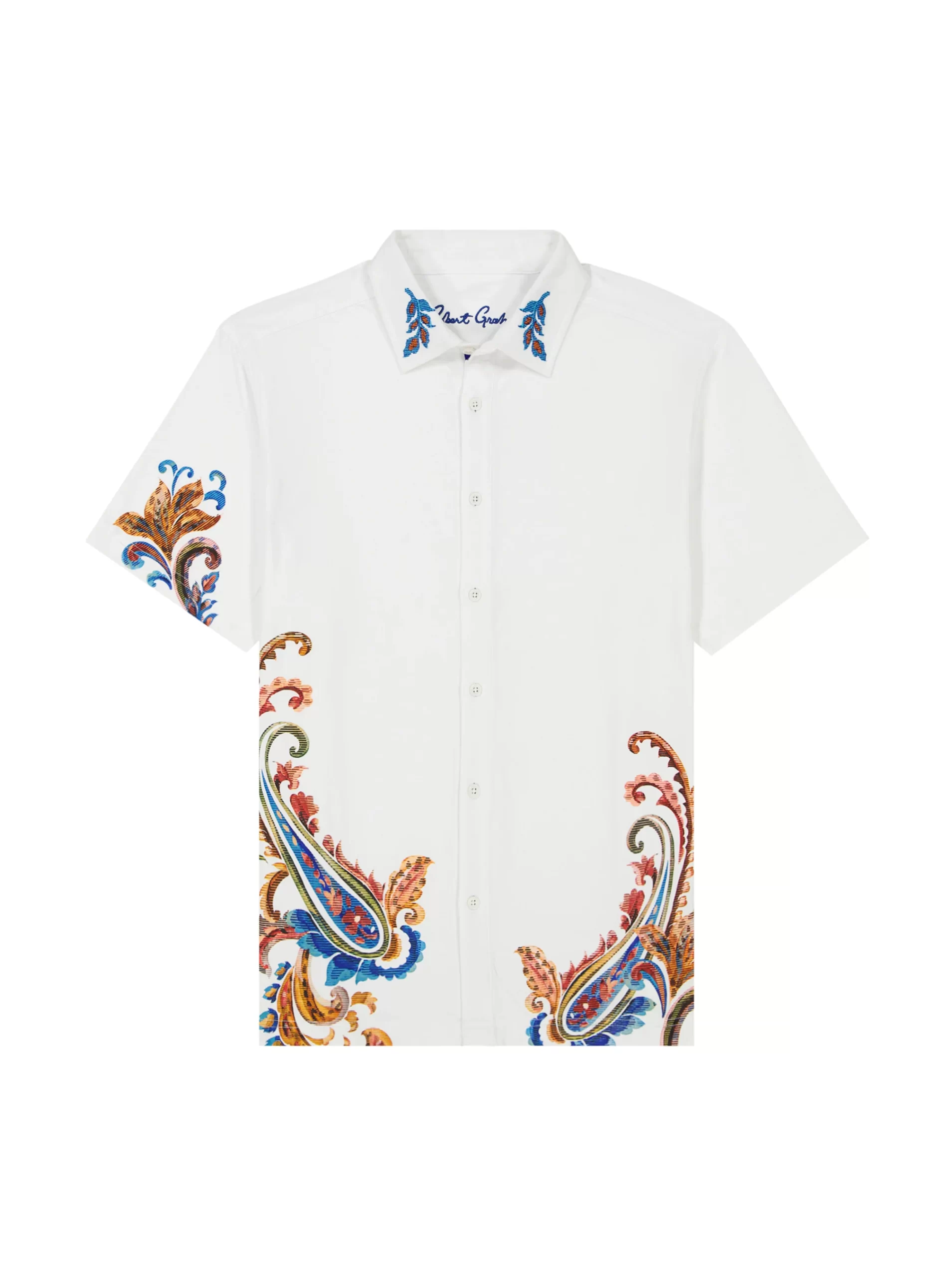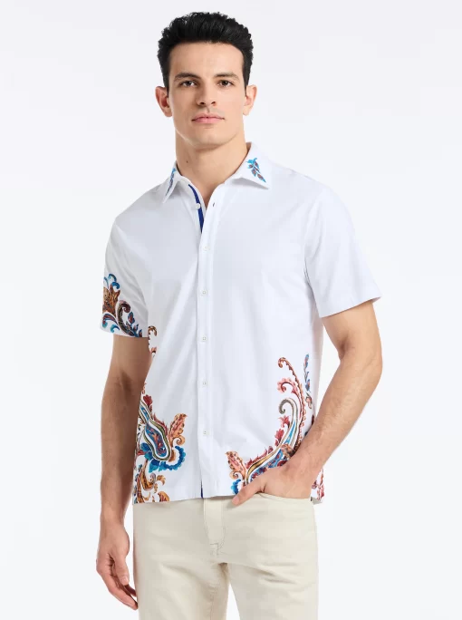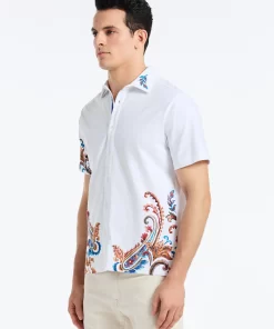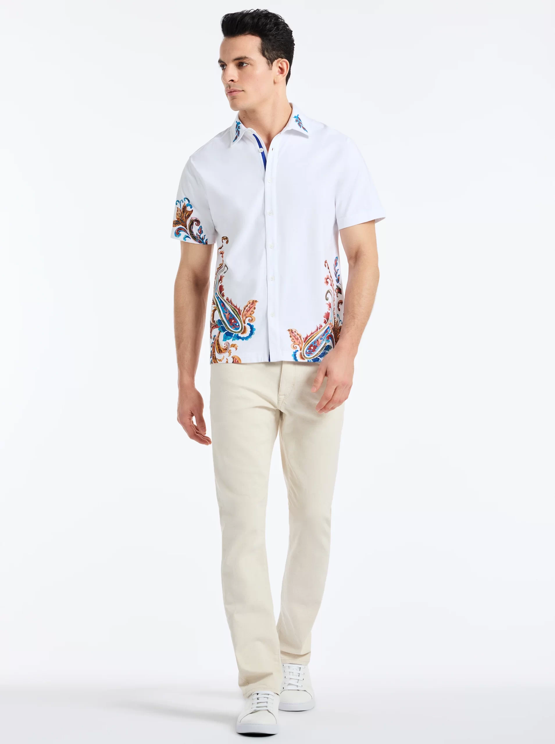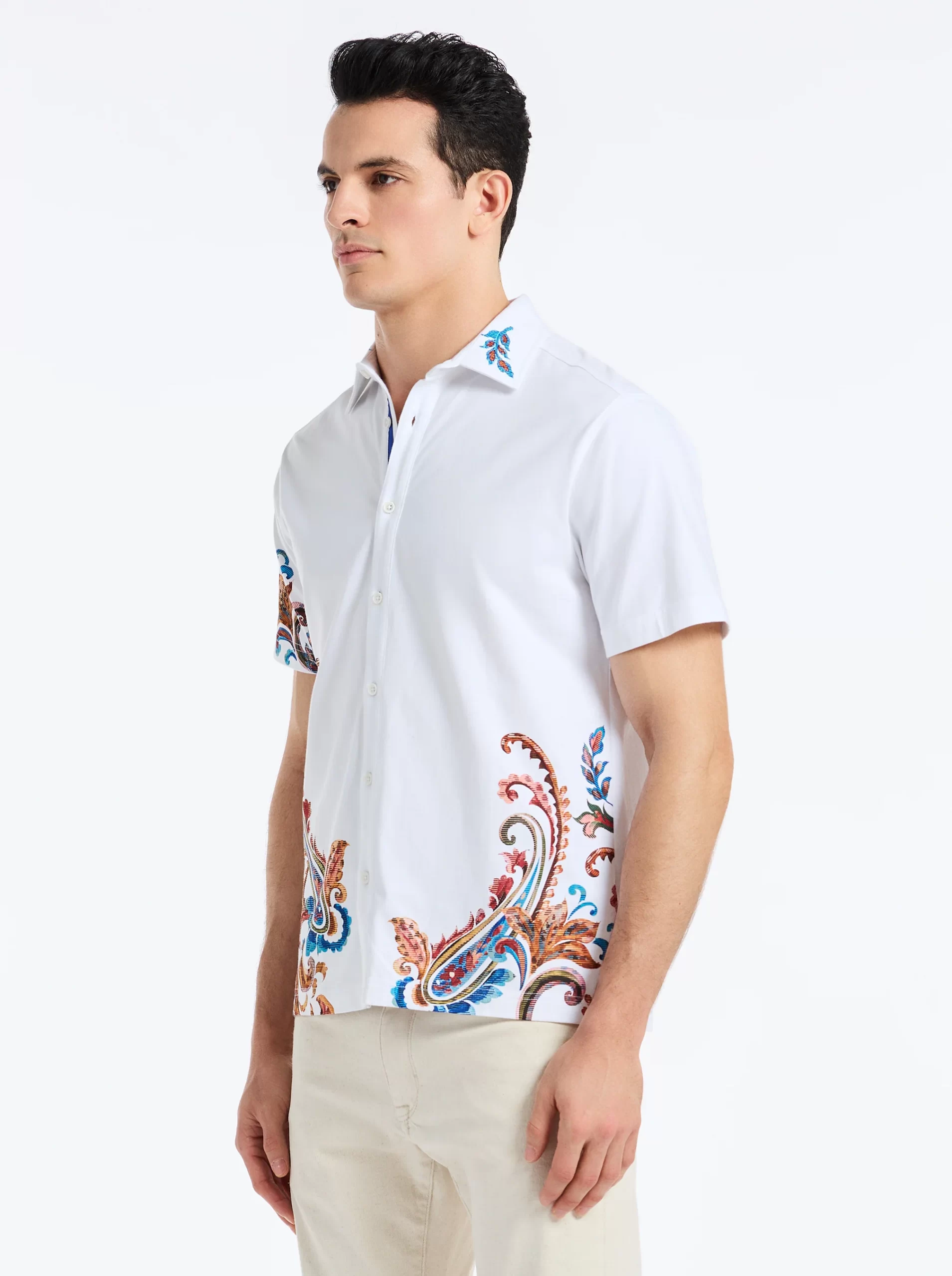 Elevate your wardrobe with this classic white button-down shirt, reimagined with a bold and unexpected twist. Vibrant oversized paisleys artfully placed throughout the design add a touch of sophistication and individuality. Thoughtful details at the collar and sleeve complete this stylish statement piece.
