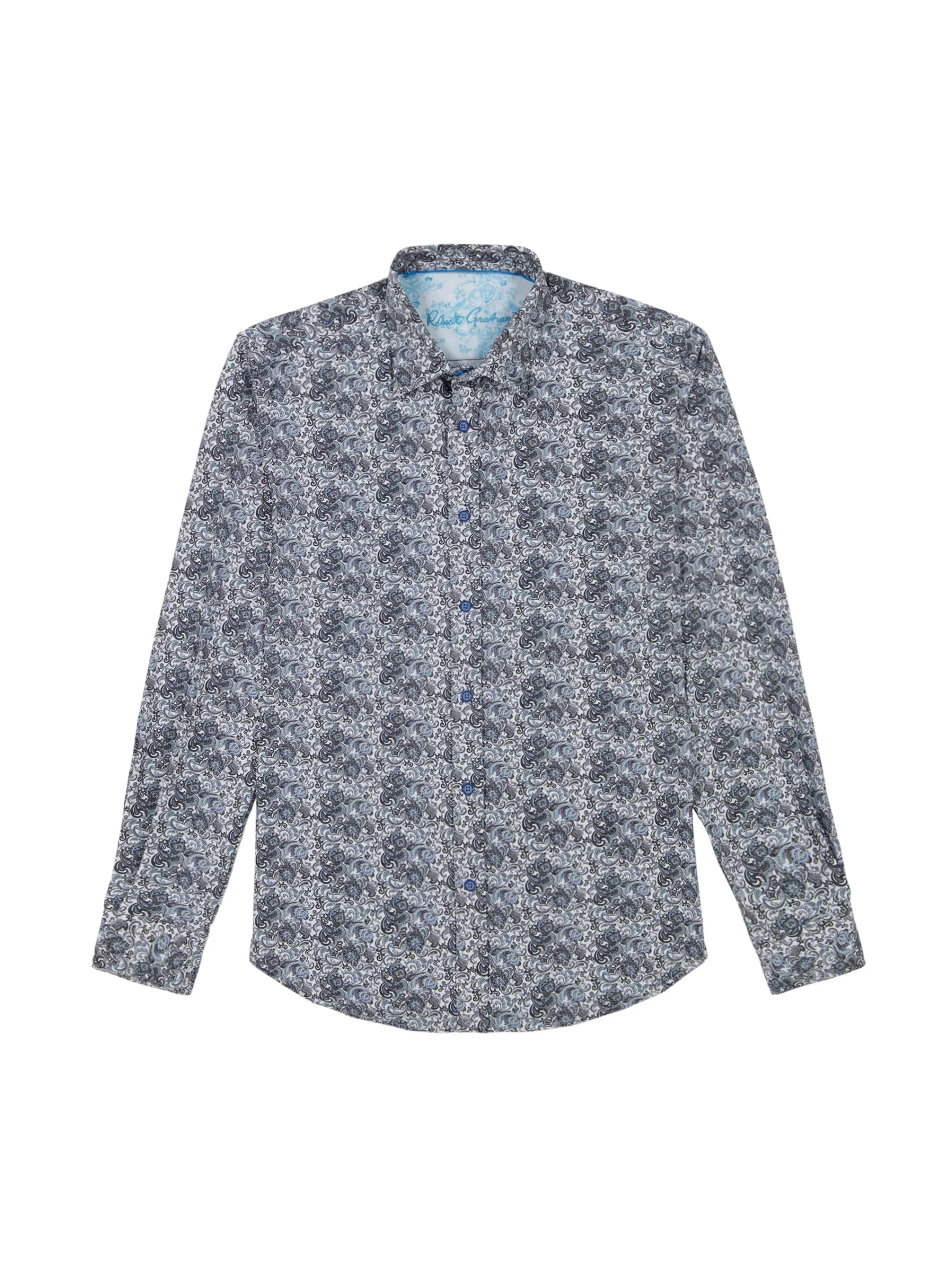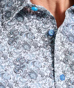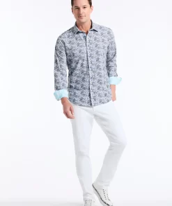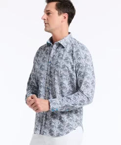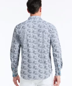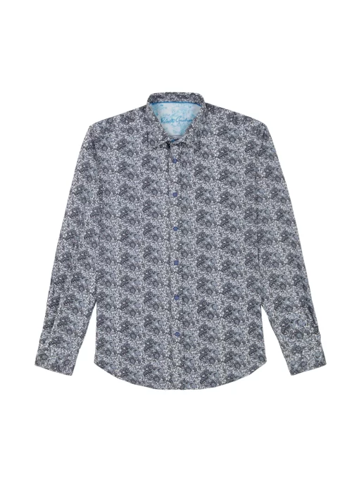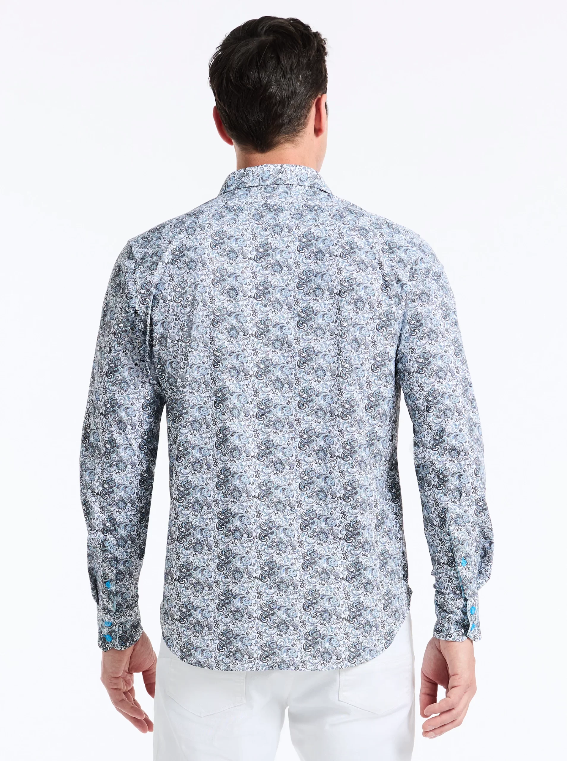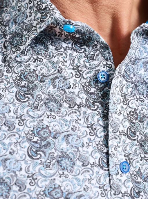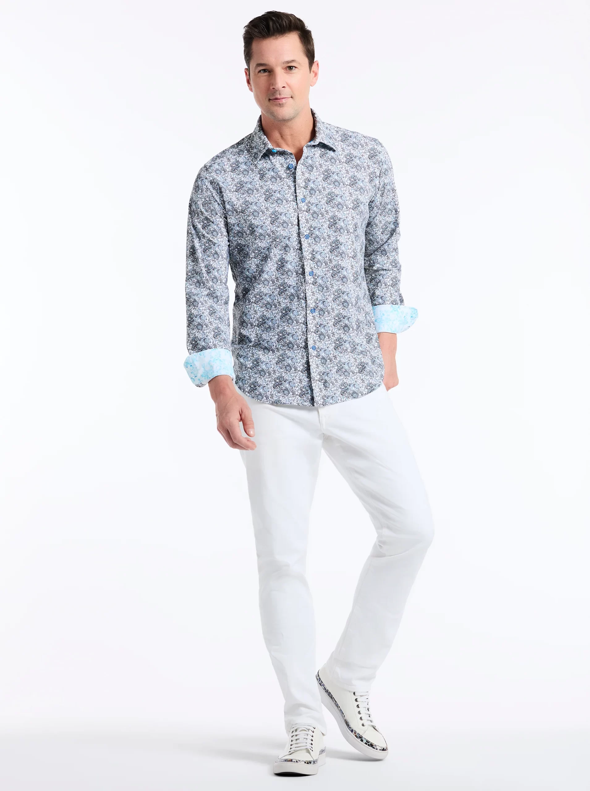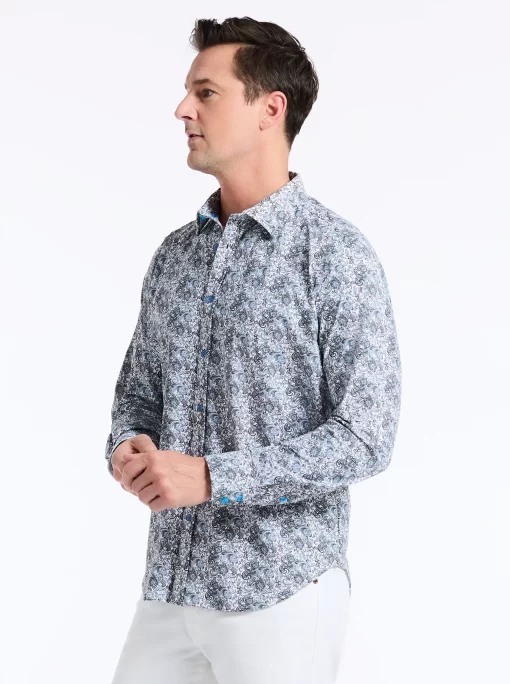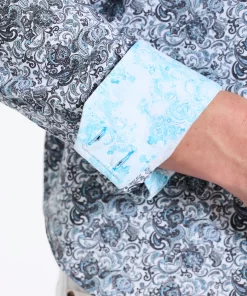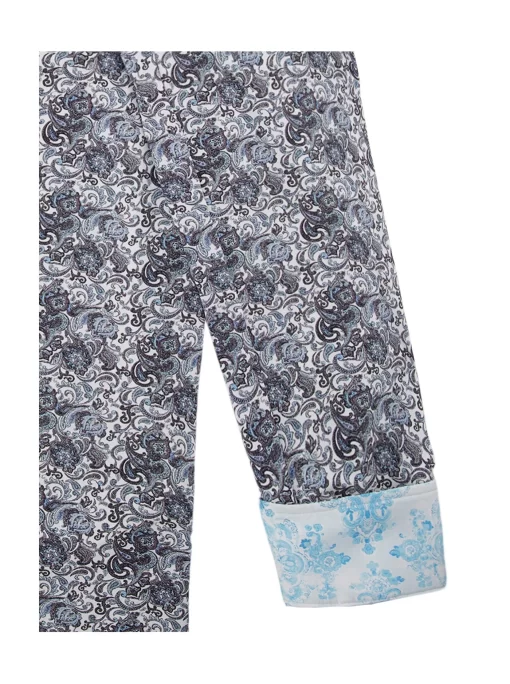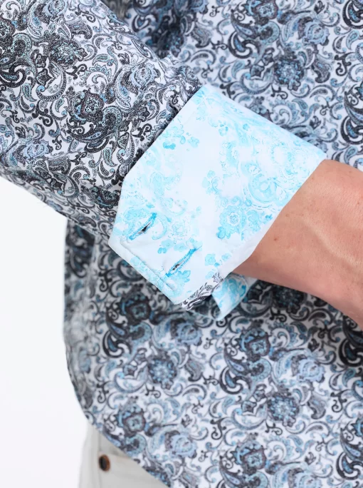 Elevate your wardrobe with this sophisticated button down. An unexpected take on classic paisley gives this style a modern edge. The elegant contrast print at the collar and cuff adds a touch of refinement.