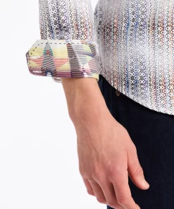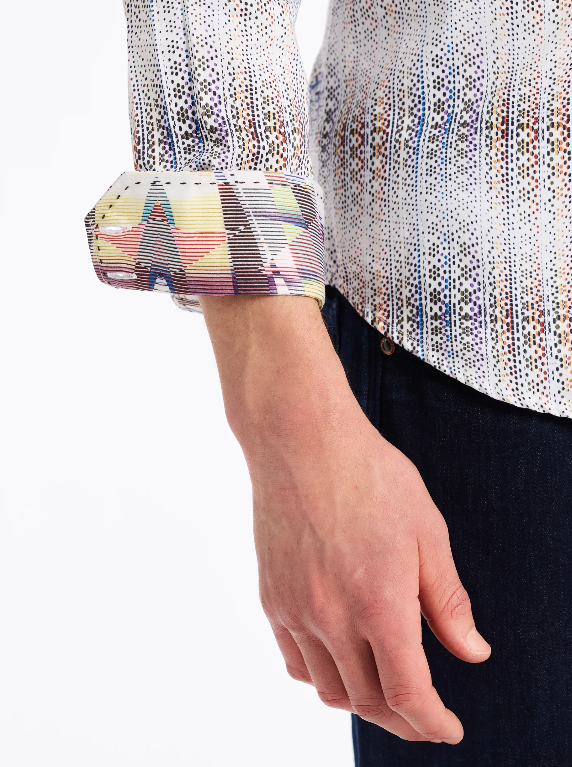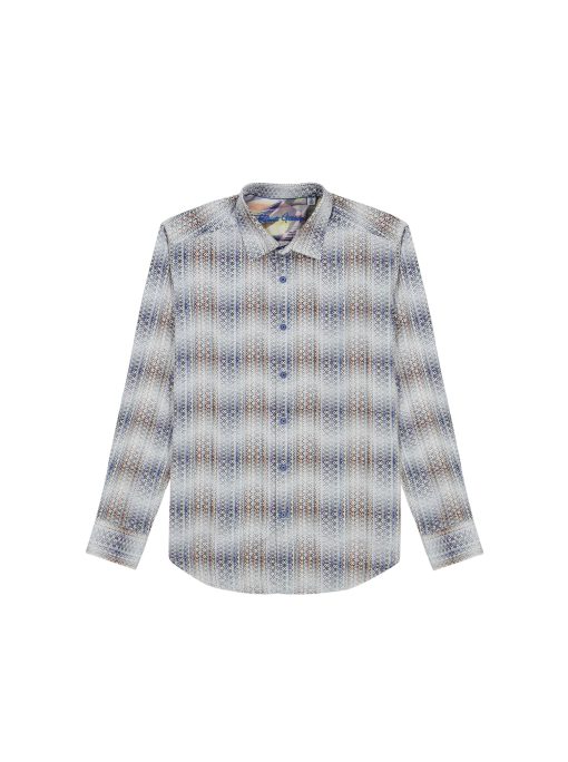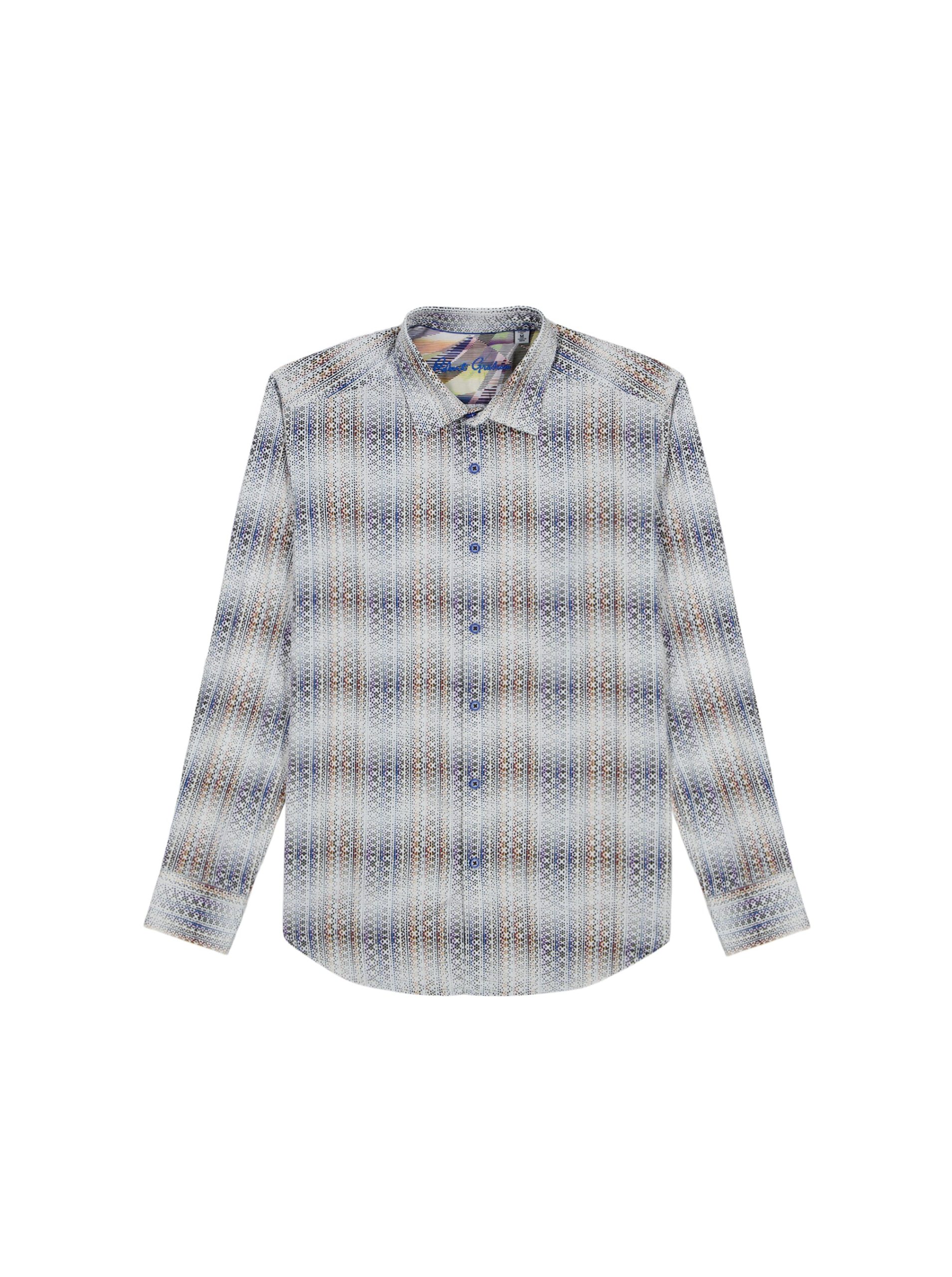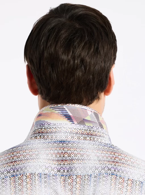 This shirt brings a bold, retro-inspired vibe with a dynamic visual effect. Stripes transform into a hypnotic design creating a unique print that’s all about movement and intrigue. The contrast abstract print under the collar and cuffs adds a pop of colorful energy. This daring style seamlessly blends vintage flair with modern creativity, making it a standout choice for any occasion. This style is slightly fitted. It is tailored for a closer-to-the-body fit, with all the RG personality you expect.