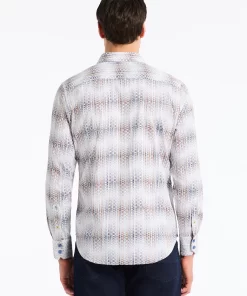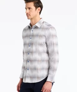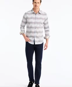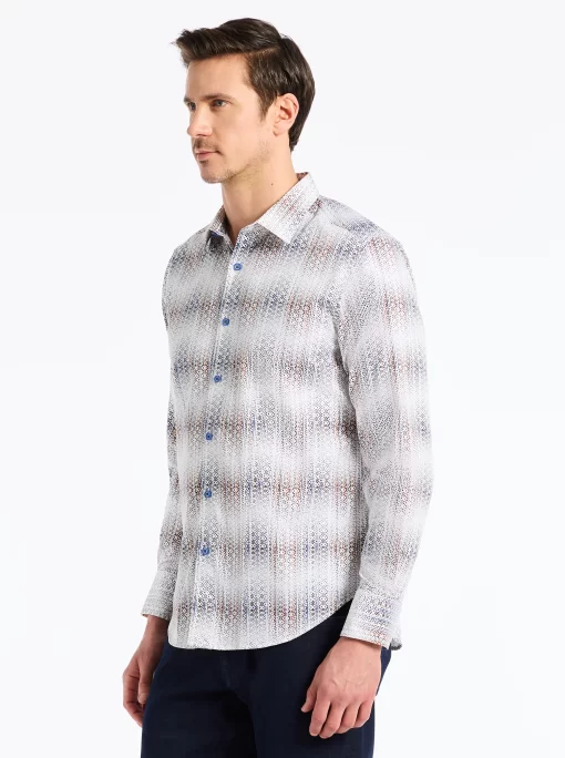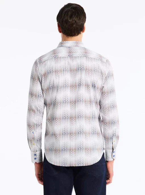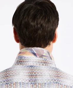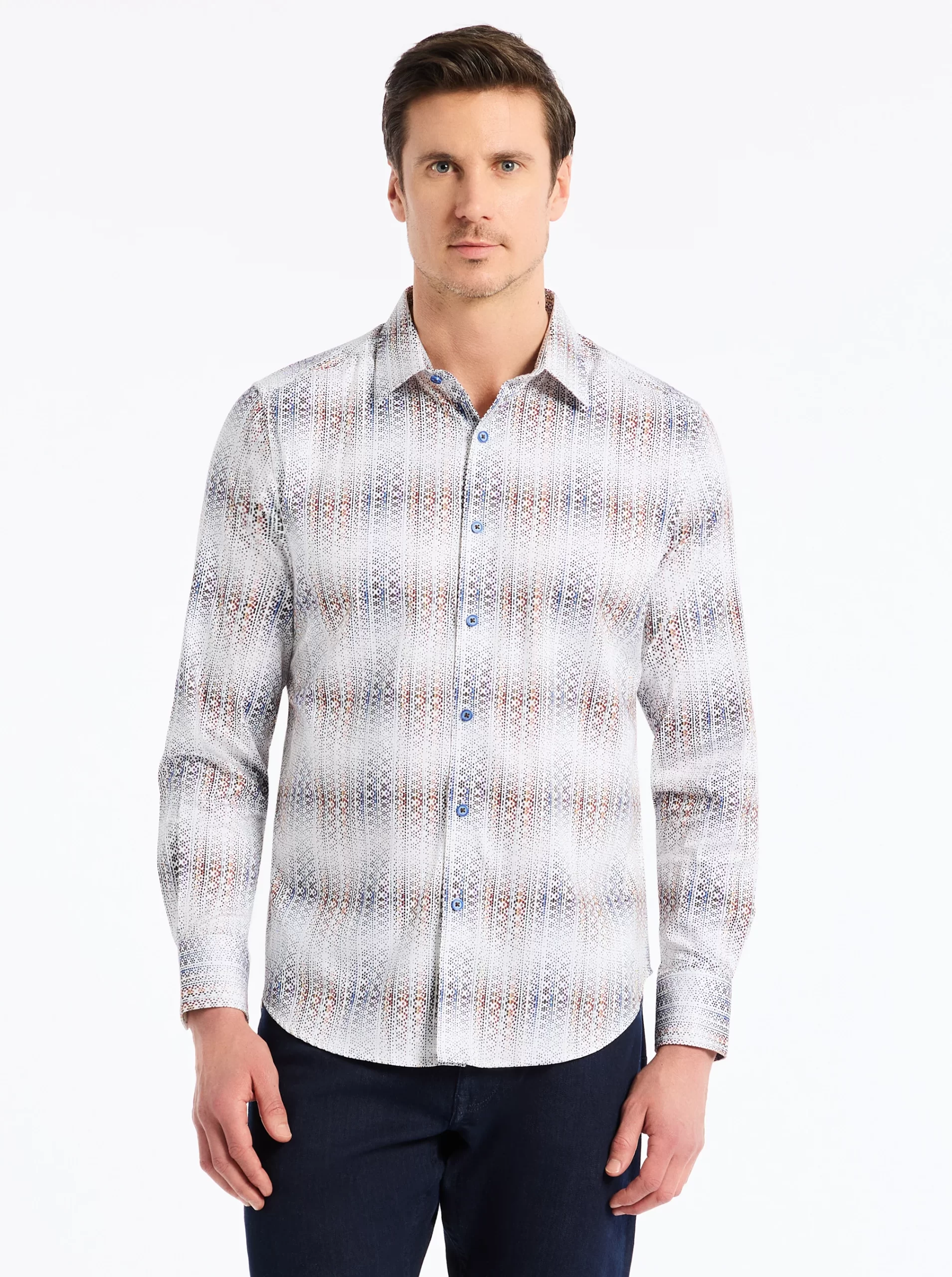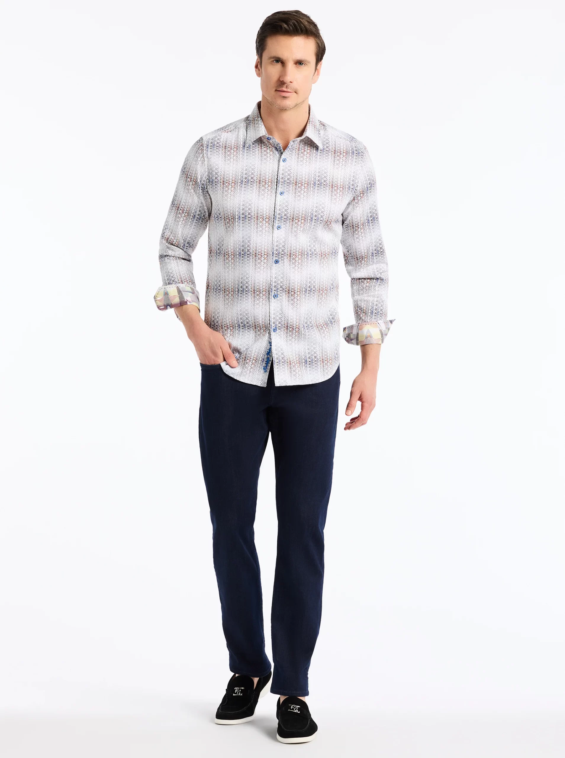 This shirt brings a bold, retro-inspired vibe with a dynamic visual effect. Stripes transform into a hypnotic design creating a unique print that’s all about movement and intrigue. The contrast abstract print under the collar and cuffs adds a pop of colorful energy. This daring style seamlessly blends vintage flair with modern creativity, making it a standout choice for any occasion. This style is slightly fitted. It is tailored for a closer-to-the-body fit, with all the RG personality you expect.