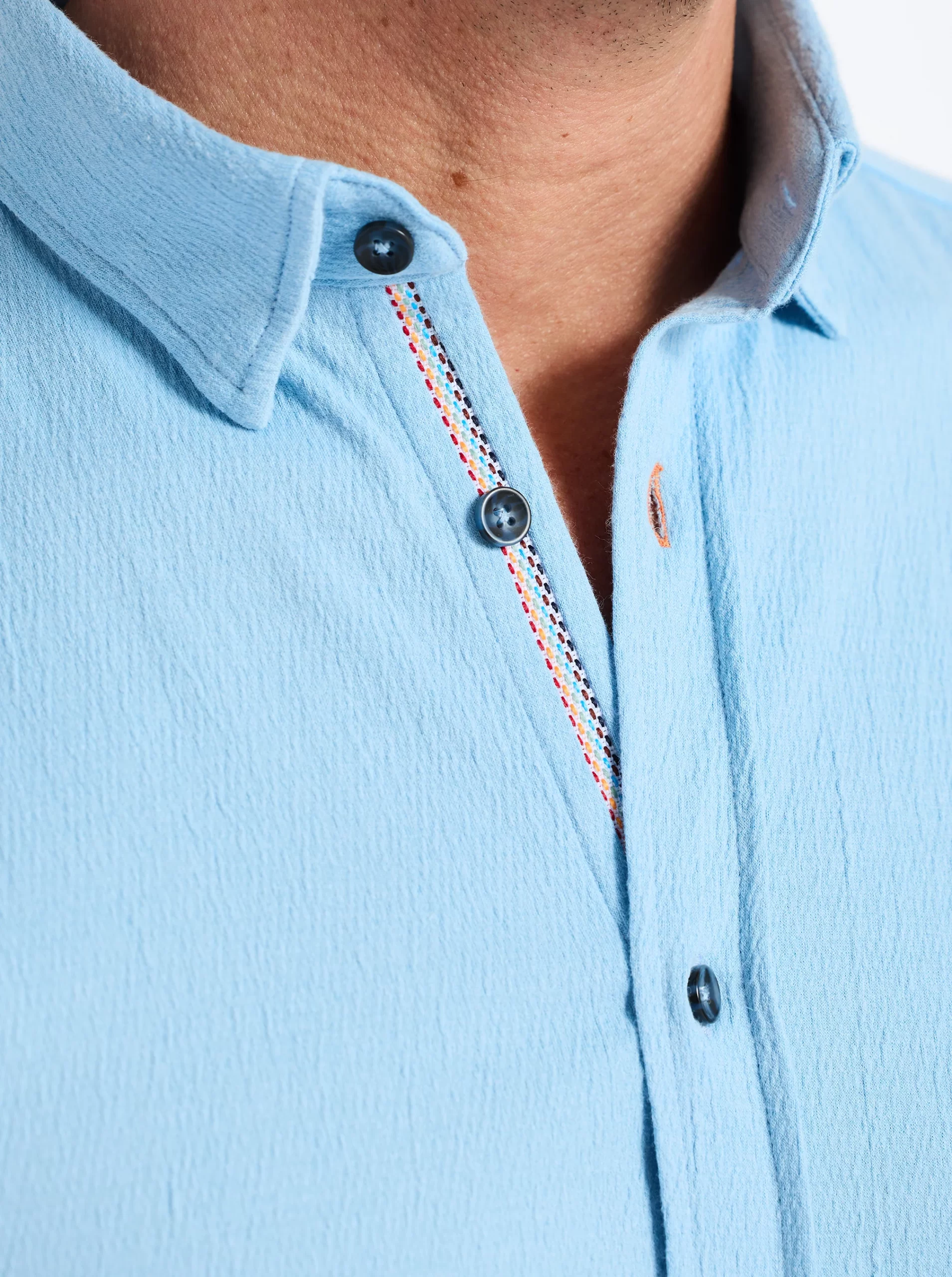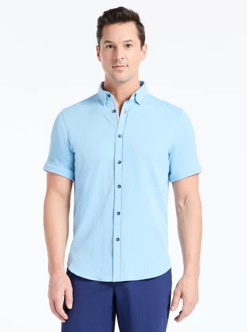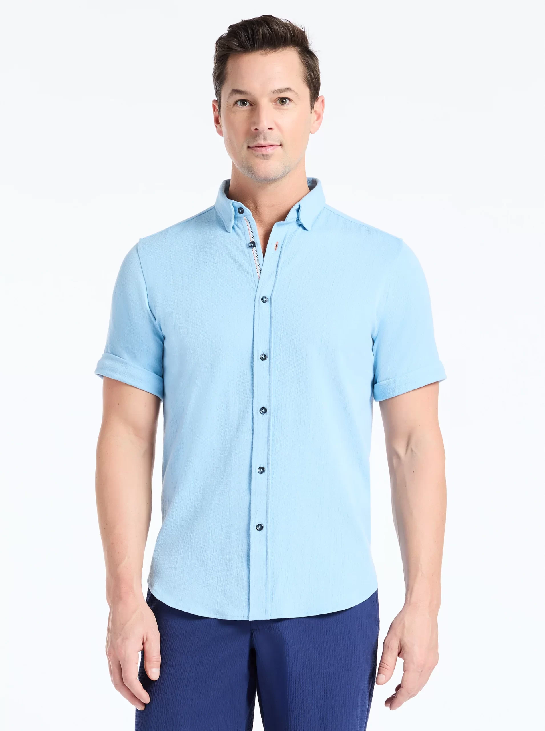 This is not your basic button down. Come in for a closer look and notice that this solid-hued style is begging you to touch the wavy textured fabric. You’ll love the beachy feel that is at once laidback and dressed up. Pair with your favorite chinos to complete the look. This style is slightly fitted. It is tailored for a closer-to-the-body fit, with all the RG personality you expect.