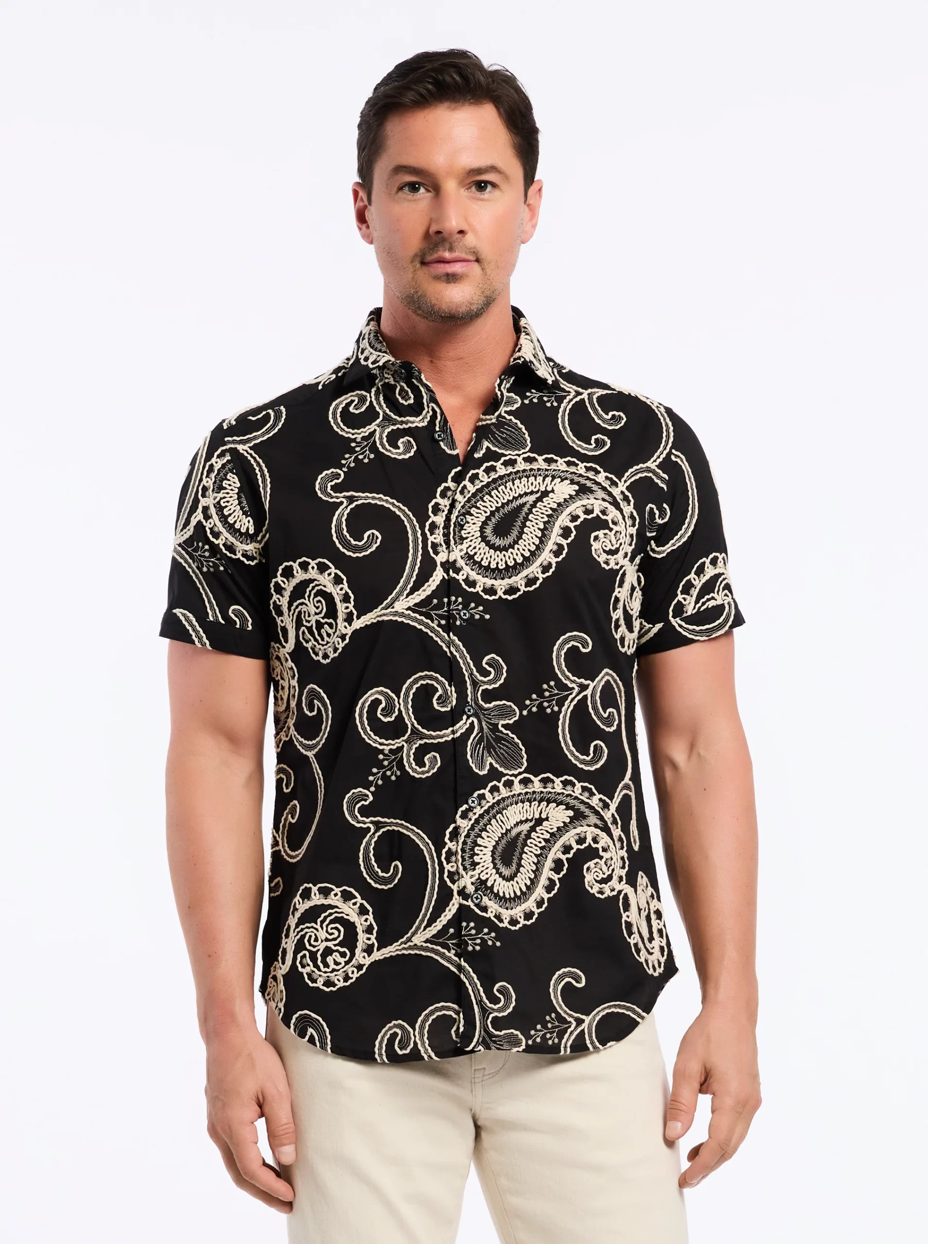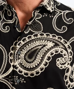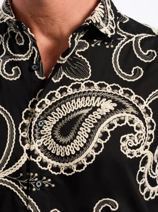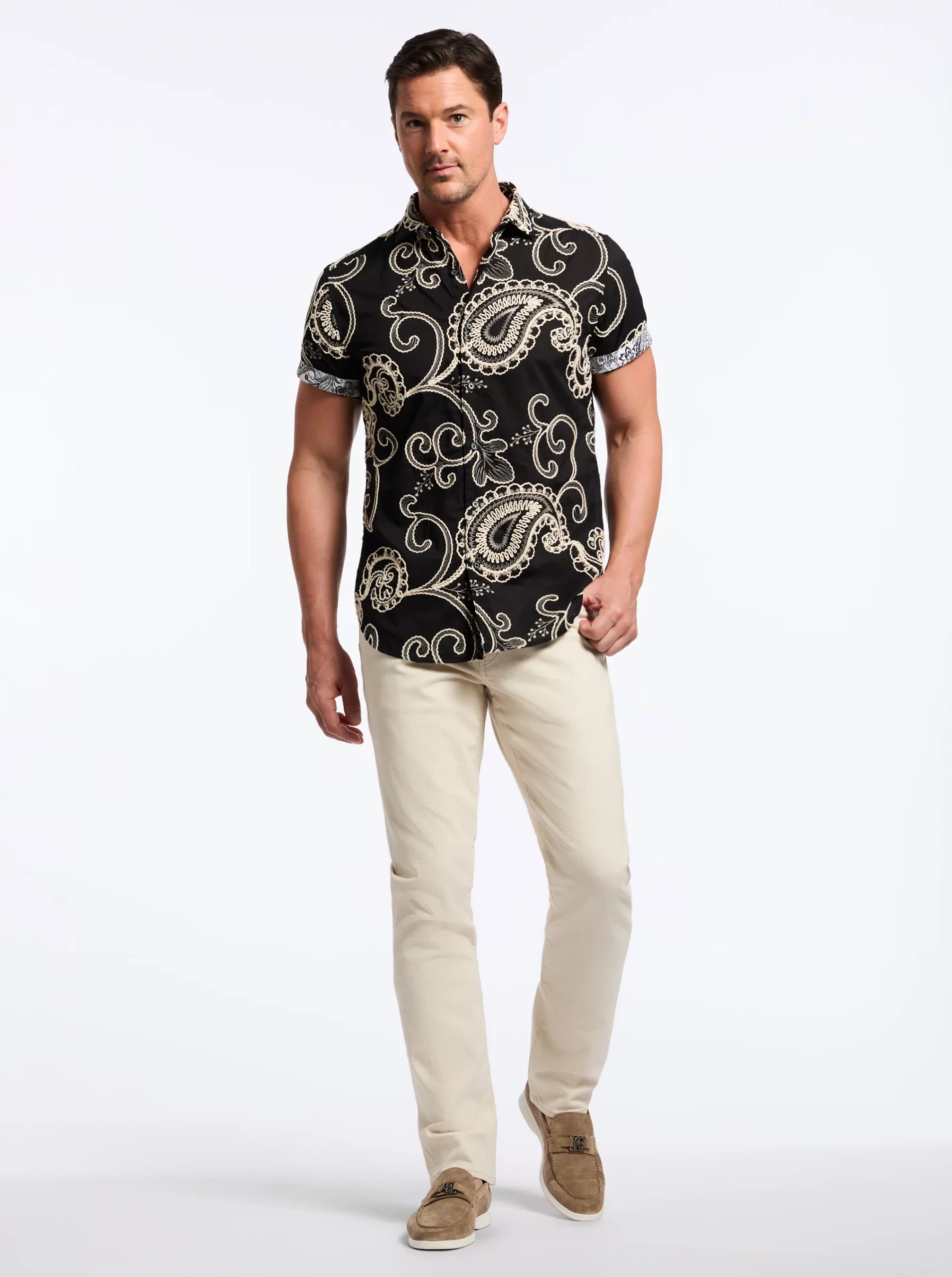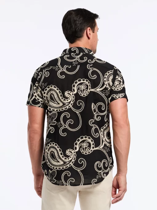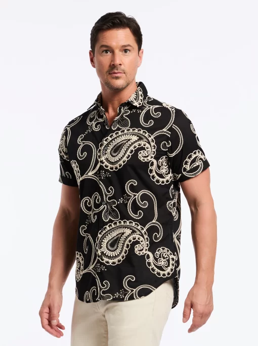 This isn’t your average paisley shirt. Featuring intricate Schiffli embroidery, this linen-blend shirt offers a unique blend of modern style and timeless craftsmanship. The exquisite detailing creates a captivating look that’s the perfect choice for your next occasion.
