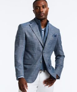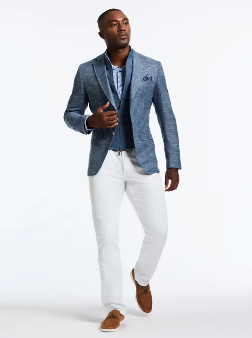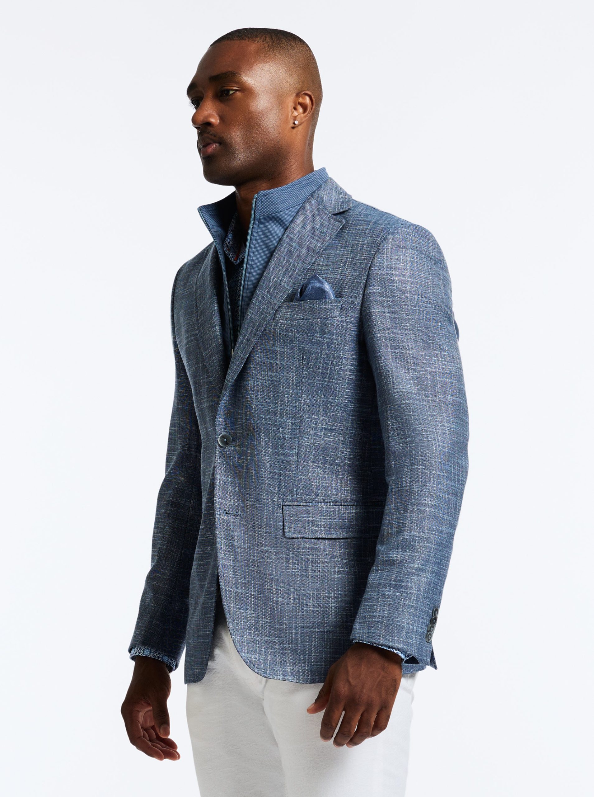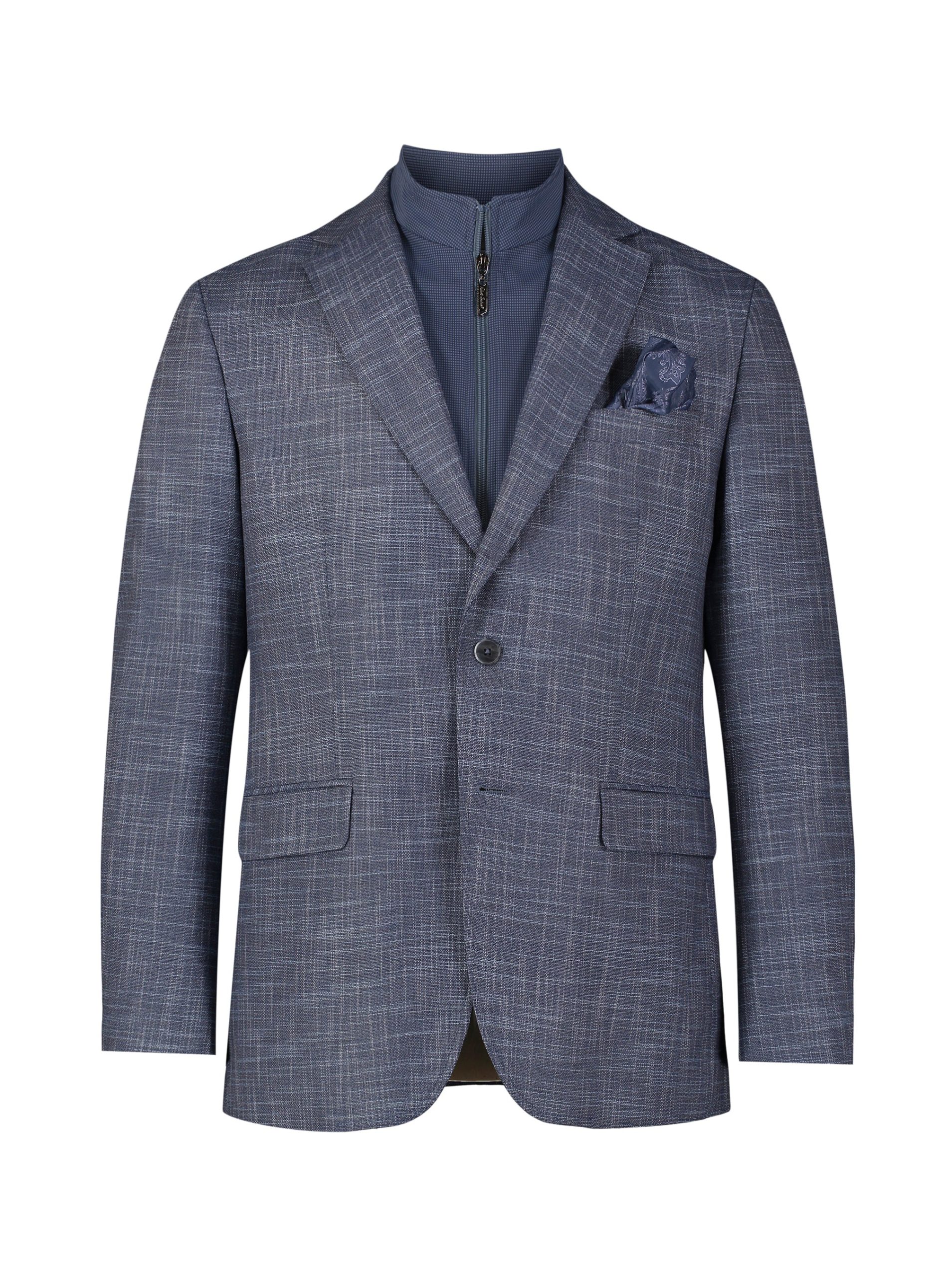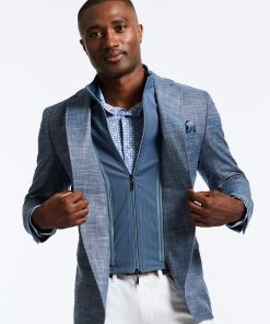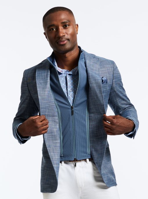 Don’t miss the elevated details of the Jetset VII blazer. An elegant crosshatch exterior style provides a stylish contrast to the solid blue of the interior zip-out bib. Leave the bib in for an added layer or zip it out on warmer days. Inside, notice a sophisticated tonal paisley jacquard lining, the twin to the pullout pocket square at the exterior.