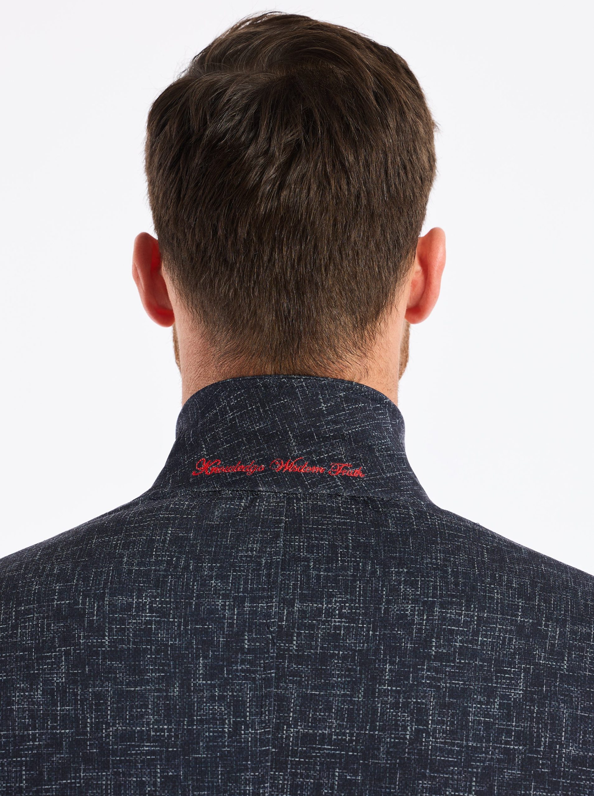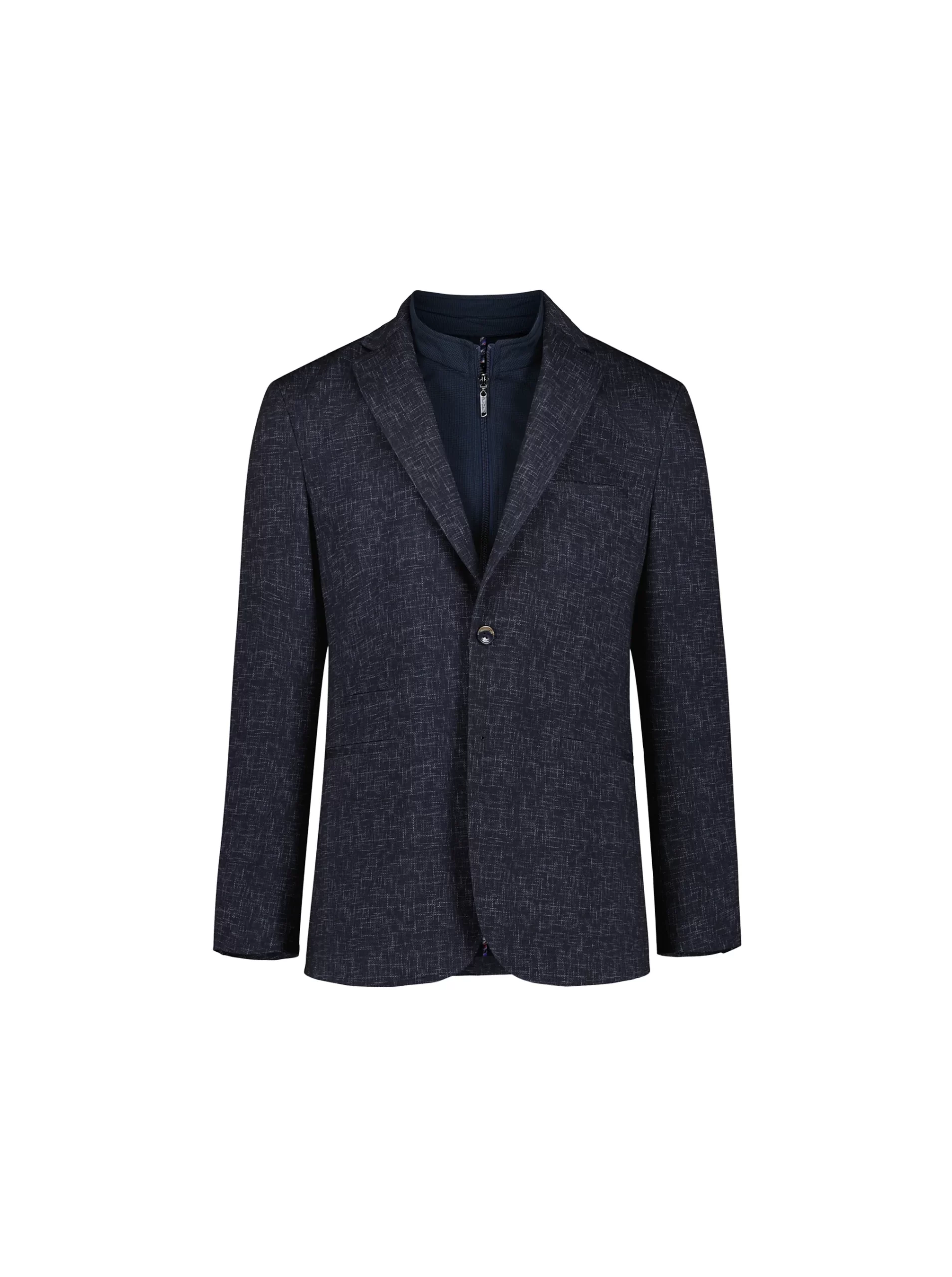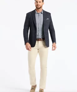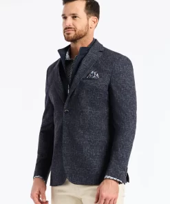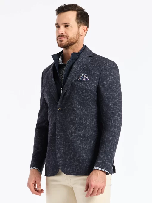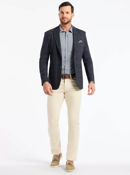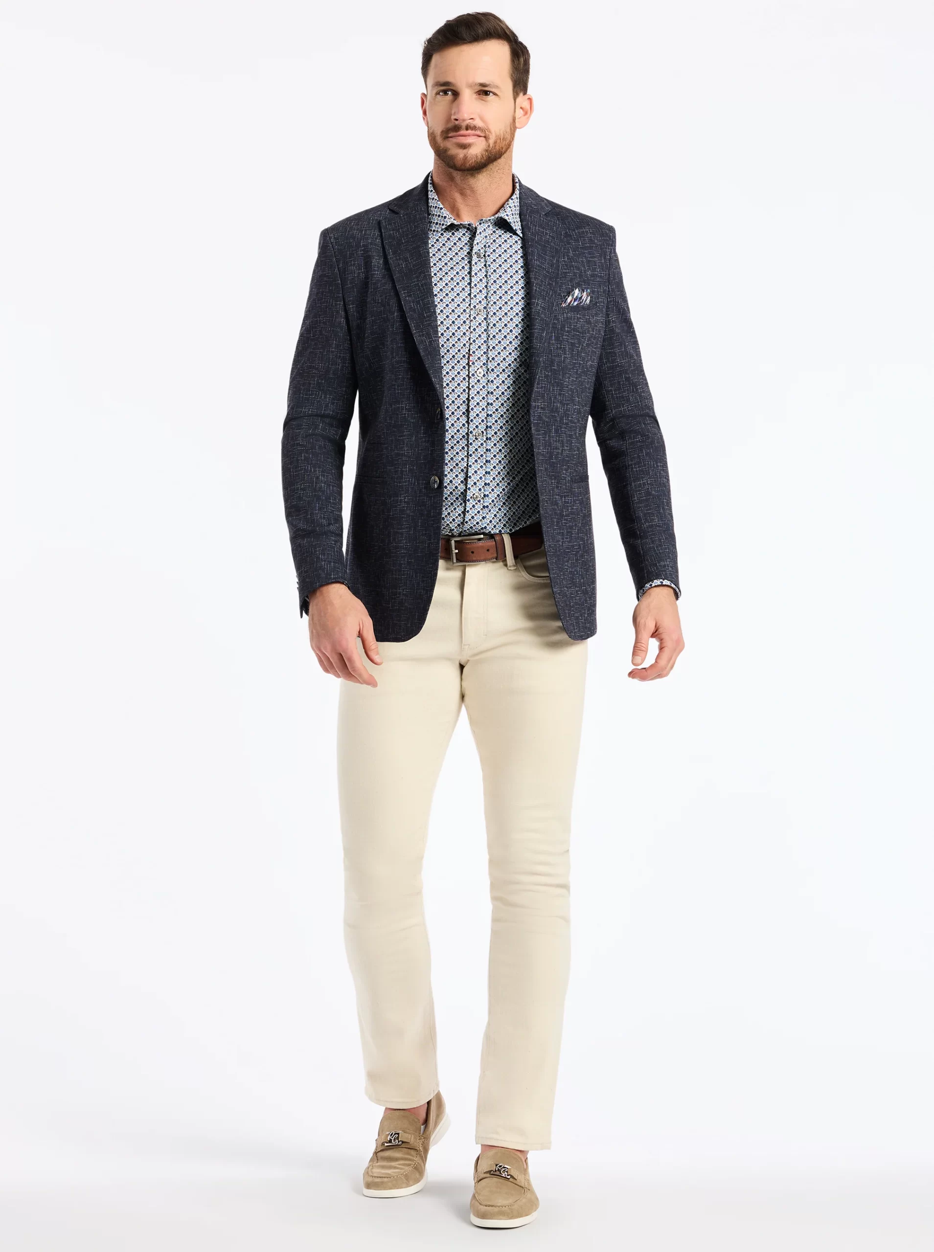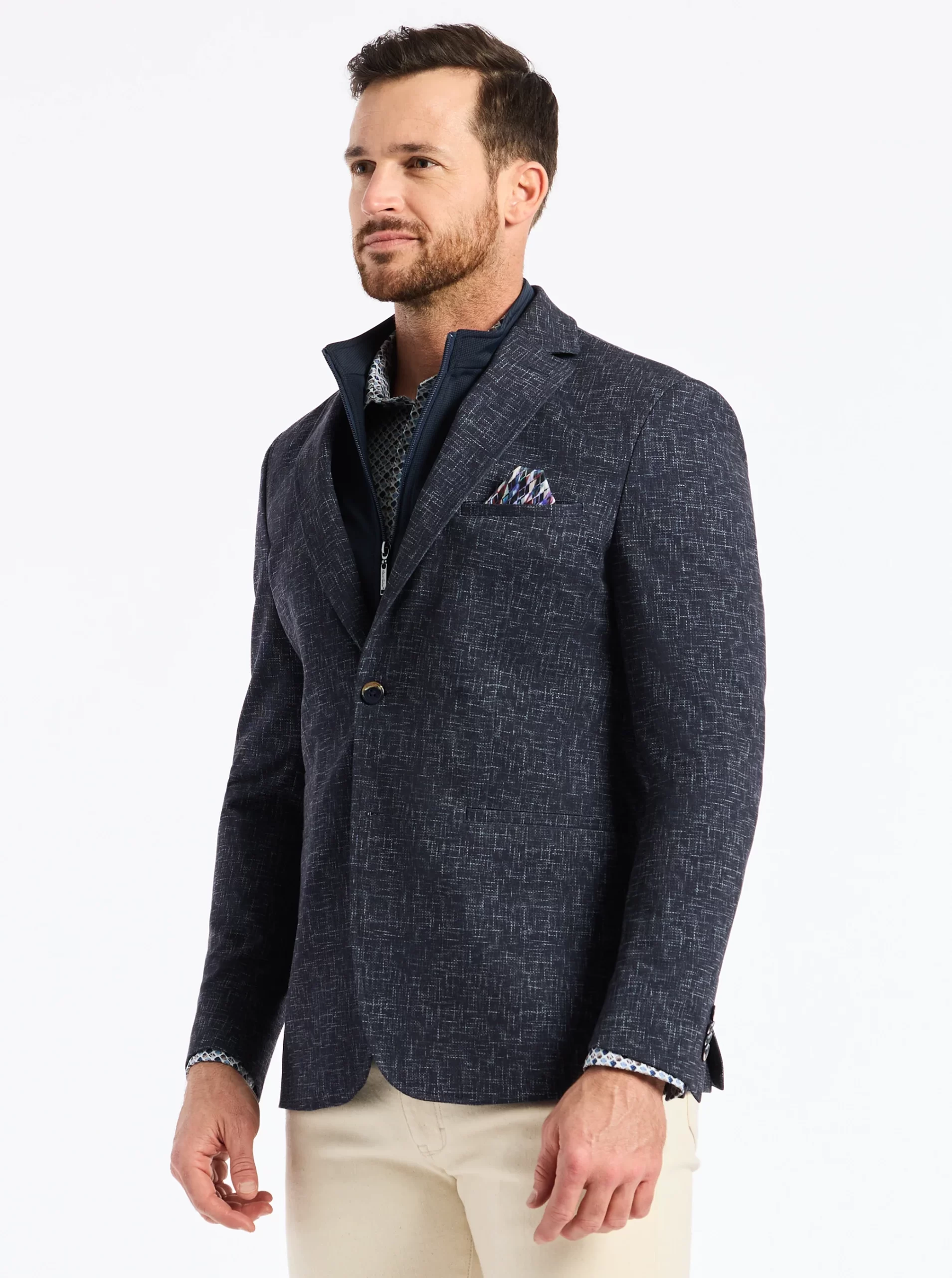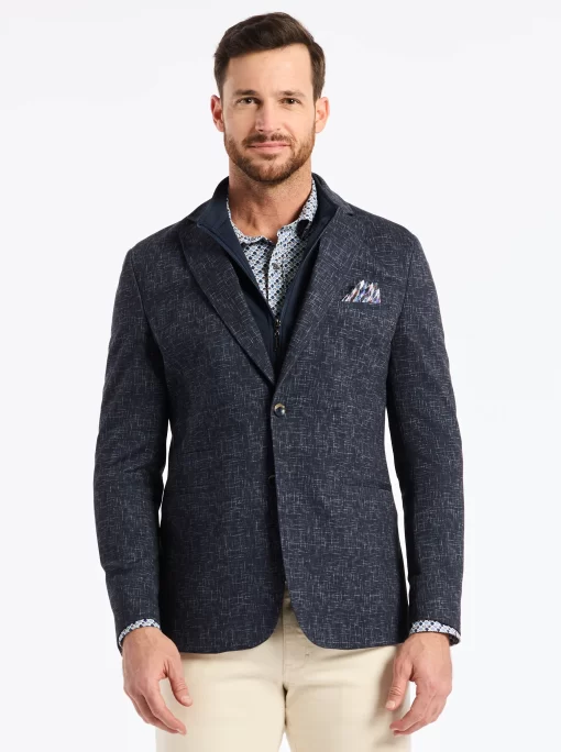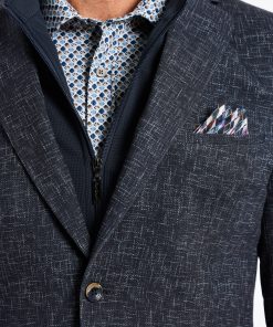 Instantly elevate any look with the Jetset blazer. This piece features a textured woven exterior with a subtle speckled blue-gray pattern. The luxe gray suede zip-out bib adds versatility, allowing you to adapt effortlessly to wherever the day might take you. The signature pull-out pocket square features a micro sunglass print that perfectly complements the matching interior lining. You’ll love the thoughtful details that speak to the blazer’s exquisite craftsmanship. This style is slightly fitted. It is tailored for a closer-to-the-body fit, with all the RG personality you expect.