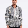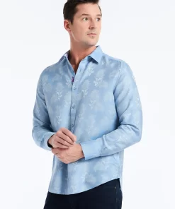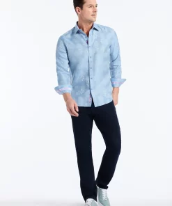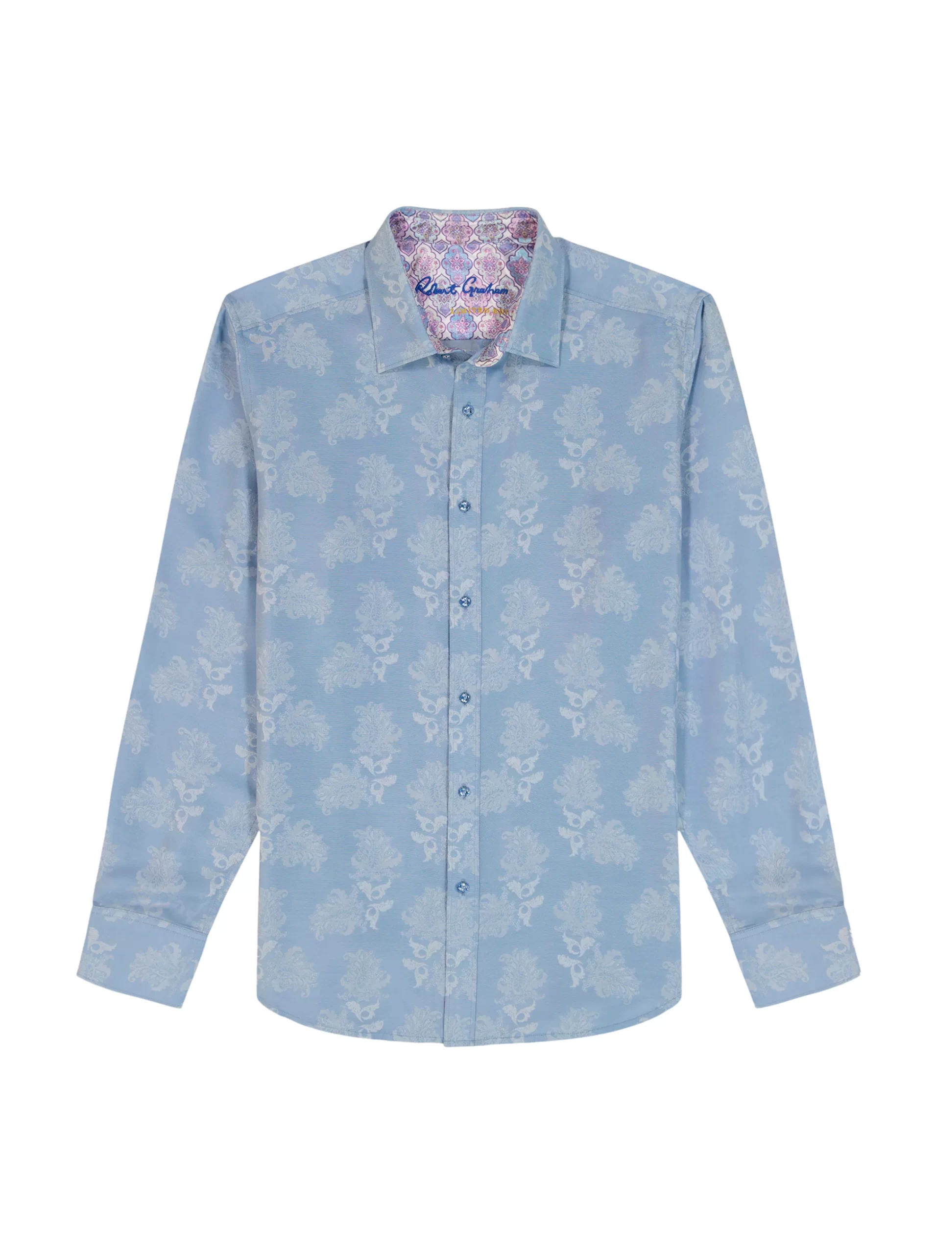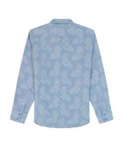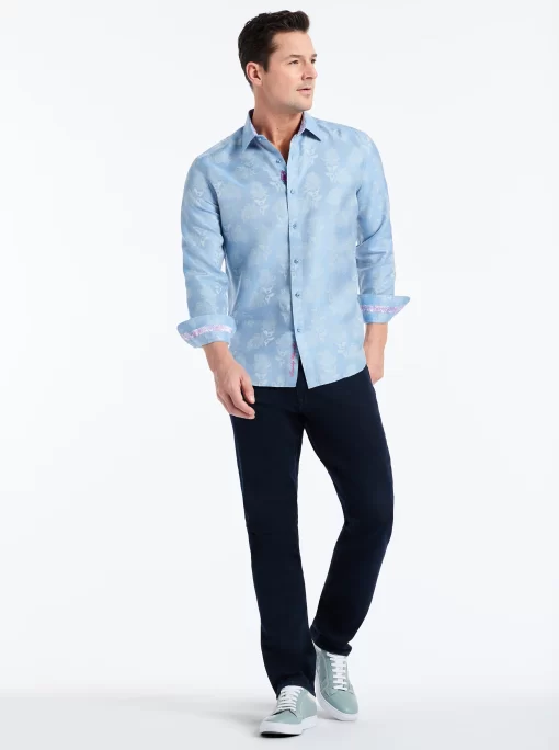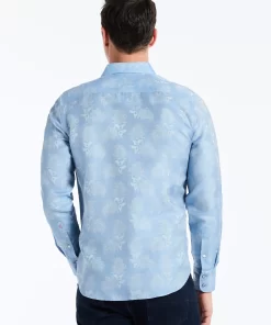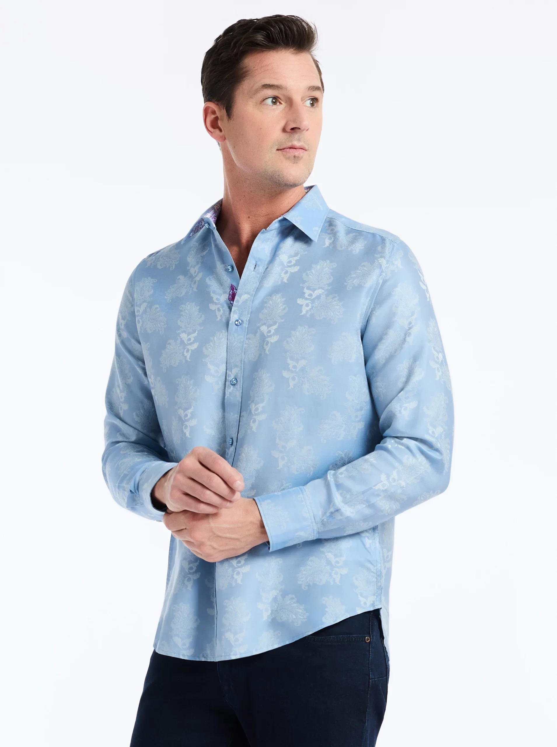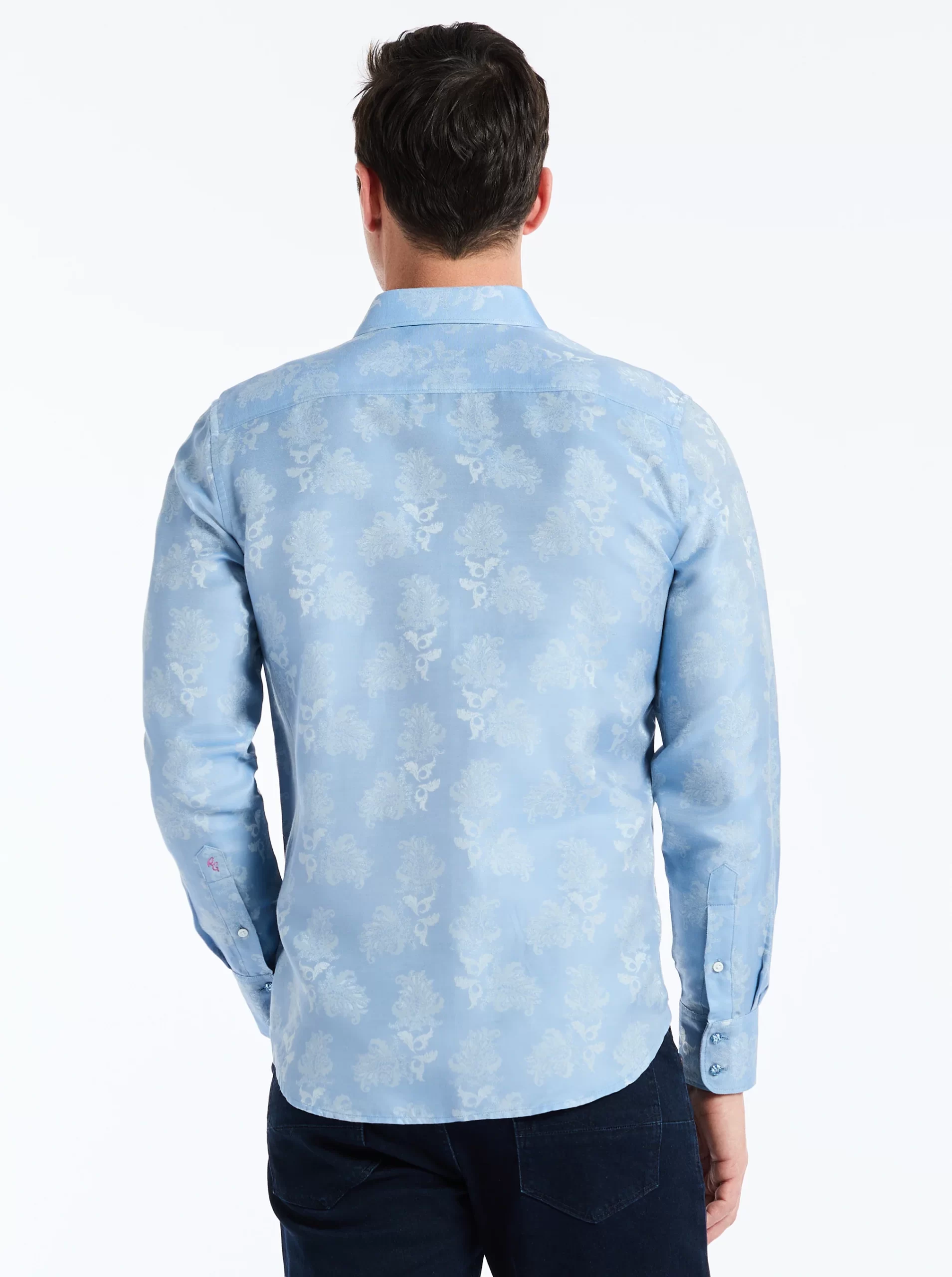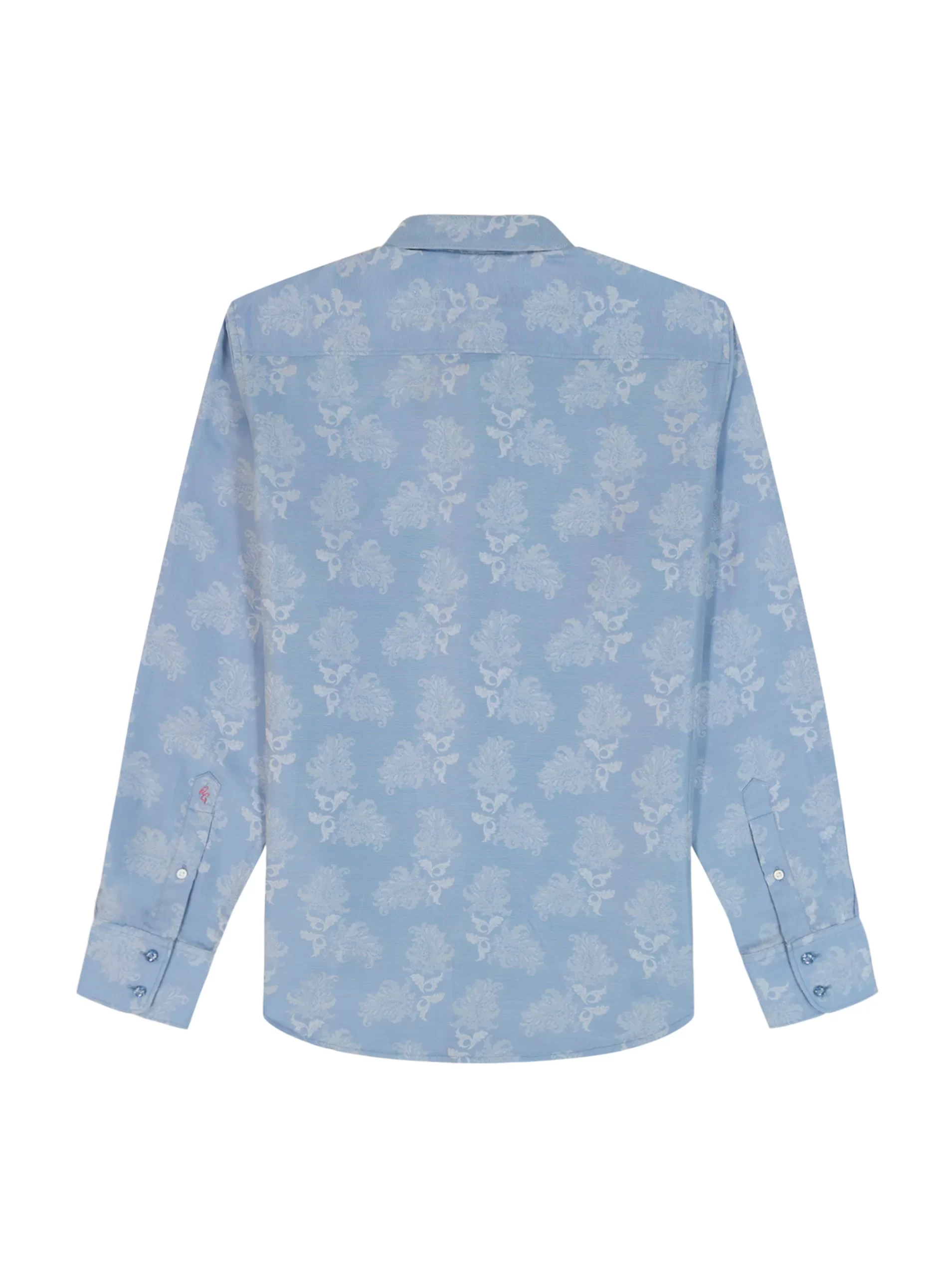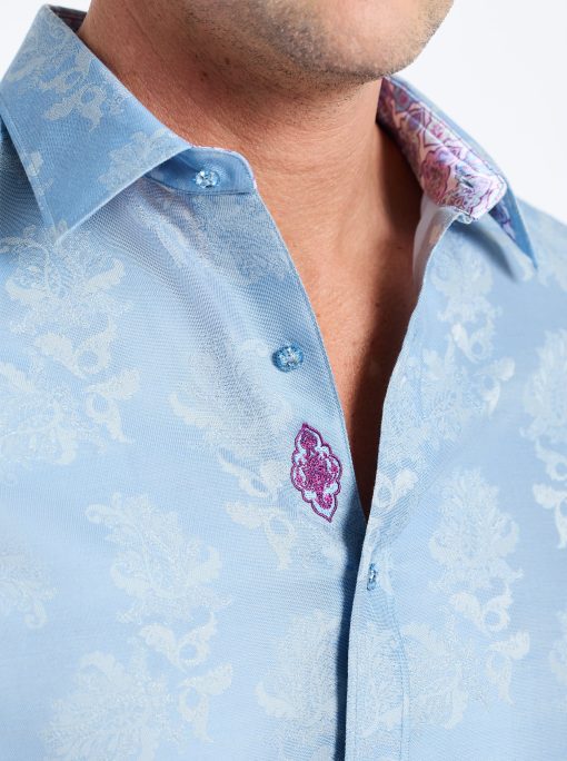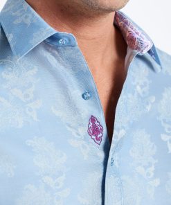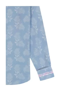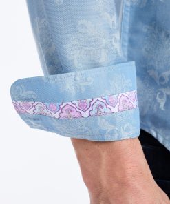Exuding effortless elegance, this exquisite piece features a luxurious blend of silky Cupro yarns and the finest quality cotton. The result is an iridescent fabric that shimmers with subtle movement, highlighting the cool blue paisley pattern. Satin-printed trims and glittering crystal buttons enhance the richness of the fabric. A decorative silk motif at the rolled cuff is waiting to be discovered like a hidden gem. This piece is a celebration of understated luxury and timeless style.