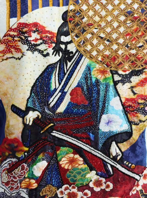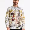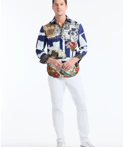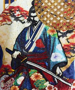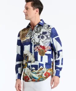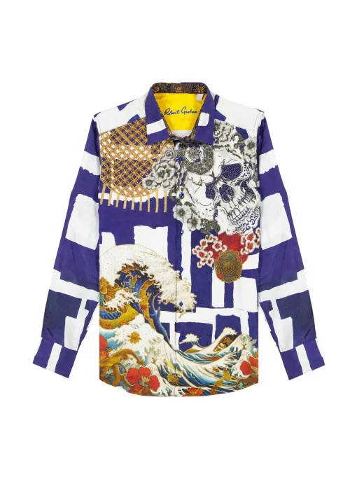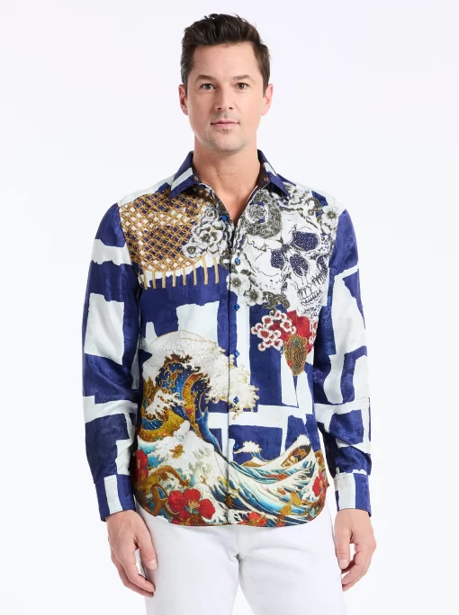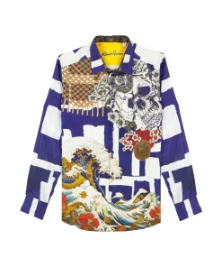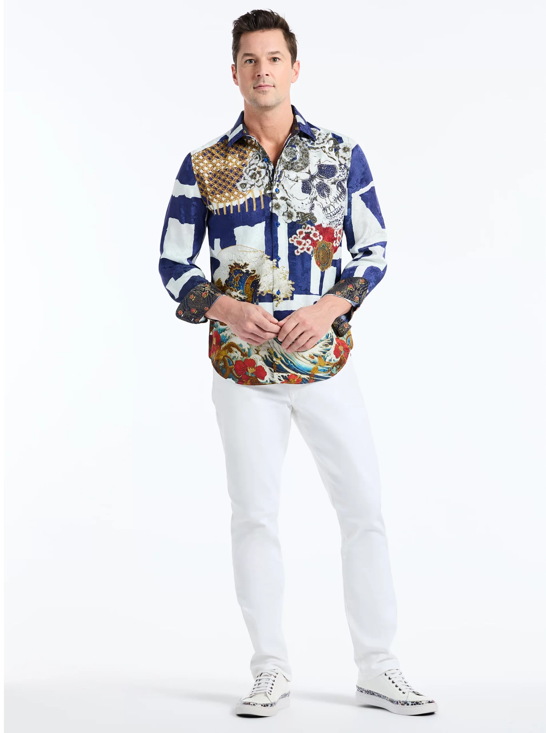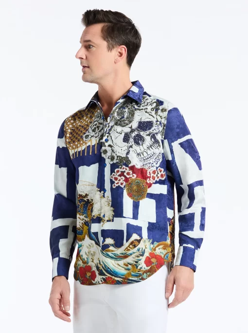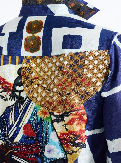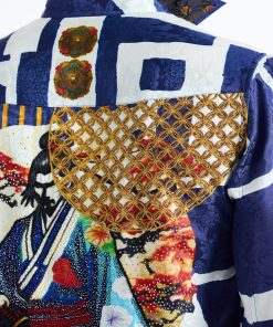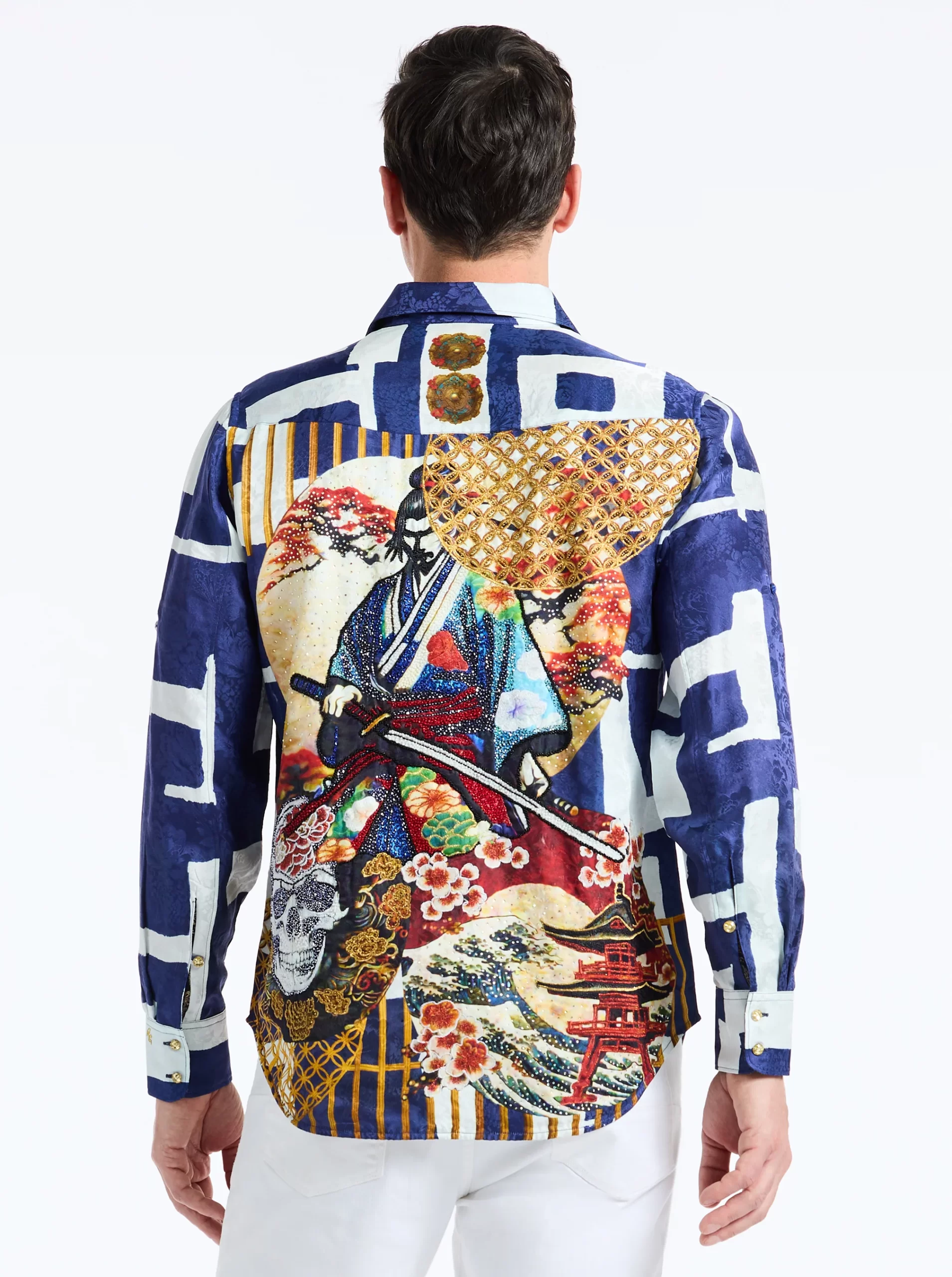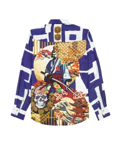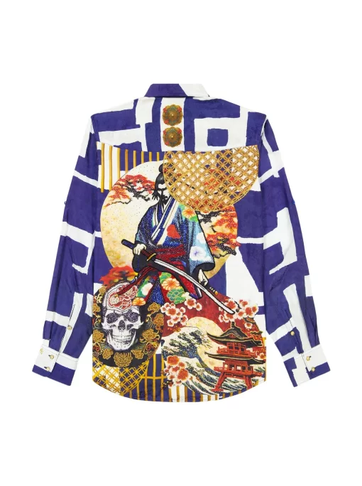 An instant conversation starter, this captivating shirt, inspired by the ancient art of Japanese Aizuri blue block printing features an eclectic silk jacquard print. Against this stunning backdrop, an eclectic collage emerges, showcasing grinning RG skulls amidst Medieval Japanese art motifs, like bamboo fences, stylized Tsutsuji flowers, and Samurai warriors, creating a striking visual narrative. Metallic embroidery, hand-beaded accents, and shimmering crystals add dazzling dimension, while crystal buttons and silk brocade trims complete this unforgettable masterpiece.