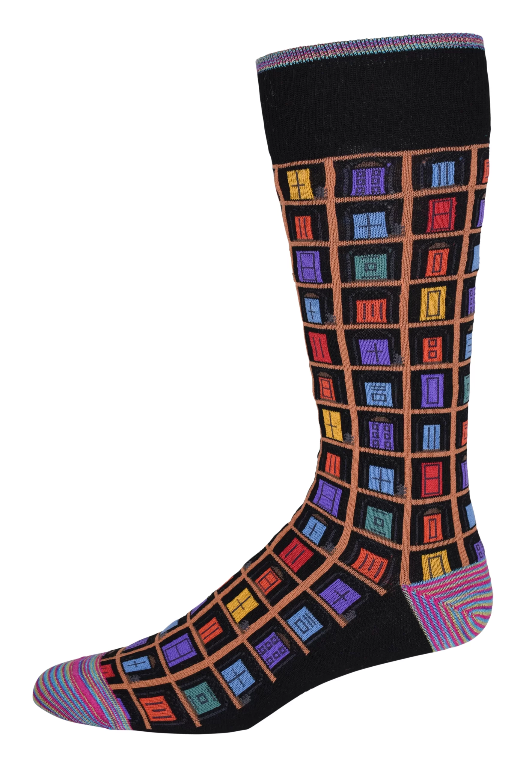 Open the door to standout style with this playful architectural pattern. A vibrant grid of windowpane motifs and colorful doors turns your basic sock into a conversation starter. Reinforced striped panels at the heel and toe deliver the ultimate in comfort and style.
