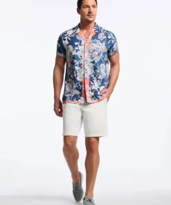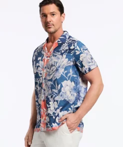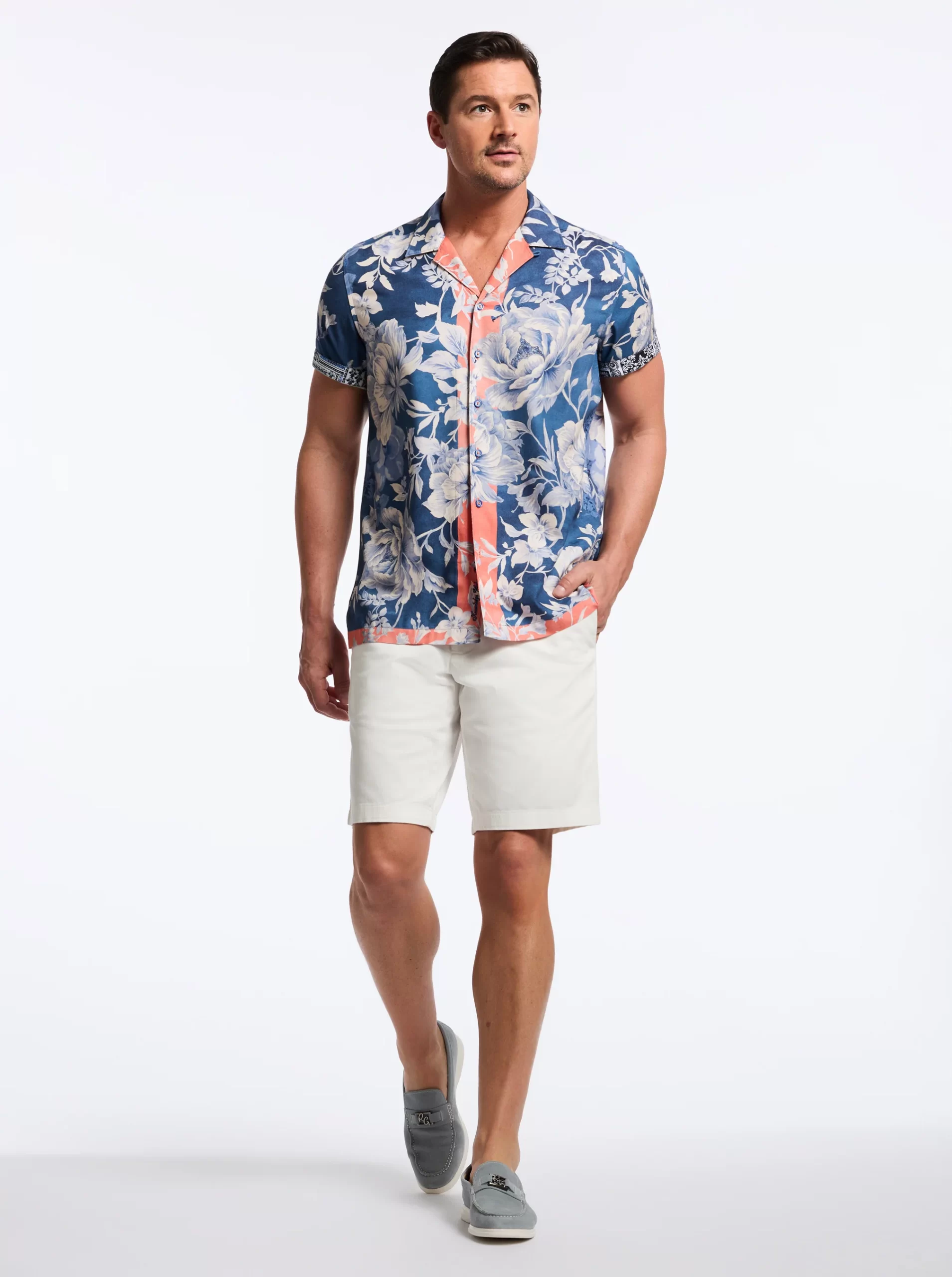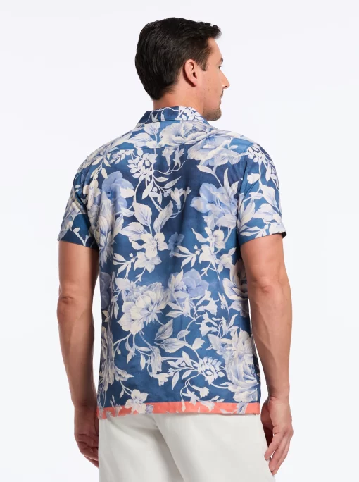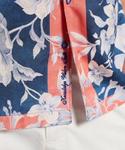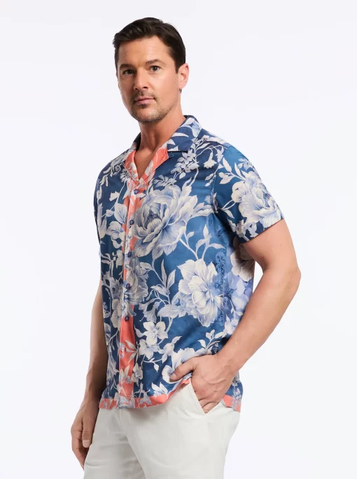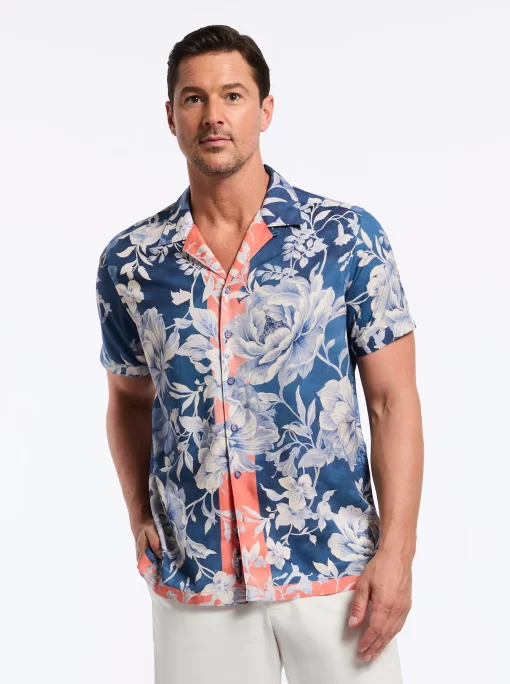 Experience the perfect blend of retro style and modern flair with the Malta shirt. The vibrant peony print adds bold personality, while the navy background and peach border bring a sophisticated touch. The lightweight fabric ensures you stay cool and comfortable all day long, making it perfect for any summertime hang.
