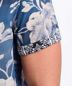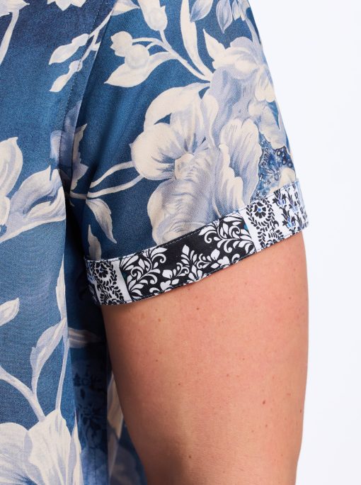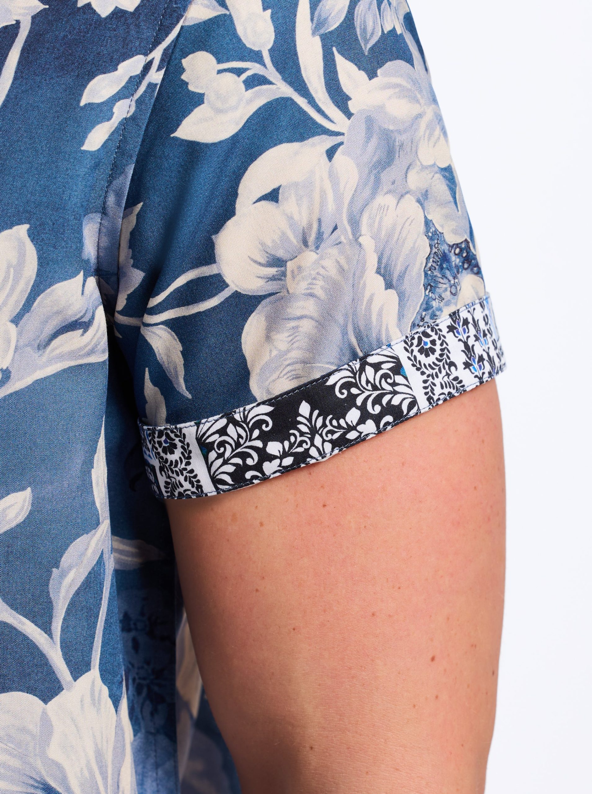 - Contrast print at collar and sleeve