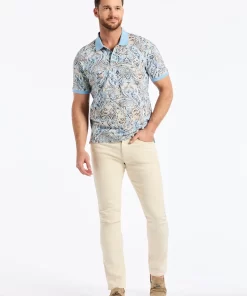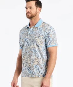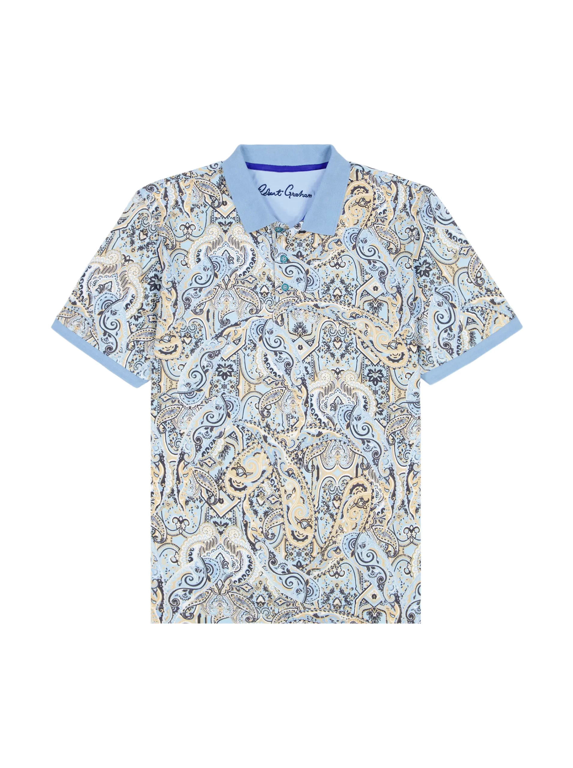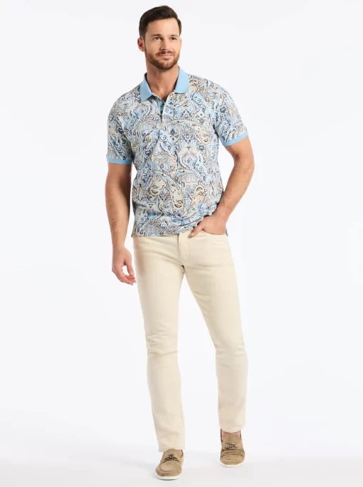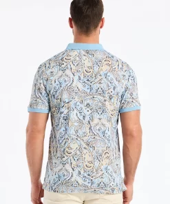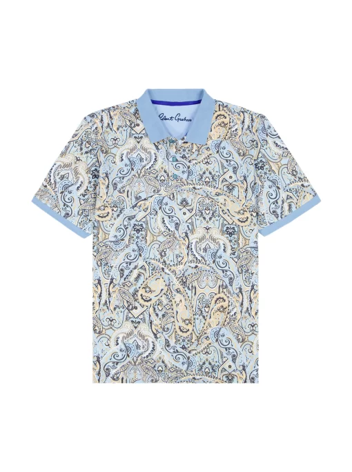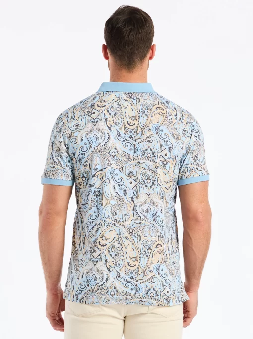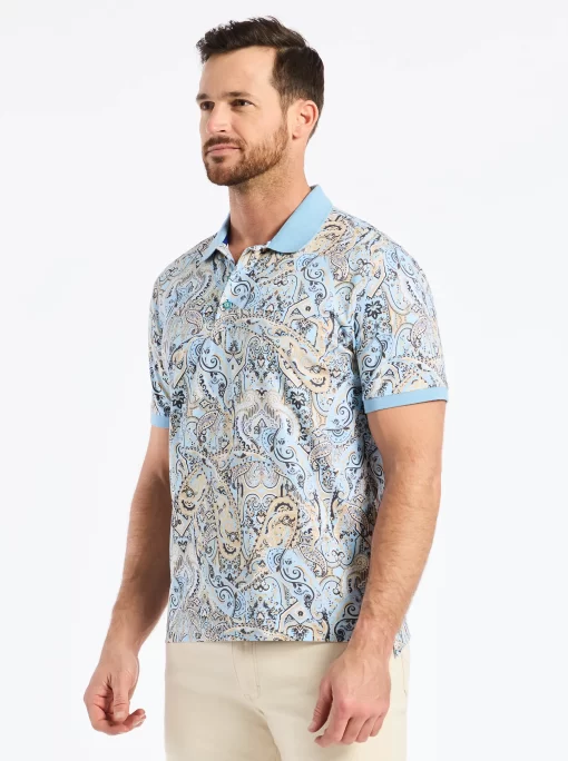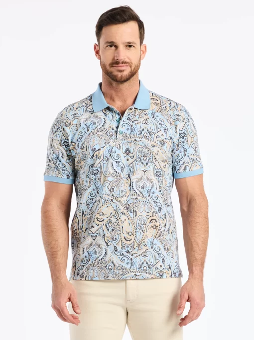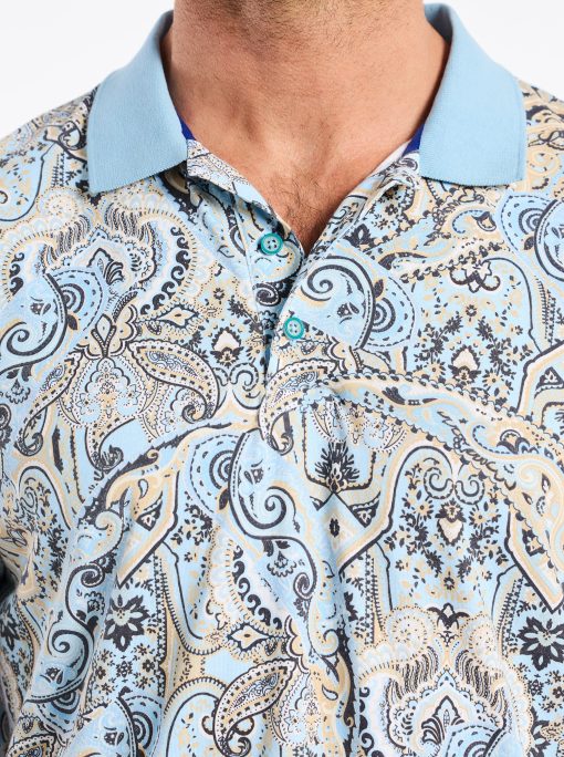 The Manucci polo in soft blue and yellow pastel hues offers a unique take on a classic paisley print. With its subtle yet chic look, this versatile polo effortlessly combines comfort and style, instantly elevating any look.