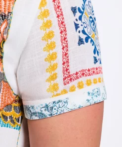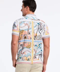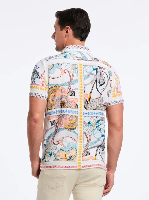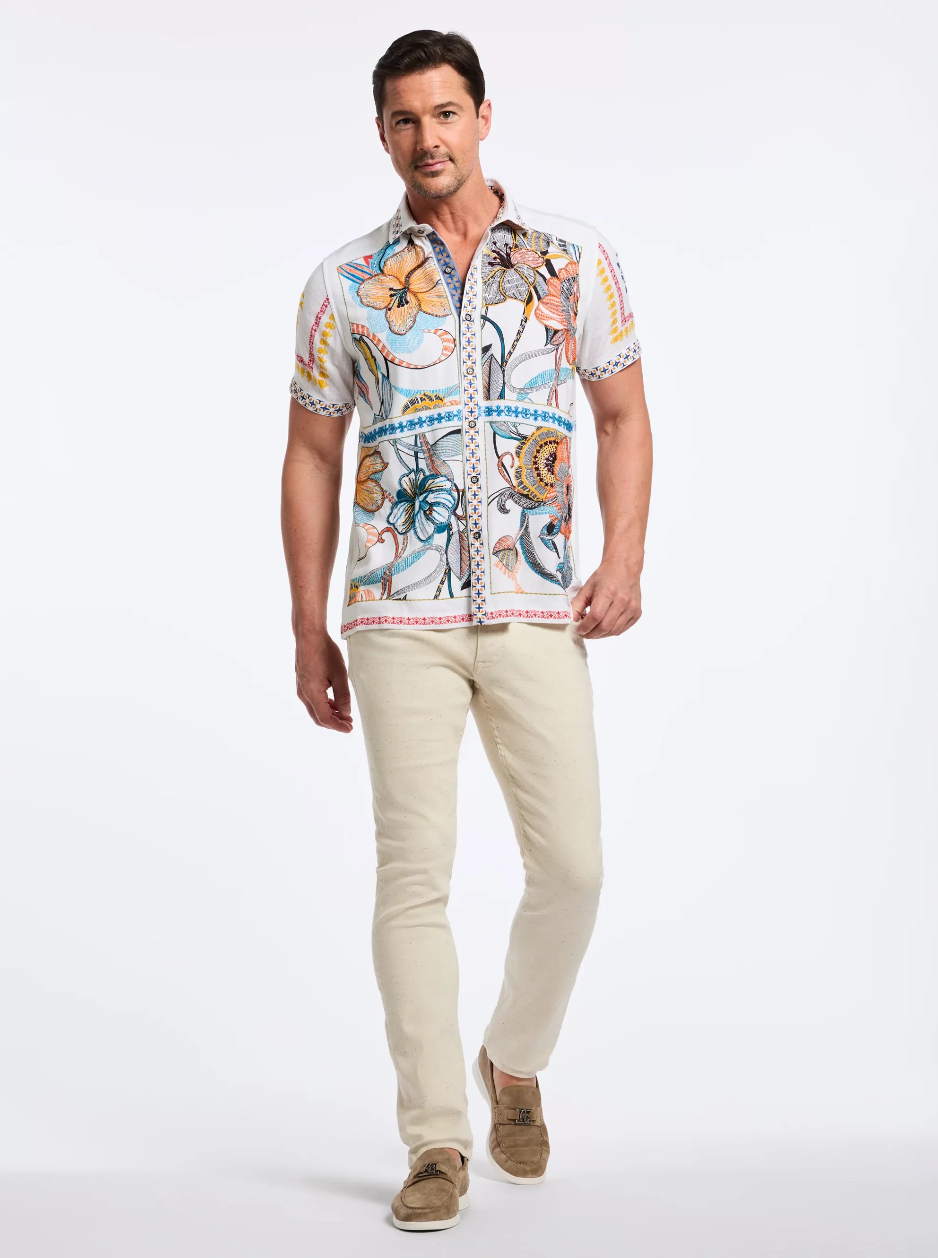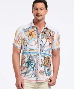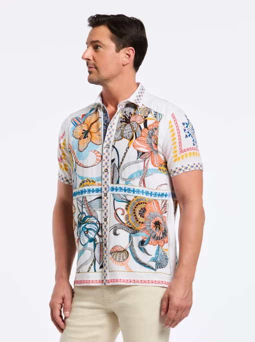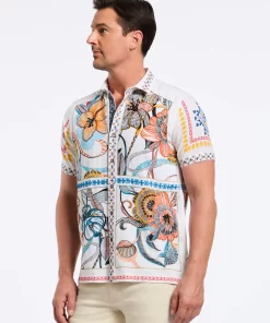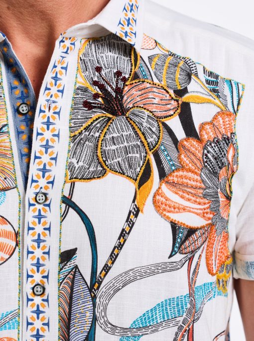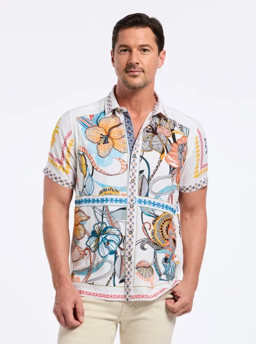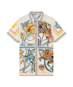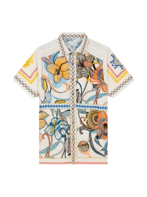 Book your lavish vacation and don’t forget to pack the Manzu shirt. This viscose linen button down is designed to turn heads. With oversized florals and embroidered and beaded details across the front and back, you’ll be cruising in retro 70s vibes with this breezy style.