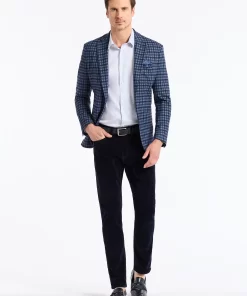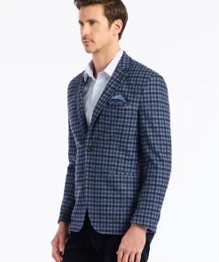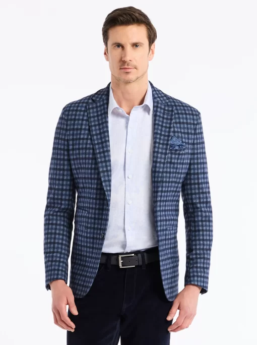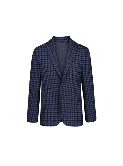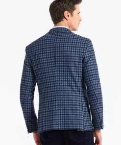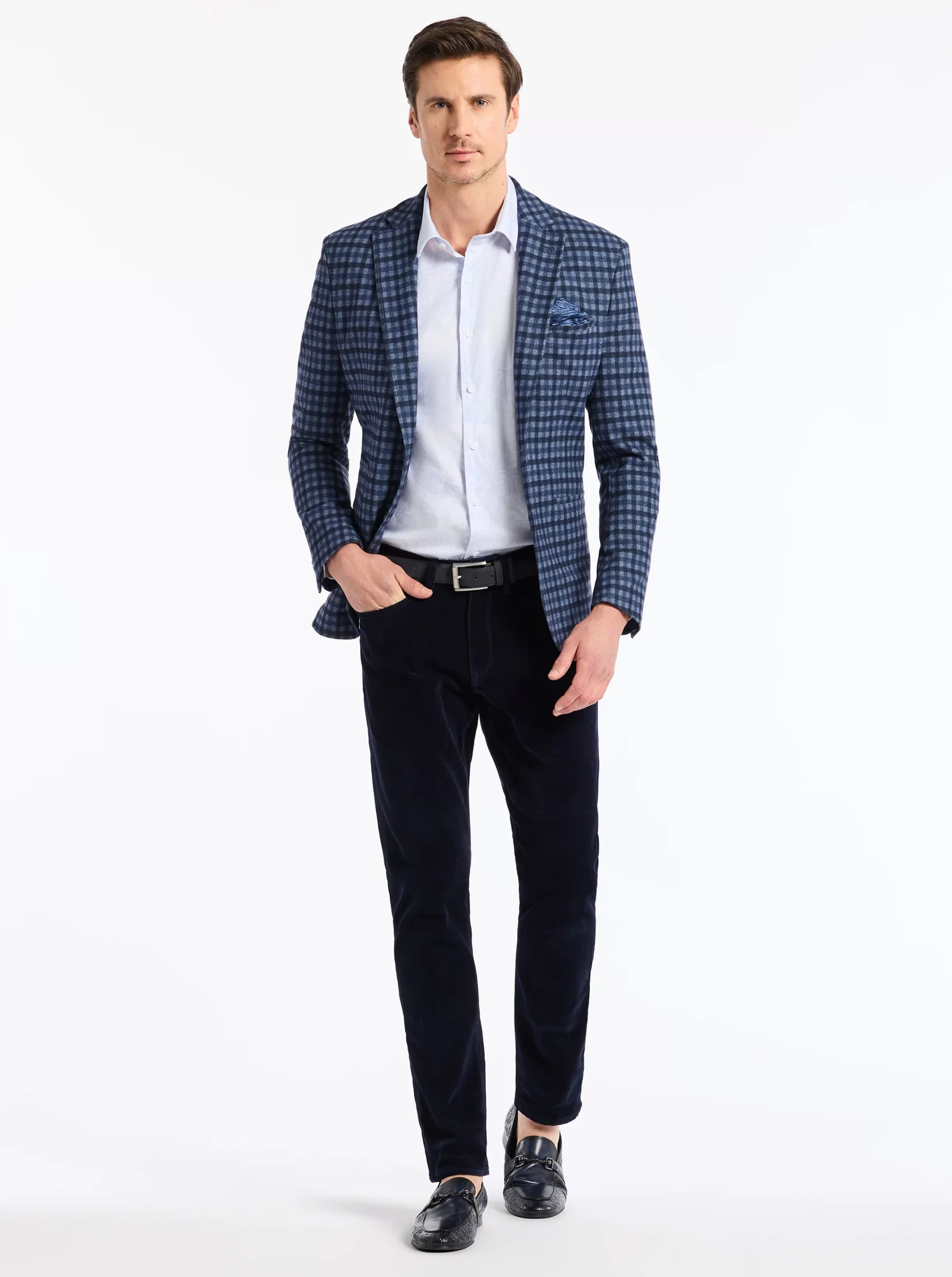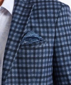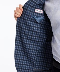 Elegant, yet cozy, the Marvin blazer effortlessly combines comfort with style with its checkered knit exterior and its complementary blue space dye pocket square. At the unlined interior you’ll find two pockets and a contrast piping that matches the exterior pocket square. This style is slightly fitted. It is tailored for a closer-to-the-body fit, with all the RG personality you expect.