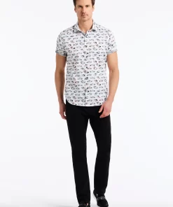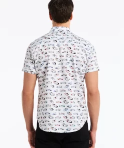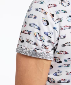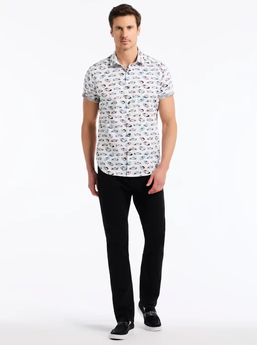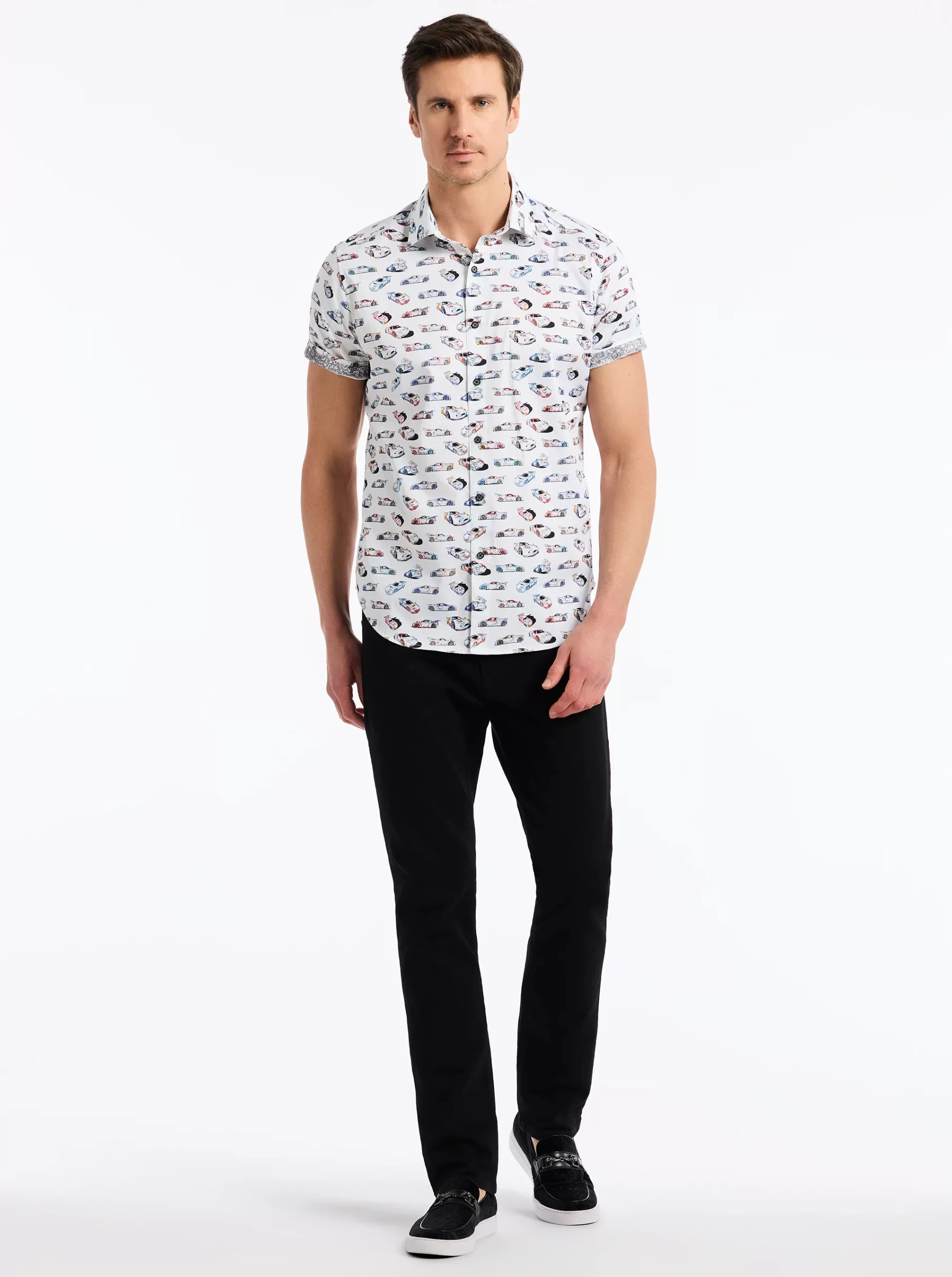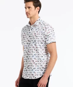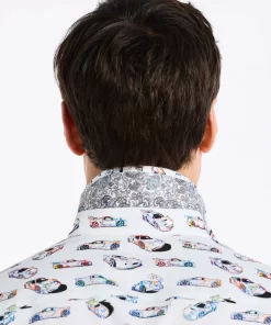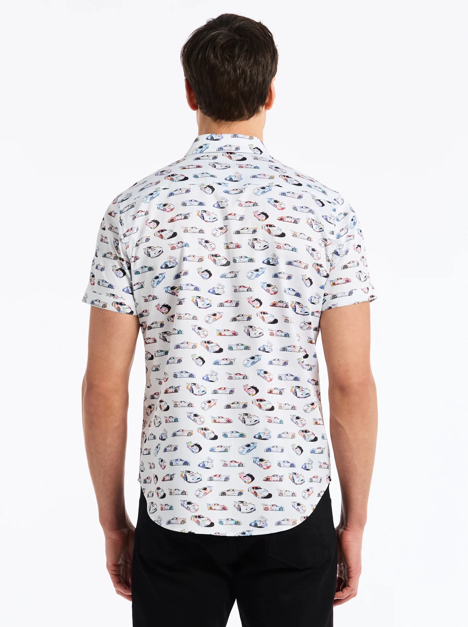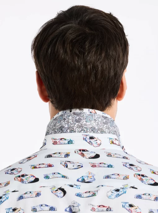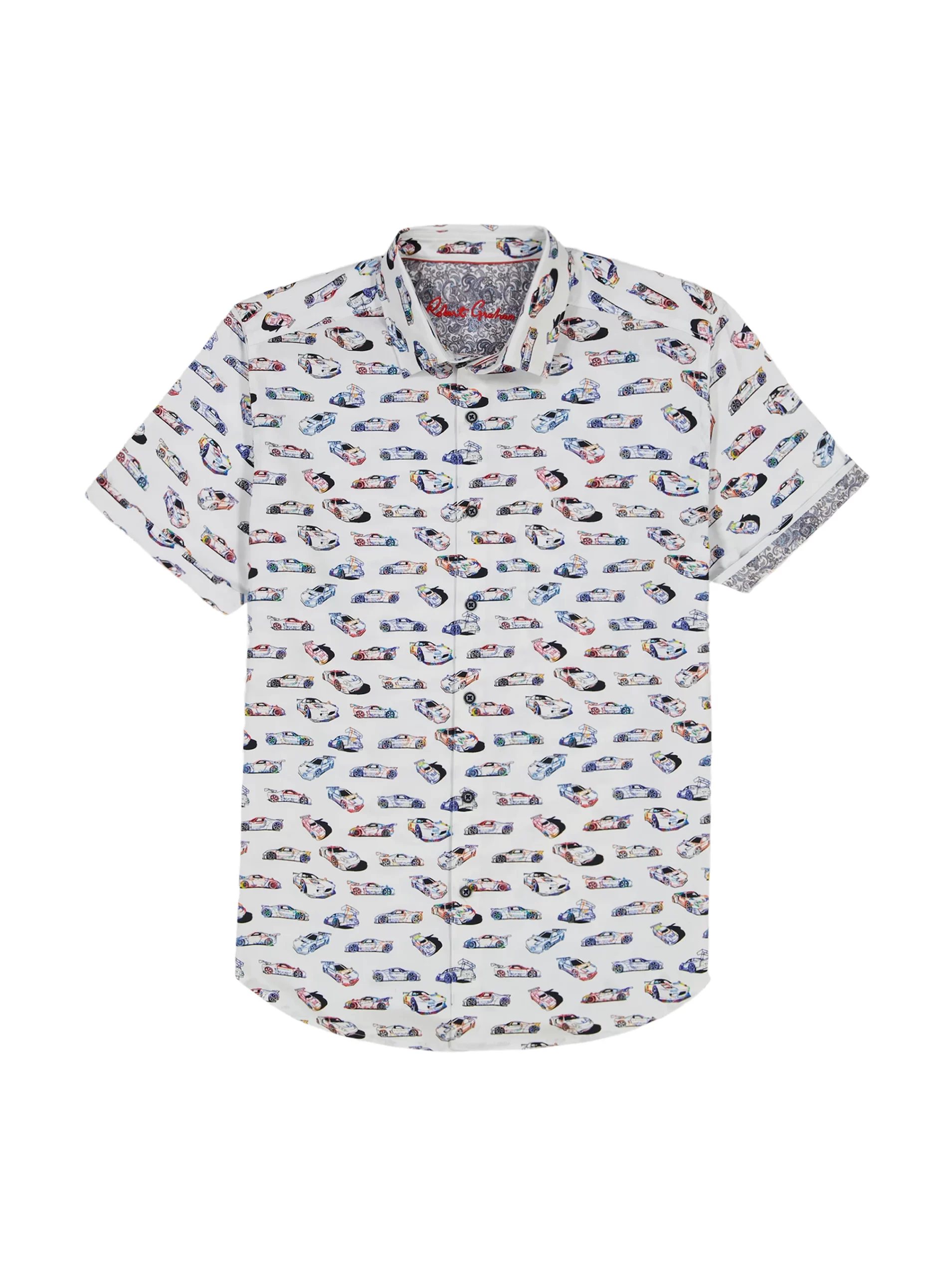 Neon wheels race across a crisp white button down, adding a burst of energy to your wardrobe. This playful shirt features vibrant race cars arranged in a bold, structured pattern that immediately draws the eye. Pop the collar or roll the sleeves to reveal an RG paisley print. Buckle up and get ready to live life in the fast lane.