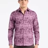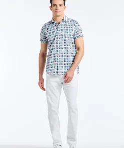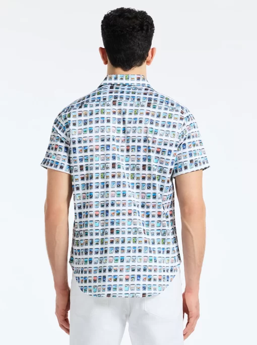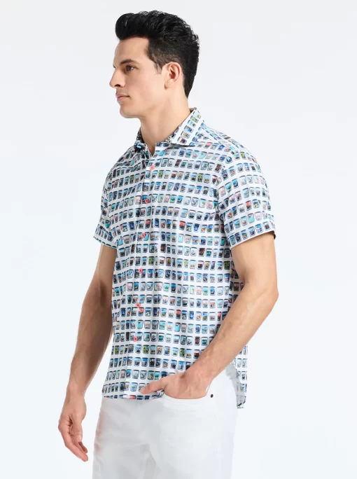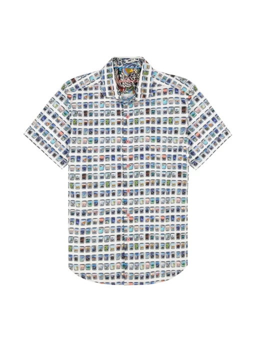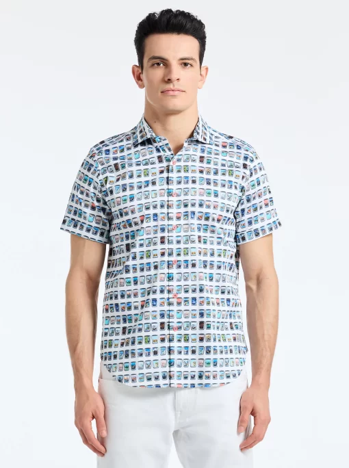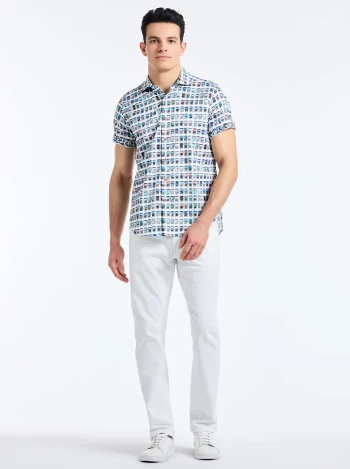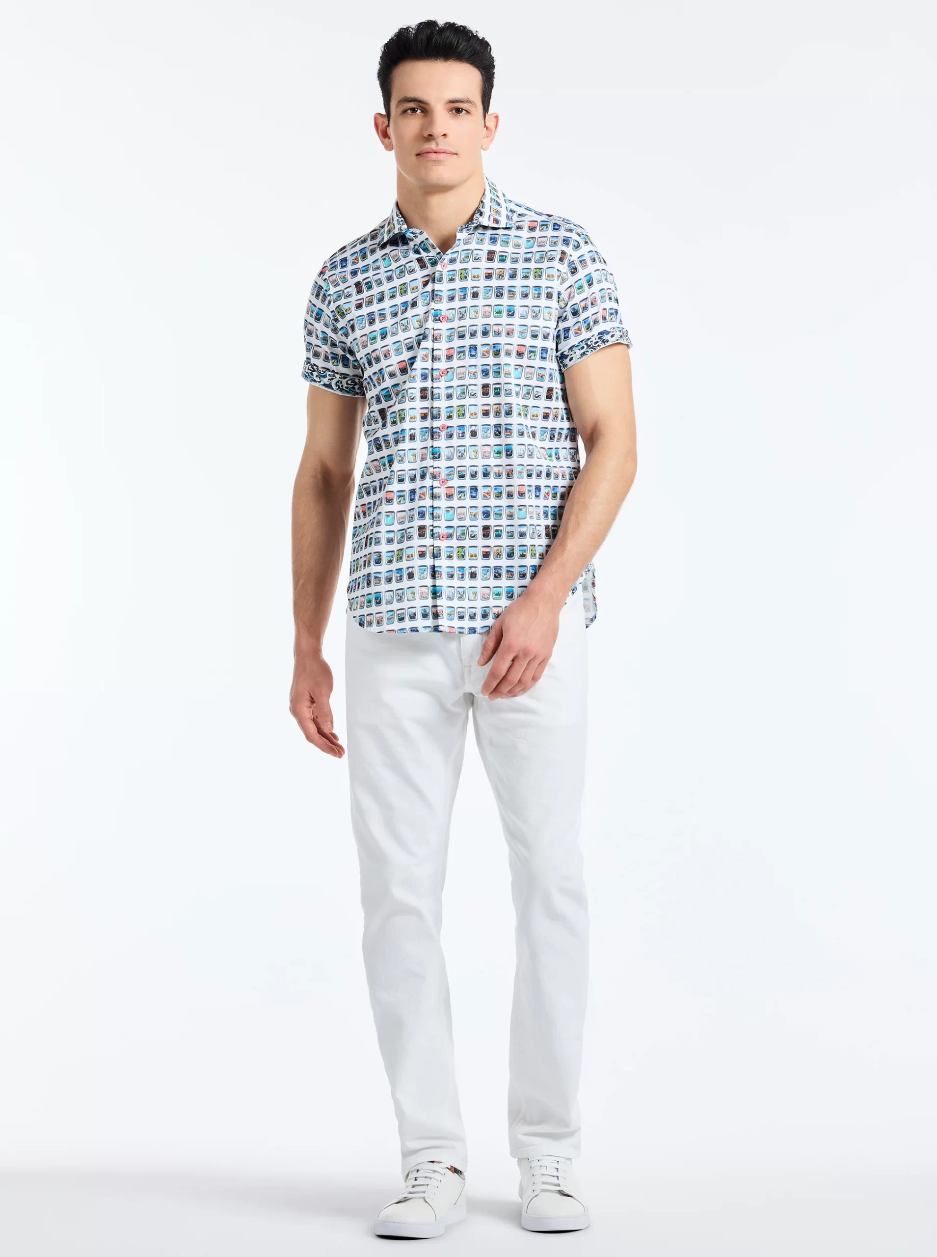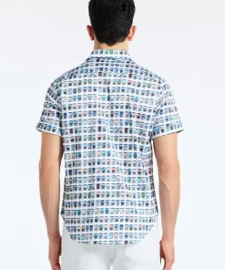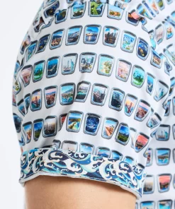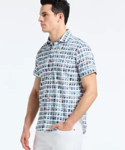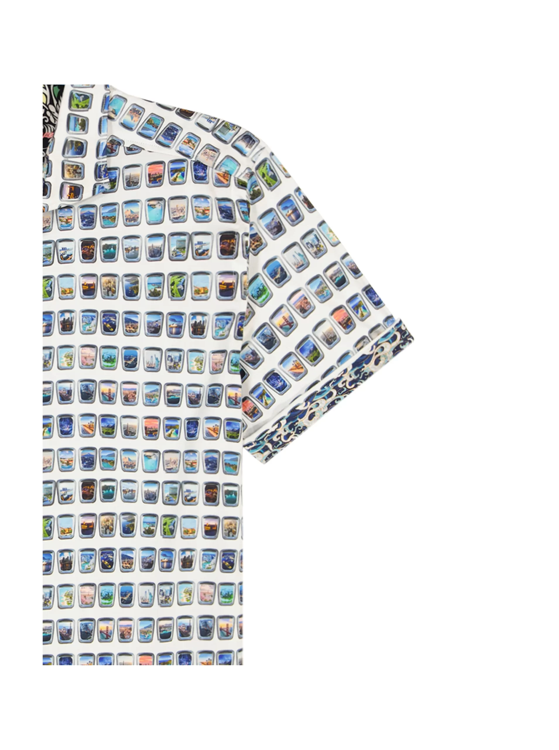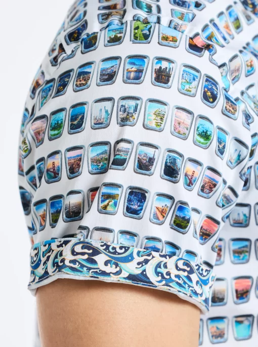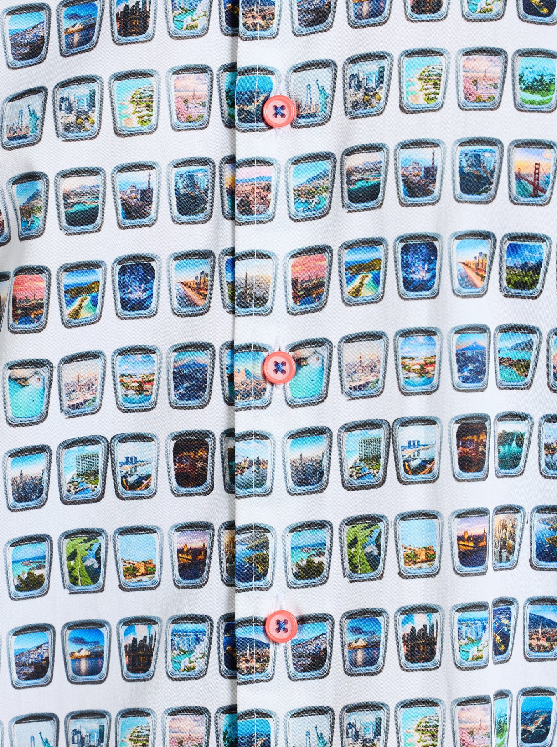Get ready for takeoff in this printed short sleeve style. Come in for a closer look and discover miniature airplane window views that will have you dreaming of your next adventure. Adding a touch of nautical flair, a contrast ocean wave print hides at the collar and cuff.