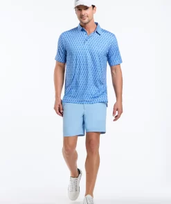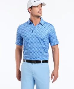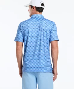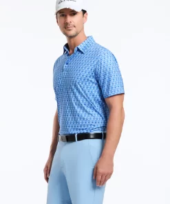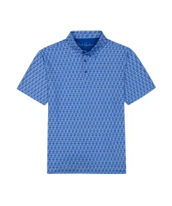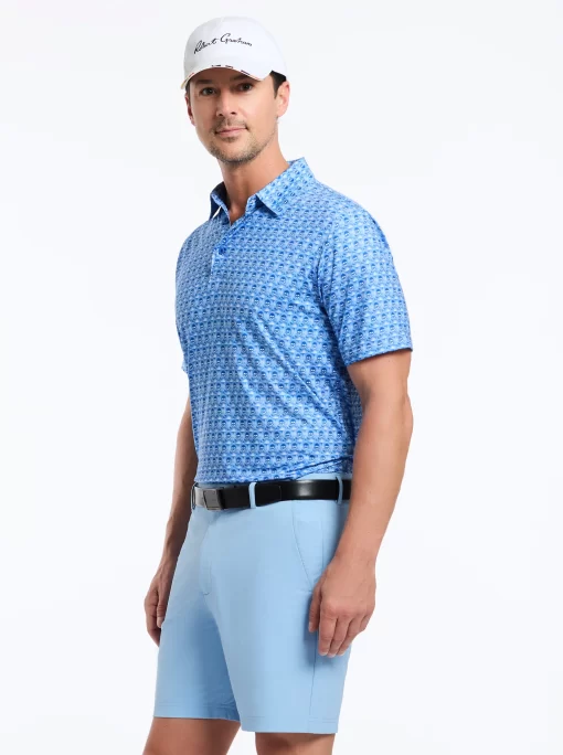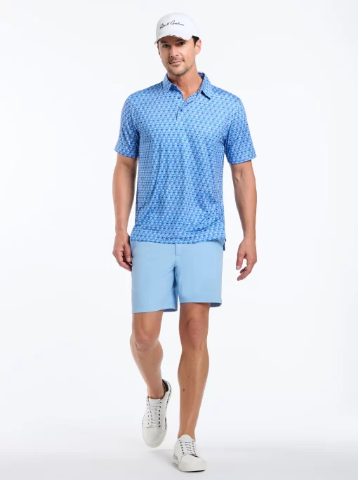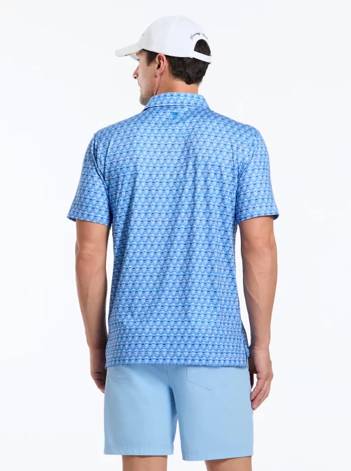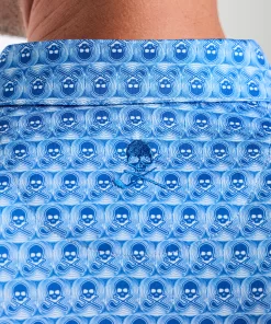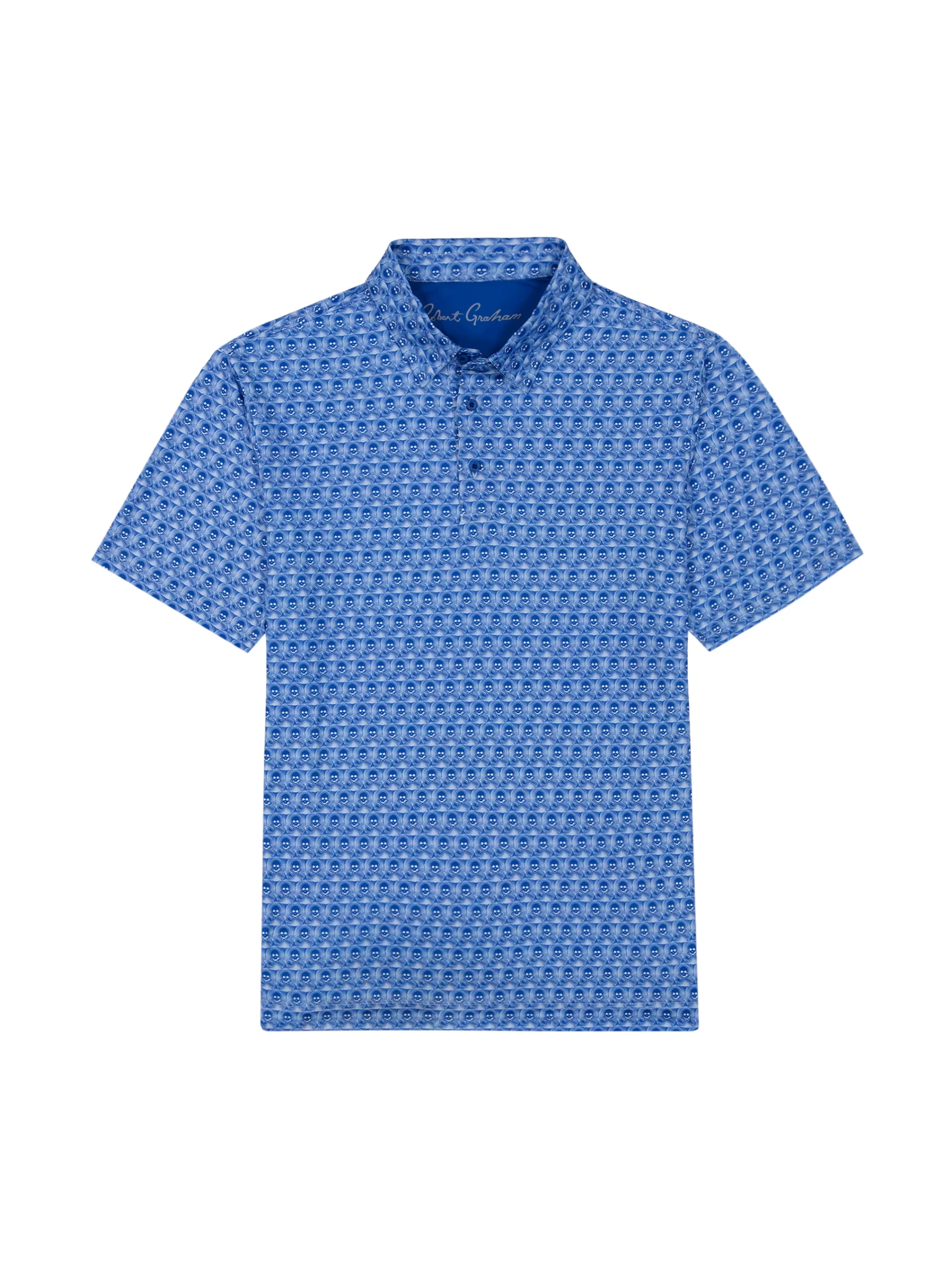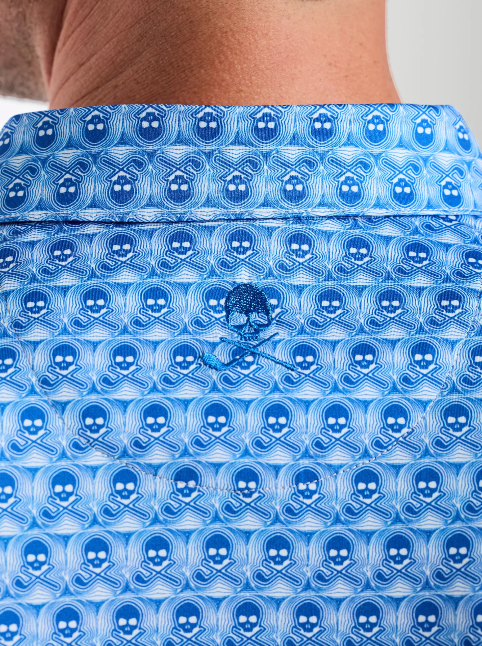 A basic polo from afar becomes an interesting fashion piece up close. Notice the micro skull-and-cross club print that creates an unexpected allover design.
