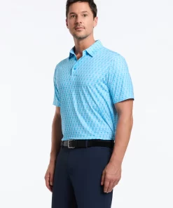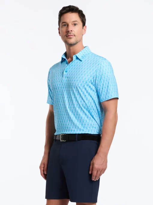 A basic polo from afar becomes an interesting fashion piece up close. Notice the micro skull-and-cross club print that creates an unexpected allover design.