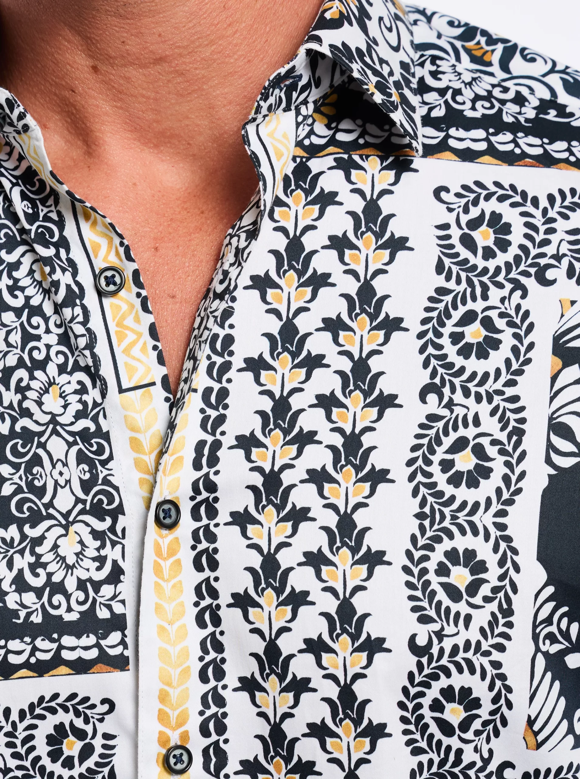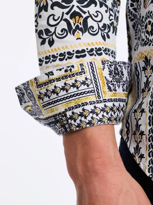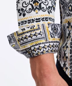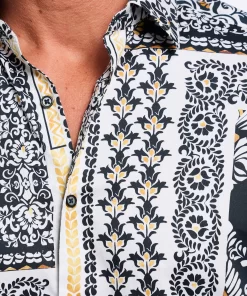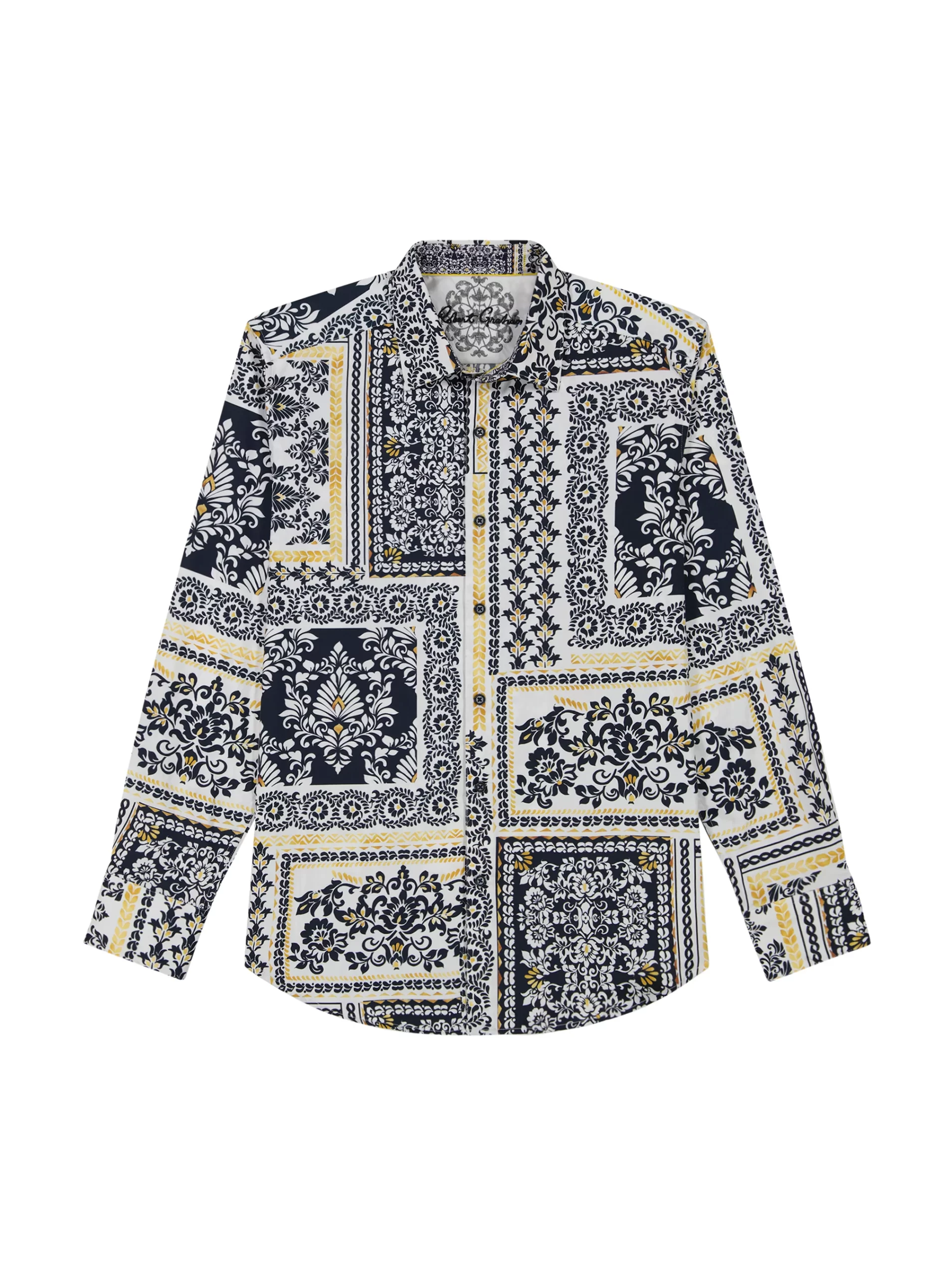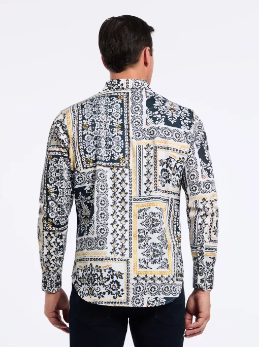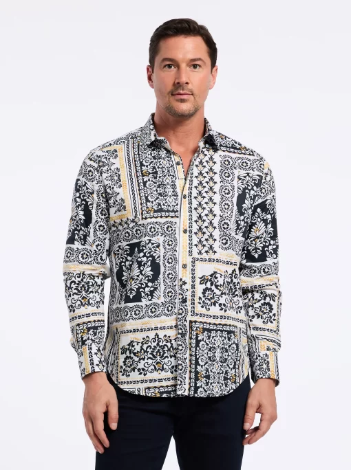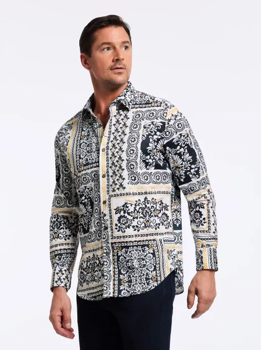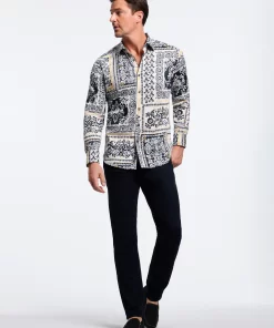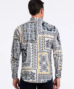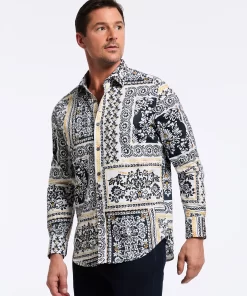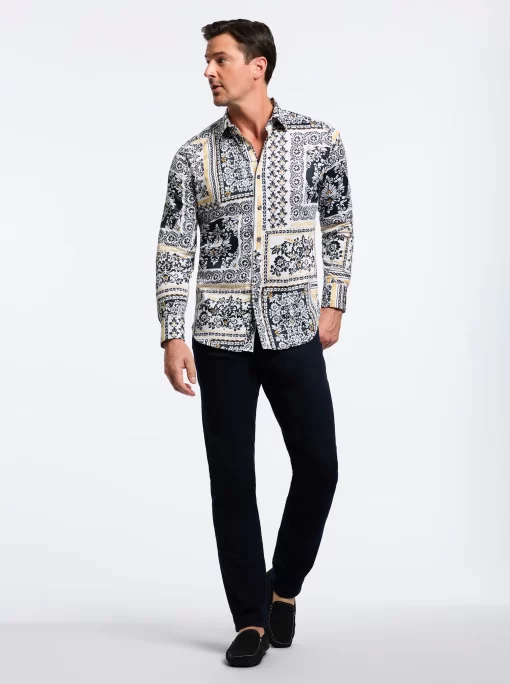 Enjoy the perfect mix of comfort and style with this cotton stretch shirt. The luxurious satin stretch fabric moves with you for all-day comfort, while the vibrant paisley bandana print adds a touch of personality. This versatile piece is perfect for any occasion, from workday to weekend adventures.