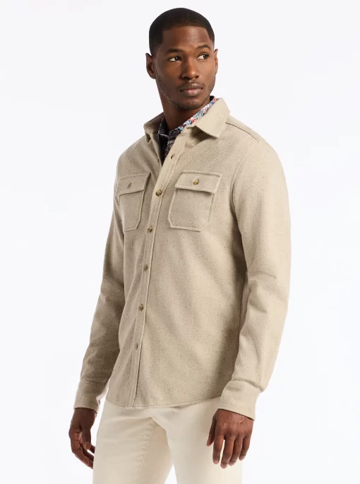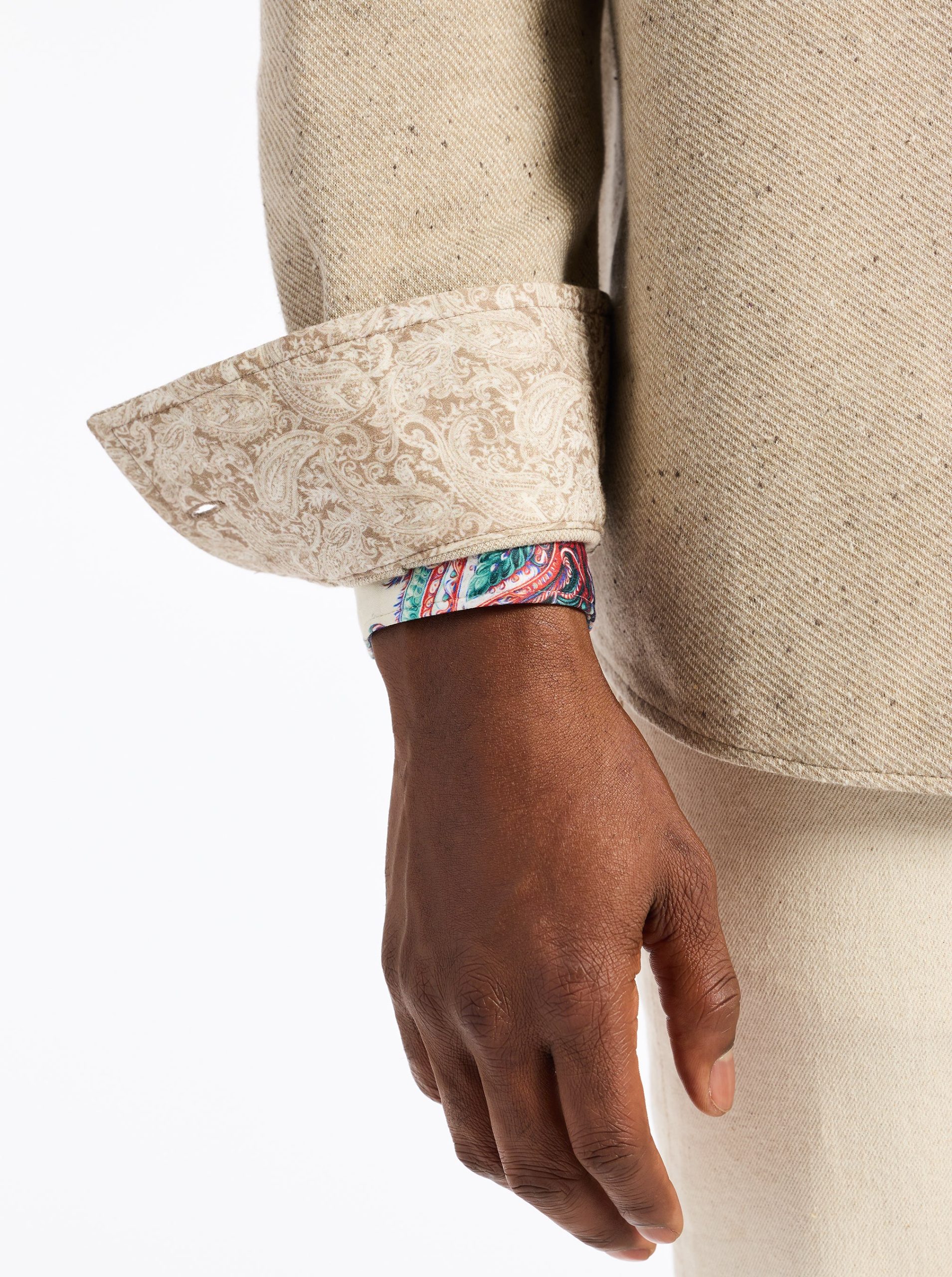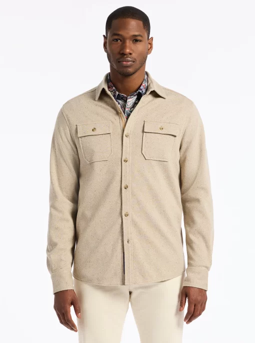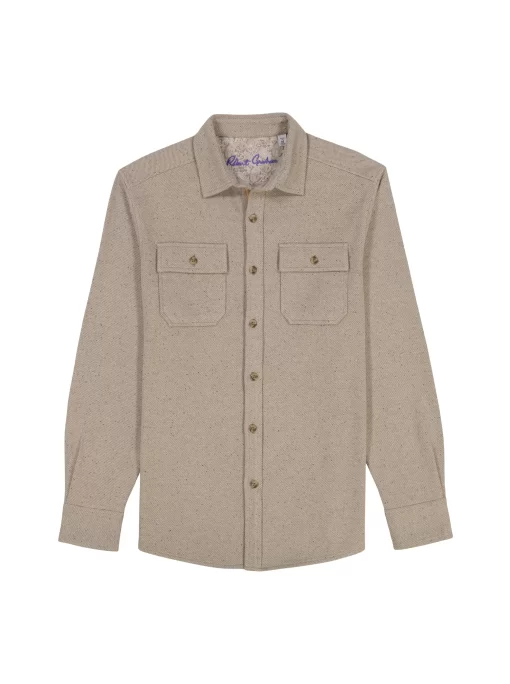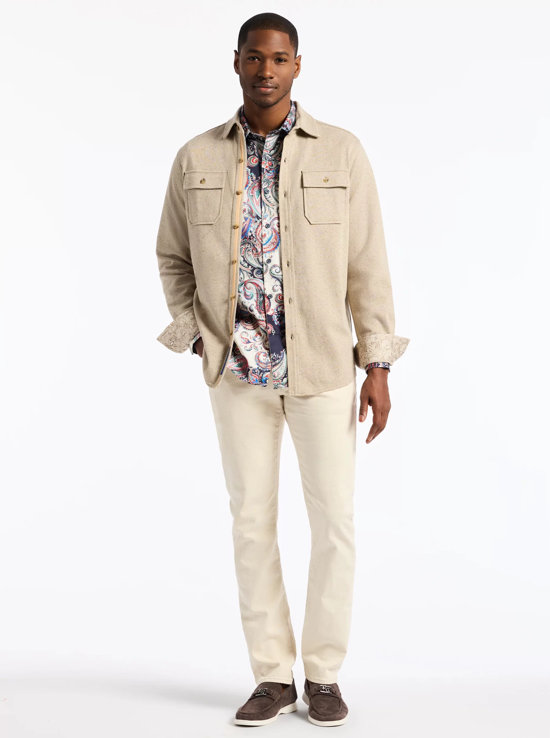 The Vigano knit shirt jacket is the perfect blend of style and function. The textured look of the fabric adds a touch of sophistication and warmth, while the two button-front pockets balance utility with aesthetic appeal. For a personalized touch, pop the collar or roll the cuffs to reveal a contrast paisley print that adds character to this versatile piece. Perfect layering piece over any of Robert Graham shirts.
