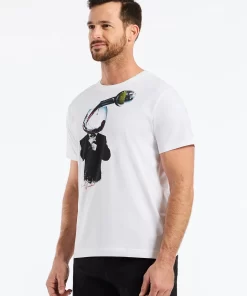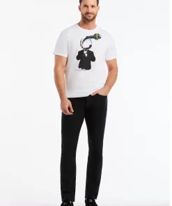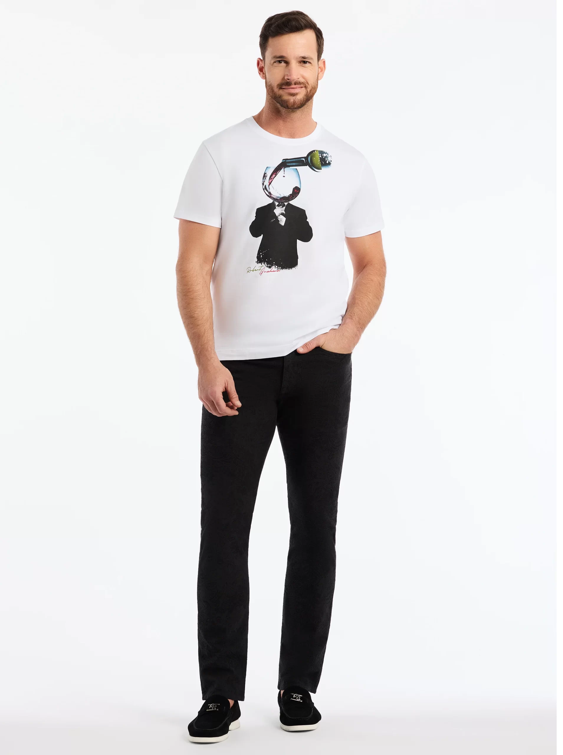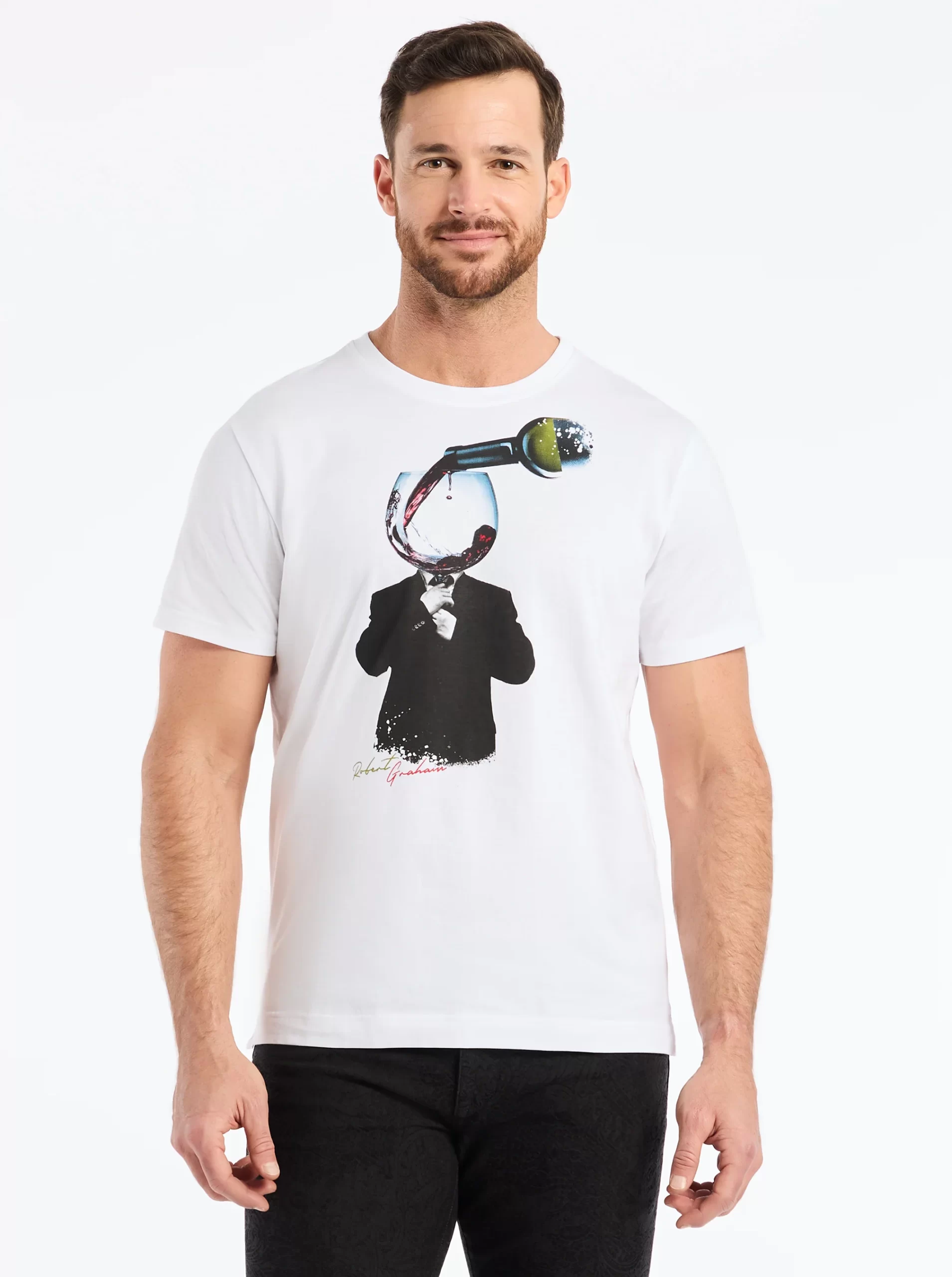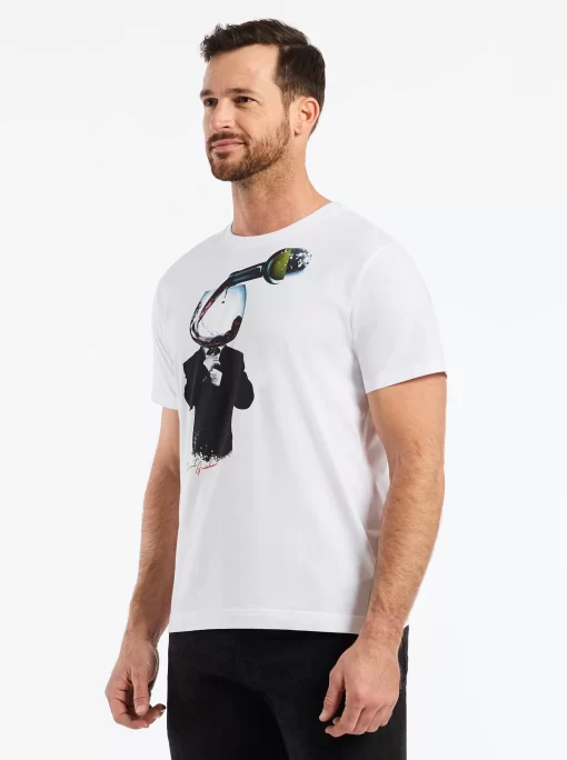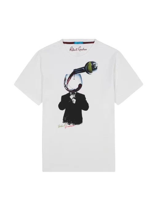 Make a statement in this striking white tee featuring a bold surrealist print. A dapper RG Wine Man in a formal suit casually adjusts his tie as a perfect pour of red wine goes straight to his head. It’s a playful, conversation starter that blends humor with sharp style.