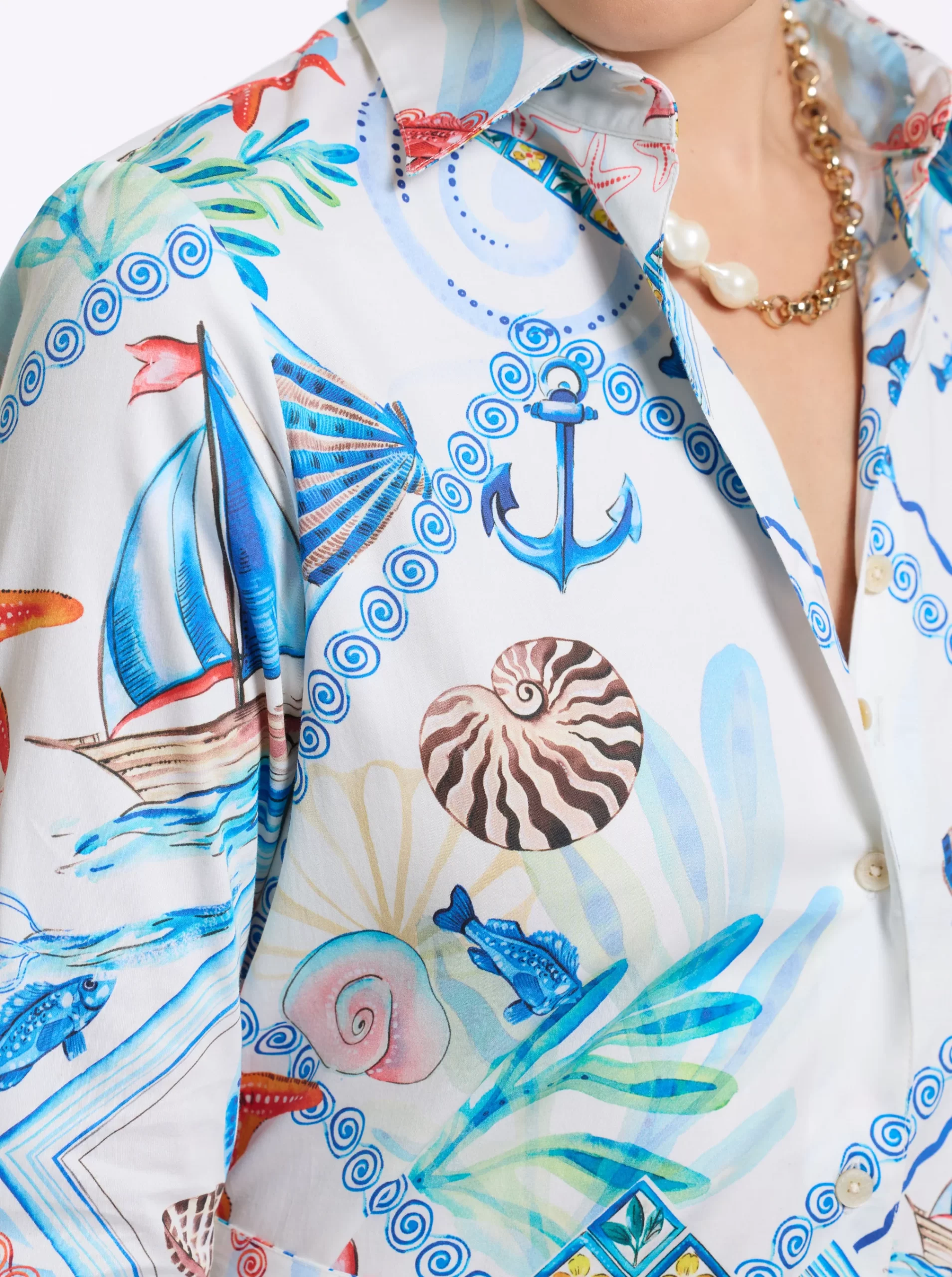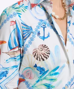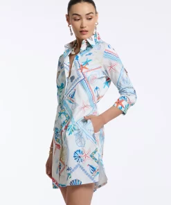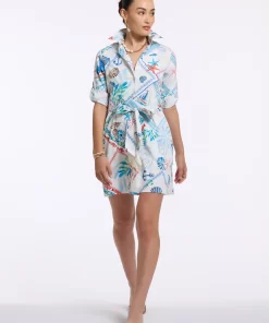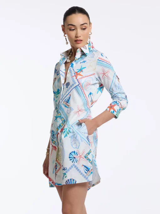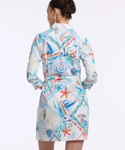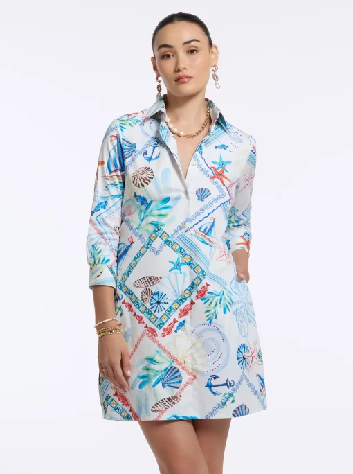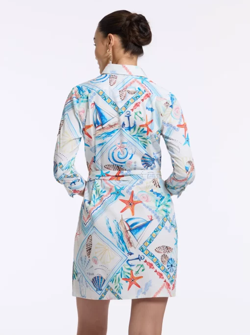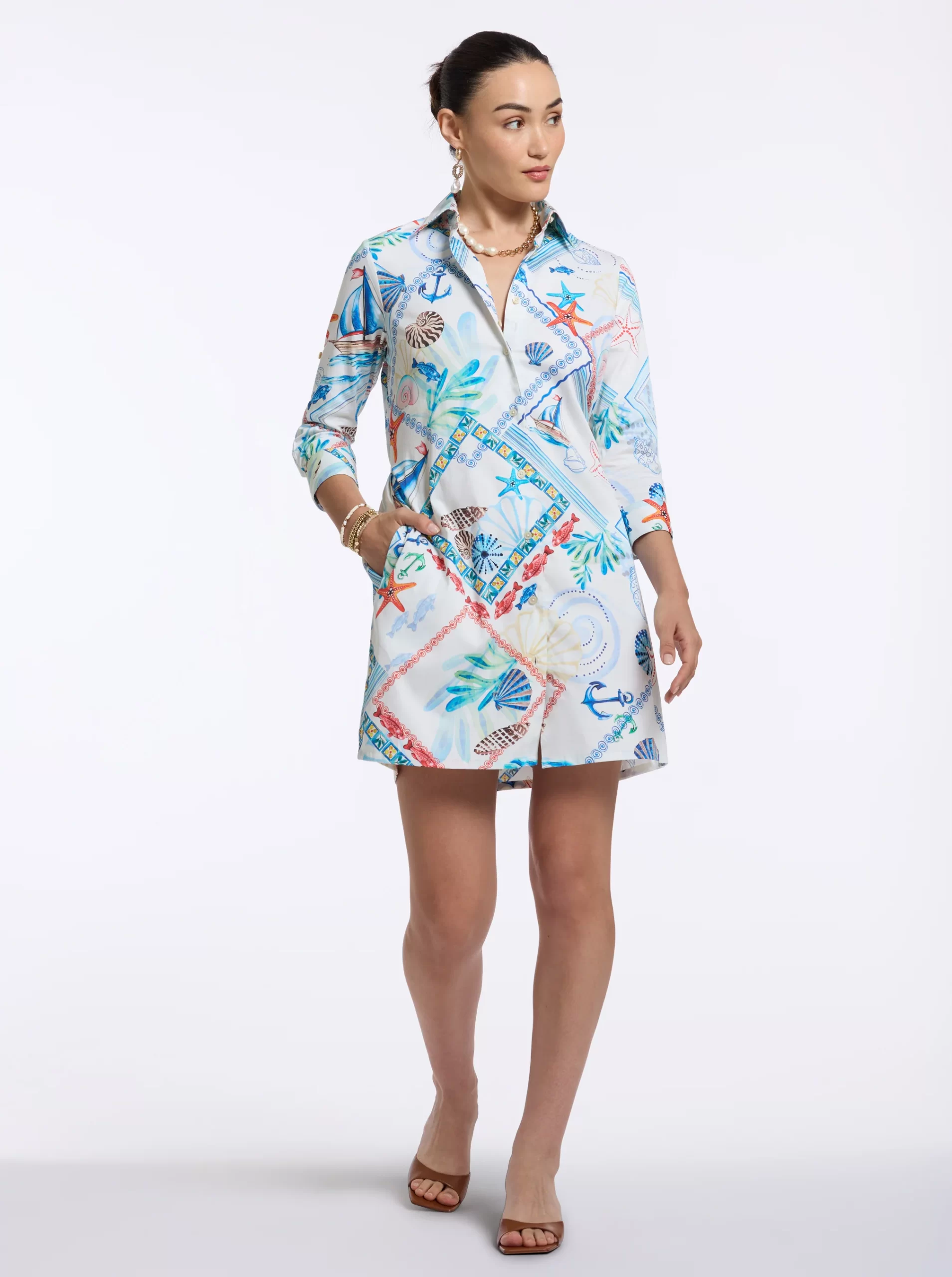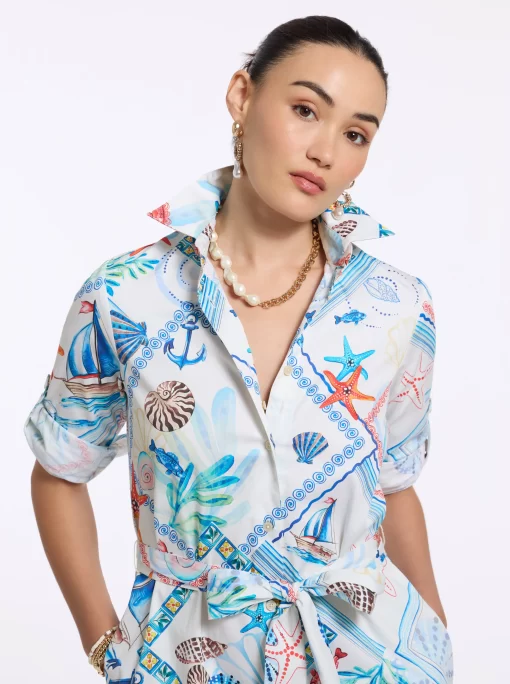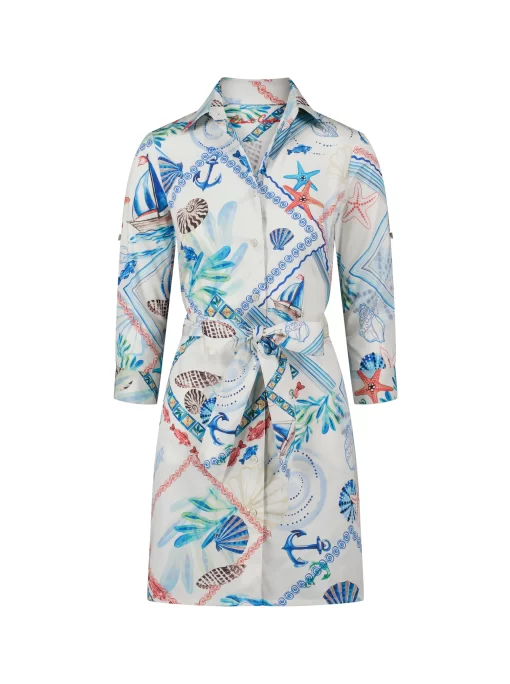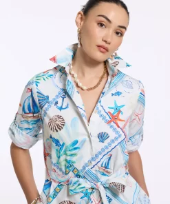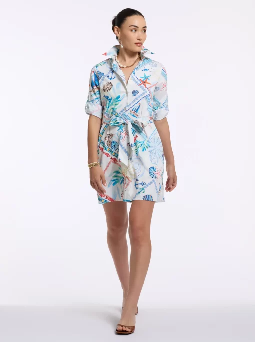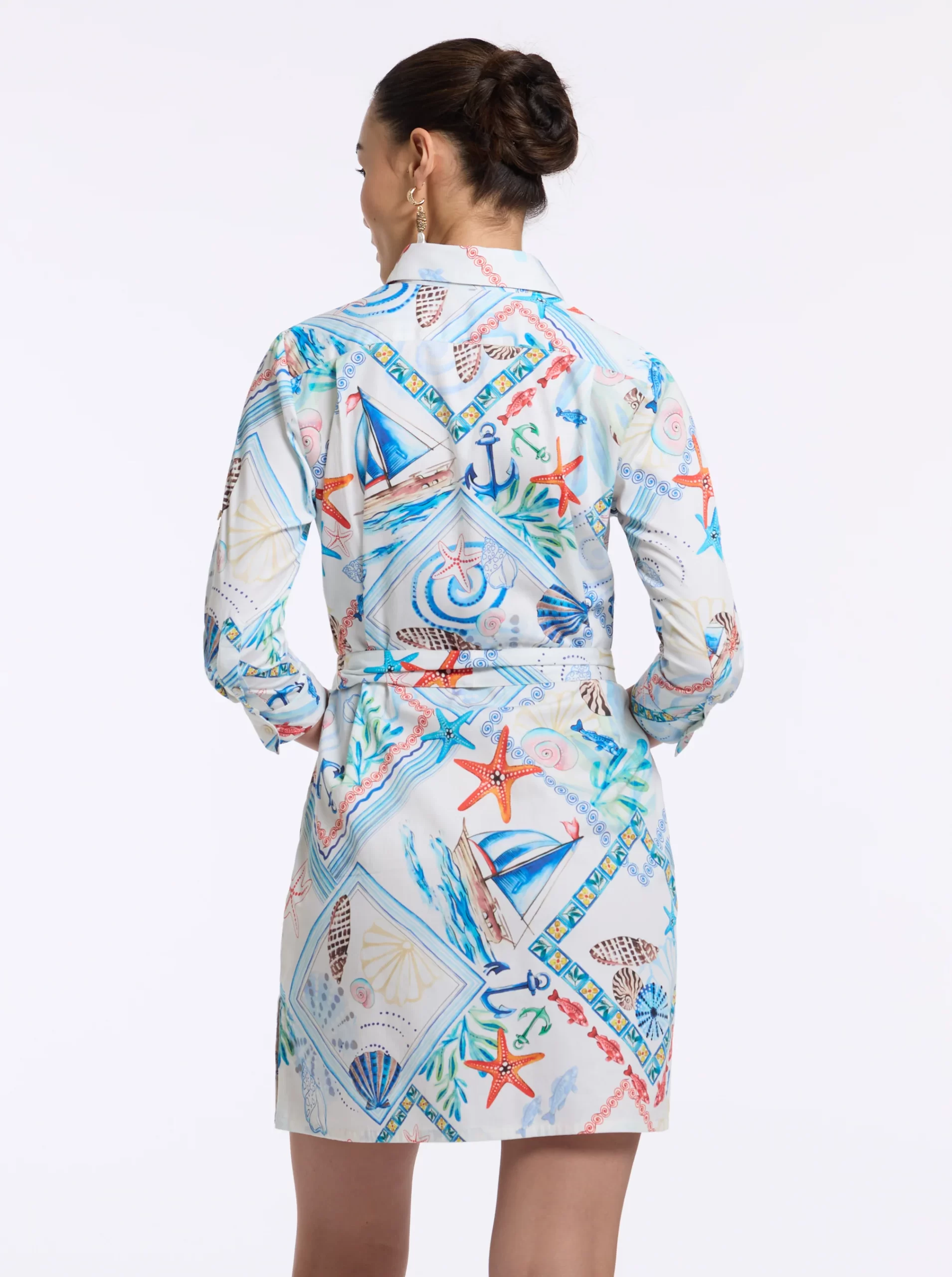 This casual shirtdress in a playful nautical print instantly evokes summer vibes wherever you go. The full-button front placket, adorned with novelty buttons and a self-tie belt, adds a relaxed, easygoing touch. Your perfect go to dress for any Summer day.