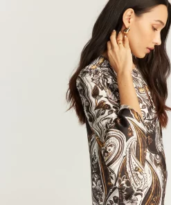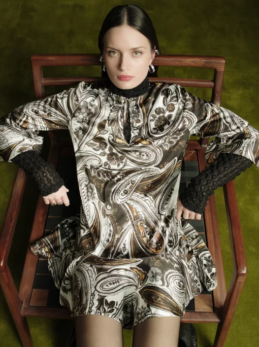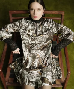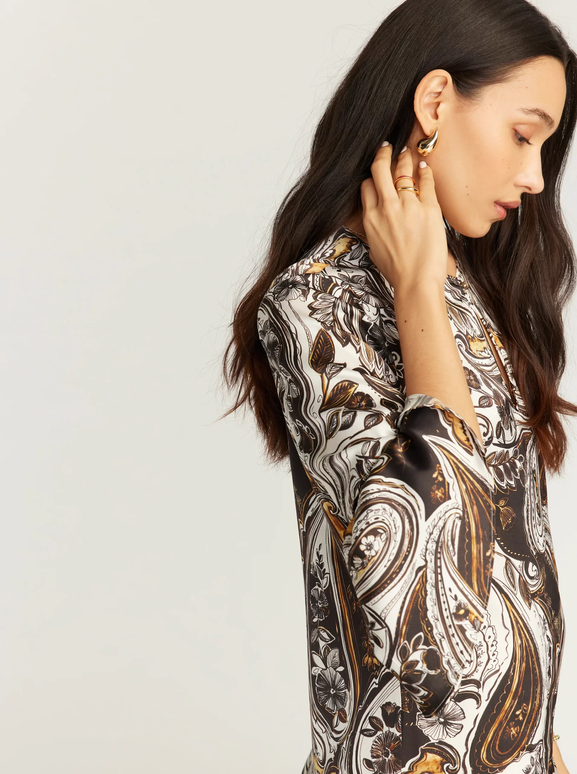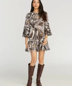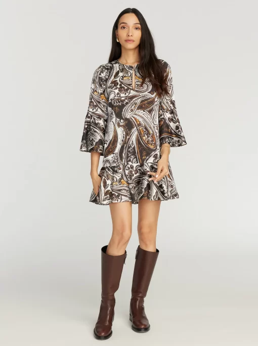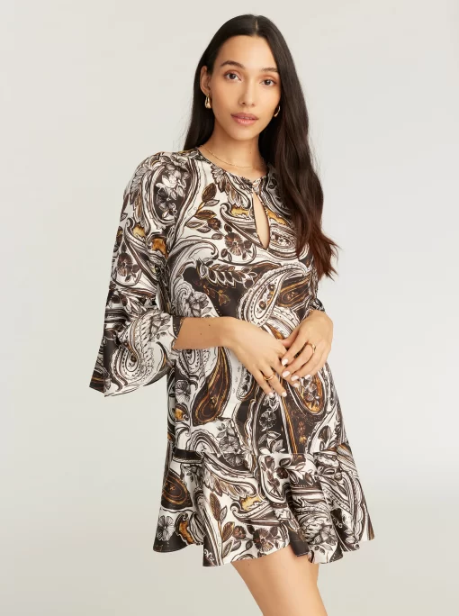 Slip on this relaxed fit dress and feel the retro vibes. 3/4 sleeves and an A-line silhouette are accentuated with the ruffle hemline. Notice the flirty keyhole opening with novelty button.