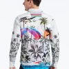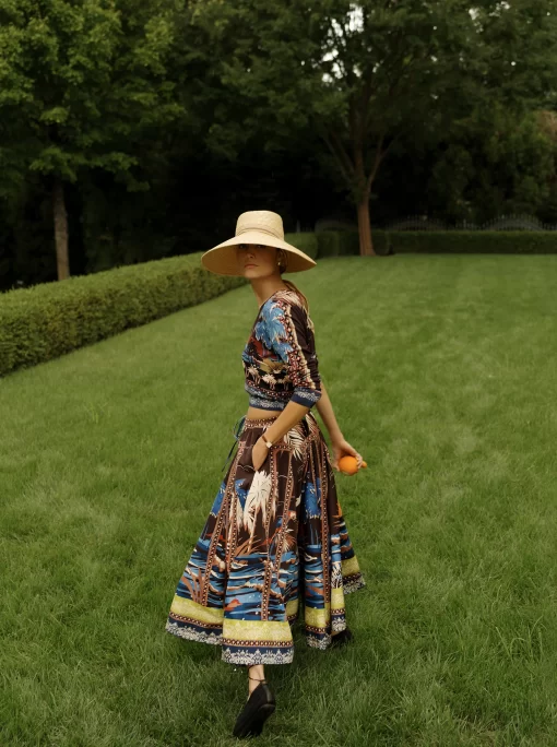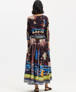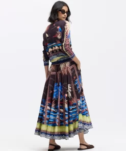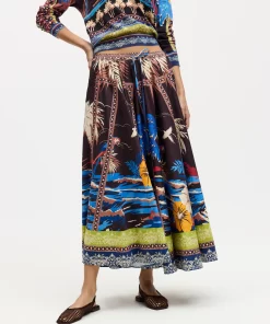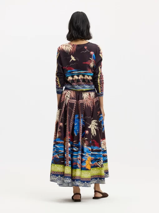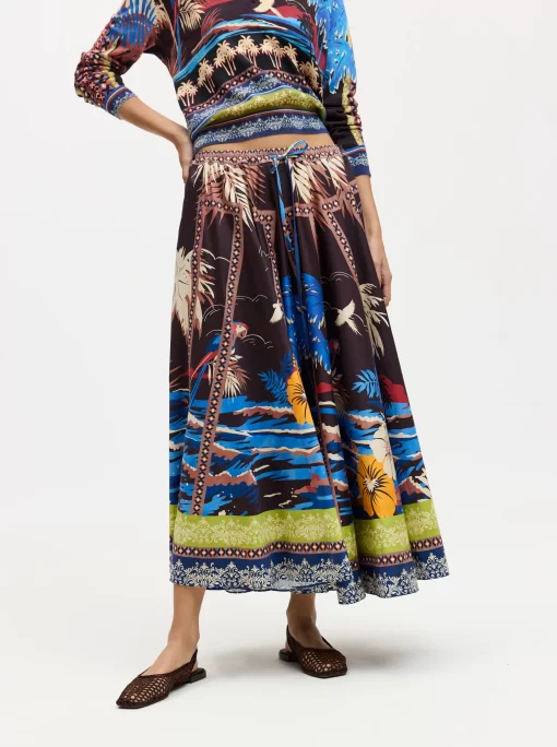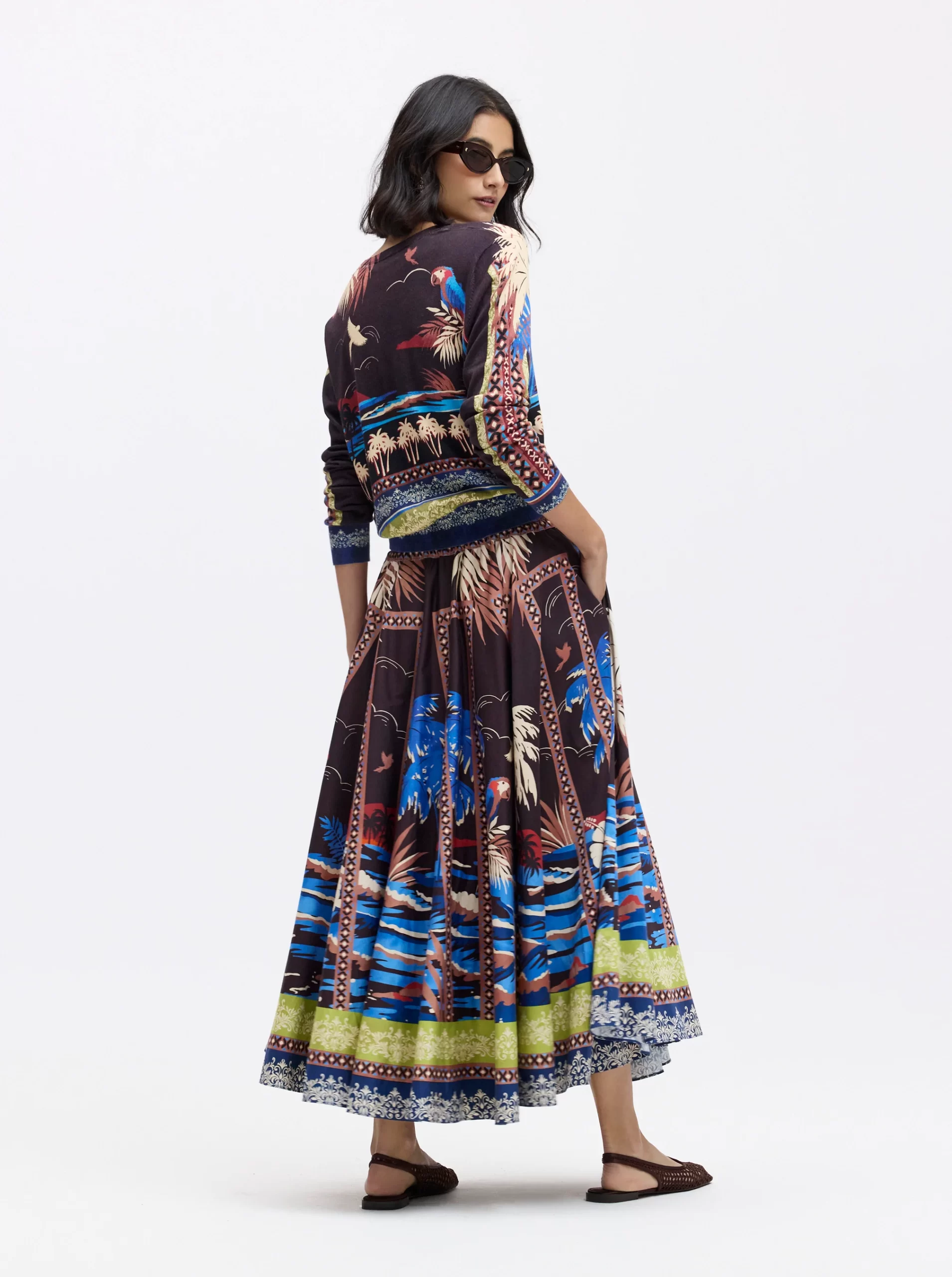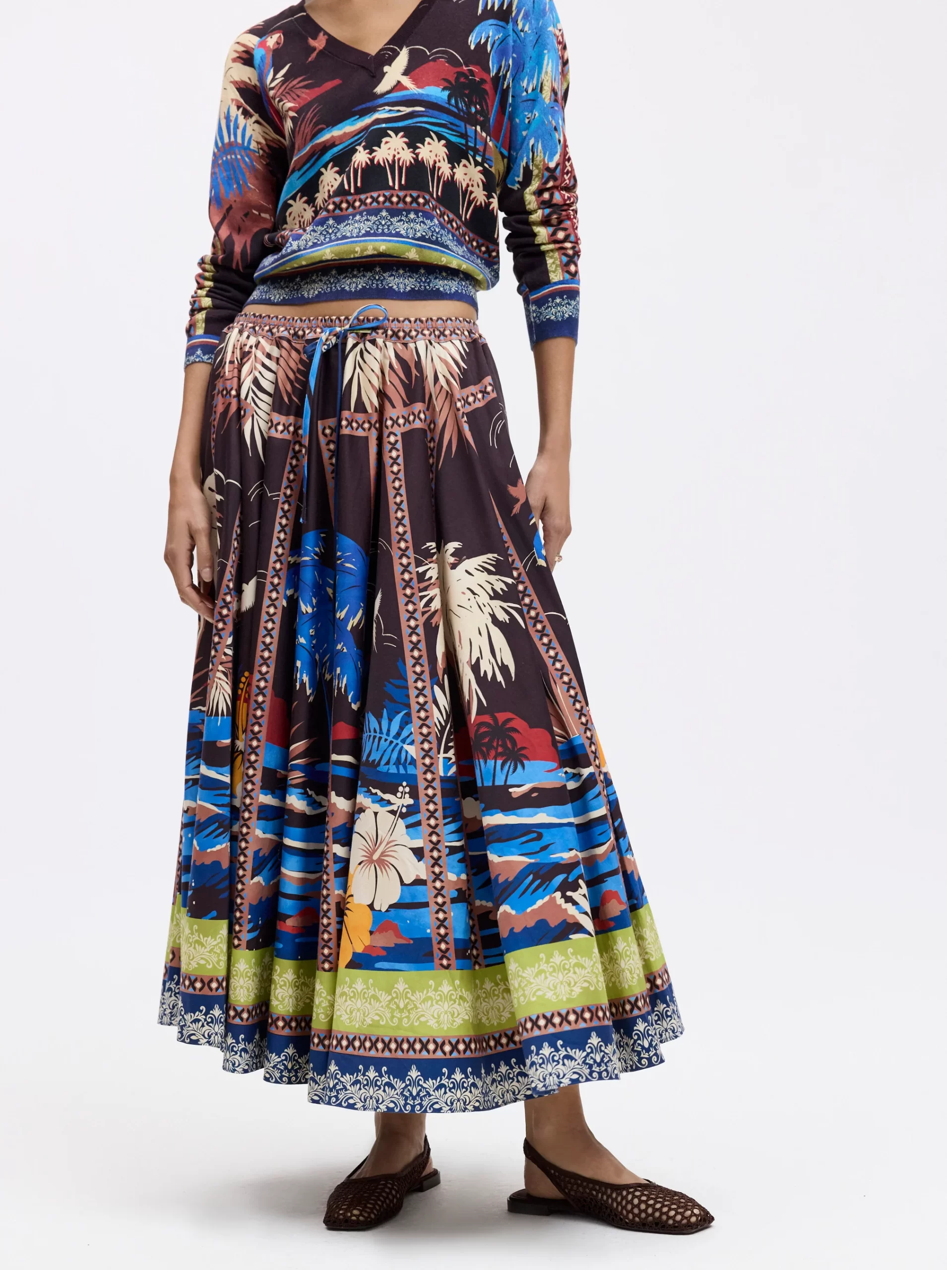 The Skylar skirt is a show-stopping piece. This circle skirt style will immediately draw the eye to the moody sunset beach scene and vivid patterns. Pair with the matching Evelyn sweater for a head-to-toe look that’s sure to turn heads.