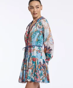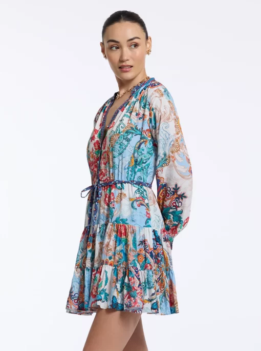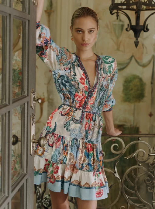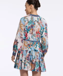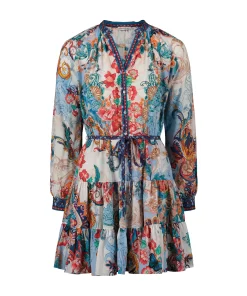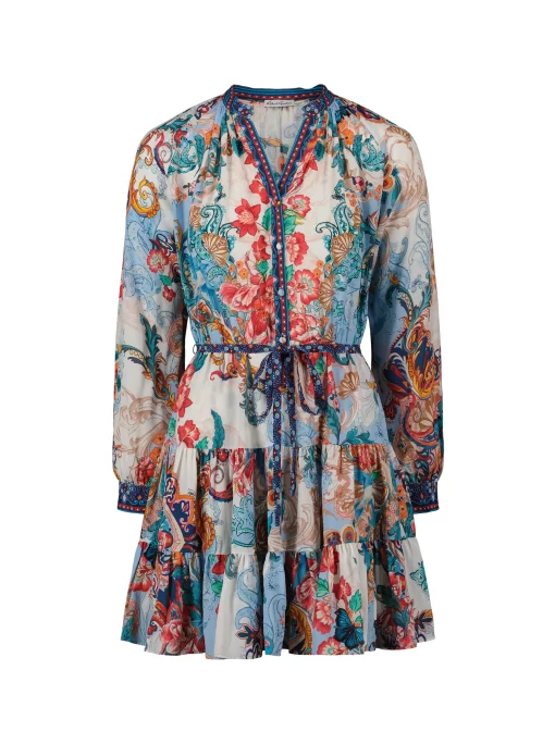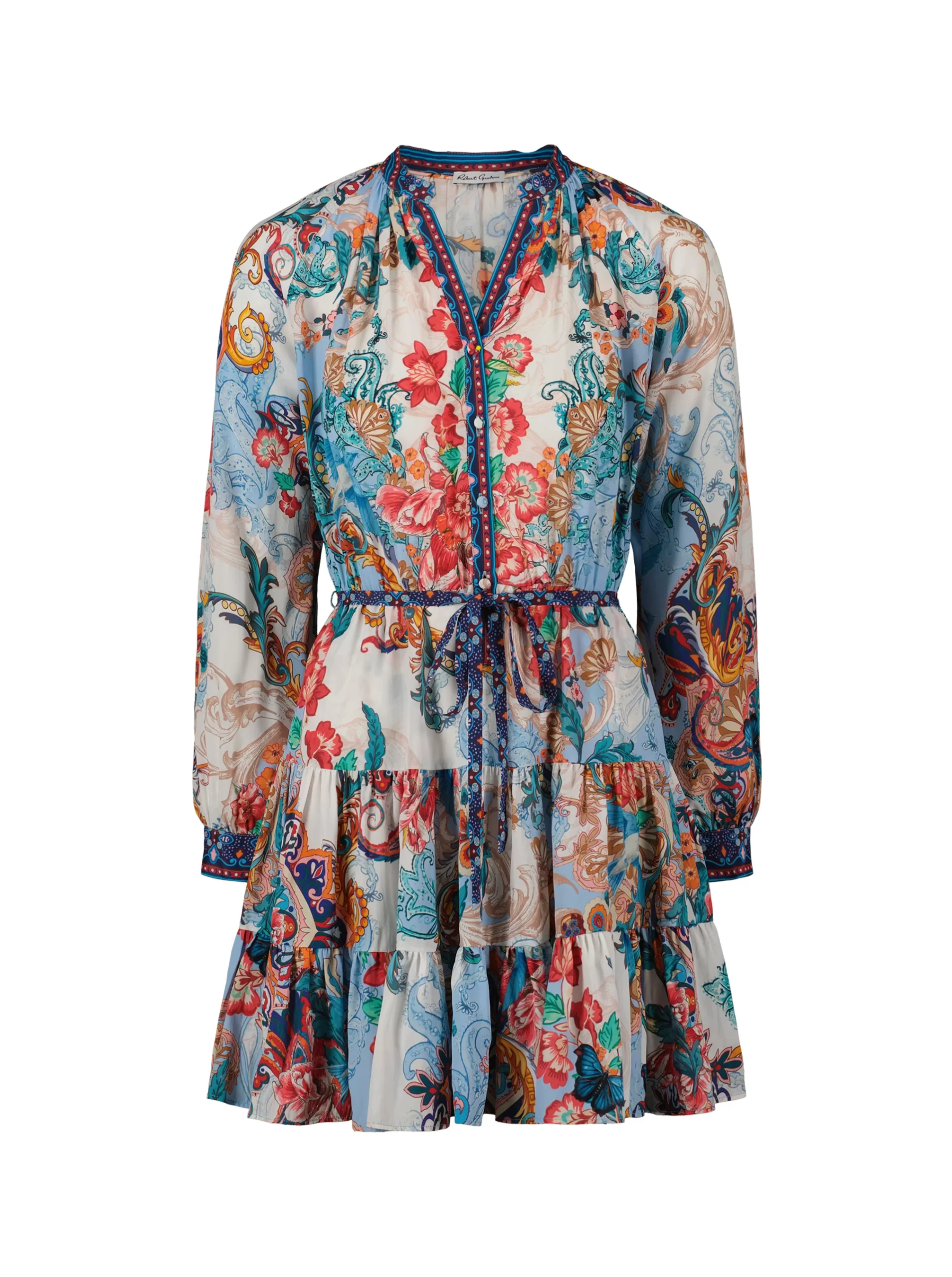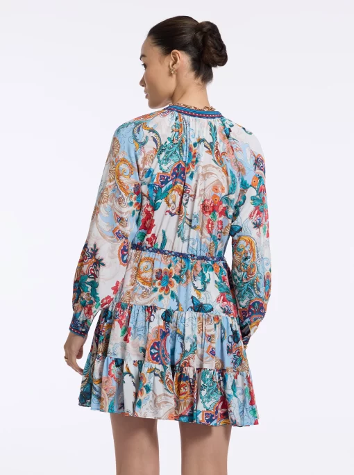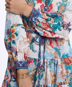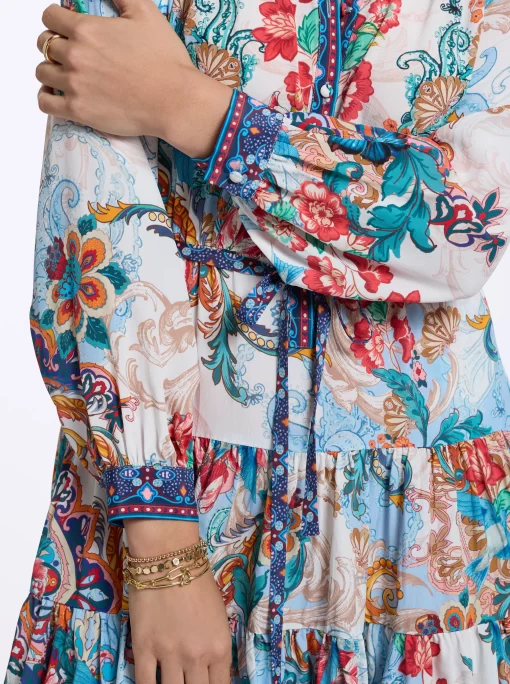 Throw on this flirty dress and get ready to turn heads all night. Beautiful florals bring life to this style, with geometric prints at the collar, placket, and cuffs adding a bit of interest. Gathered skirt tiers and blouson sleeves give you beautiful movement, while the self-tie belt keeps definition at the waist.